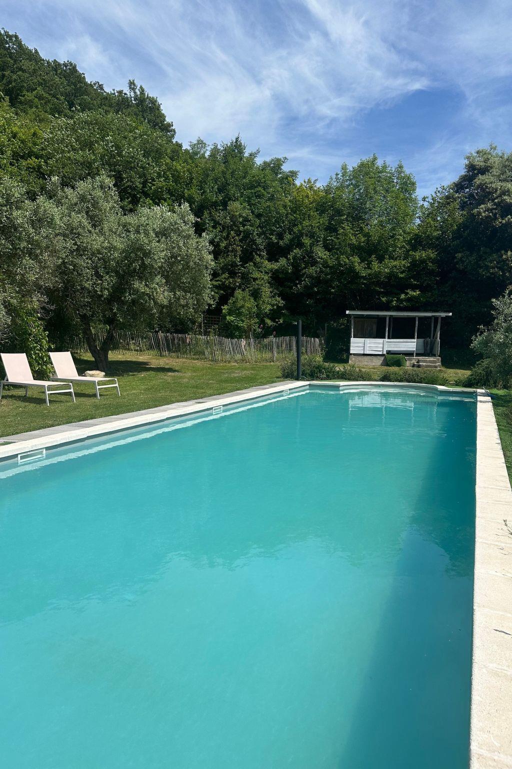 In the large enclosed grass garden (2000 m2) is a private saltwater pool (17 x 5 m depth 1.5 m) with underwater night lighting. The garden is directly accessible from the house with no level difference. You can enjoy the shade of some trees and the pergola and the children have space to play. Parking at the house.