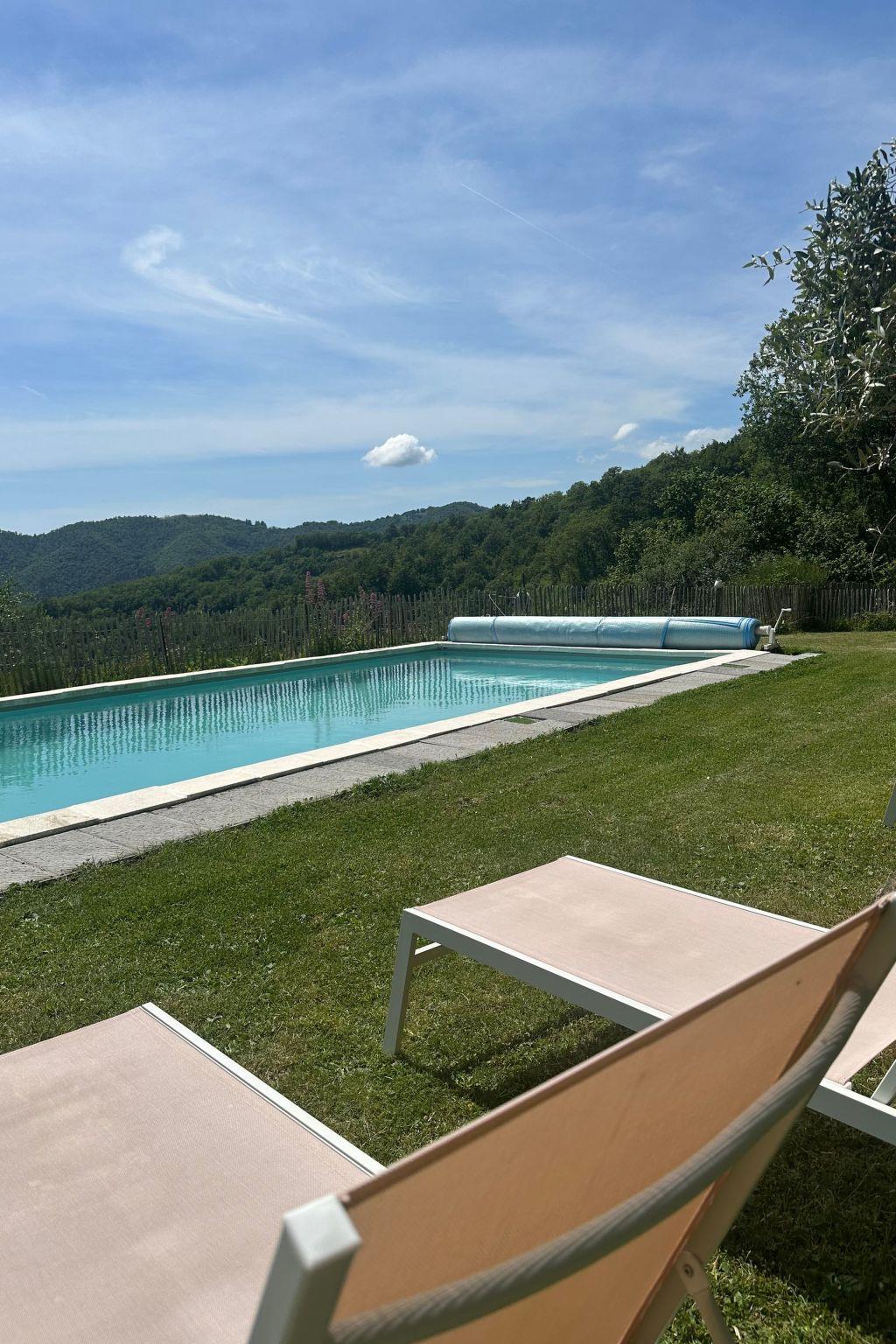 The country house is located in Tuscany but also shortly above the picturesque Ligurian coast with the Cinque Terre and Portovenere (world heritage site) and the wonderful golfo dei poeti, with its sandy beaches (half-hour drive) and islands. You can visit unique cities such as La Spezia, Lucca, Parma, Pisa, Genoa, Pietrasanta, Forte dei Marmi, Firenze, Milano, and many typical villages.Beautifully situated in the green countryside country house with private in-ground pool. Very spacious garden. Unobstructed views over valley and hills to the sea. Fully south-facing.