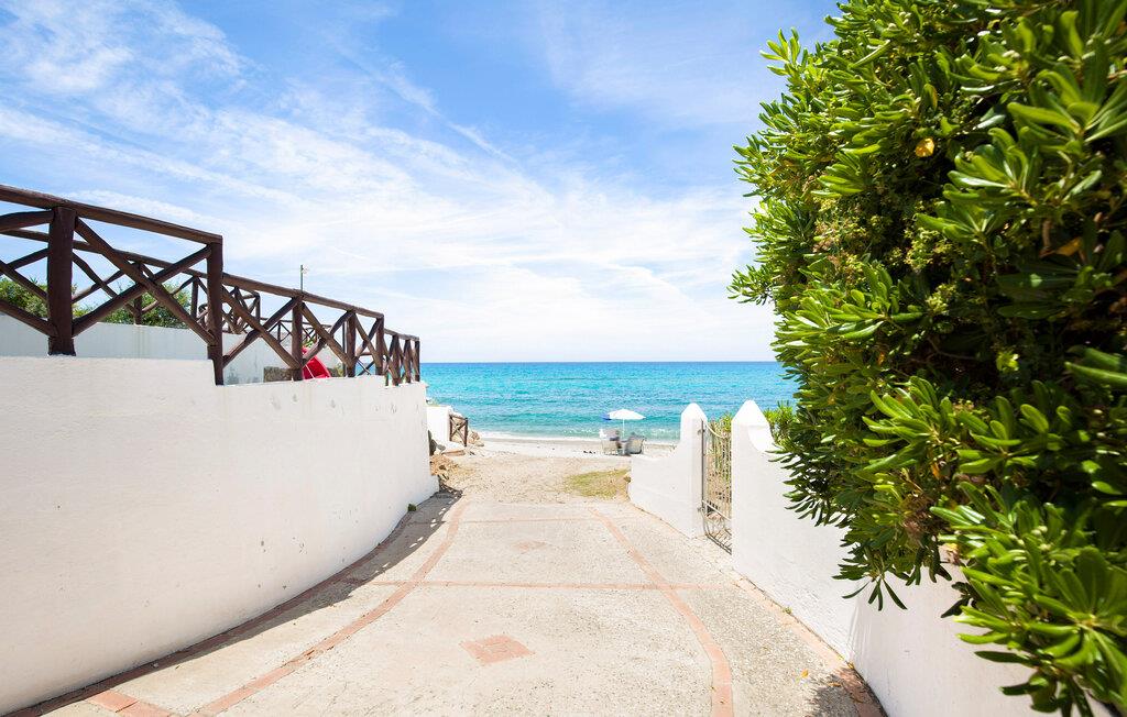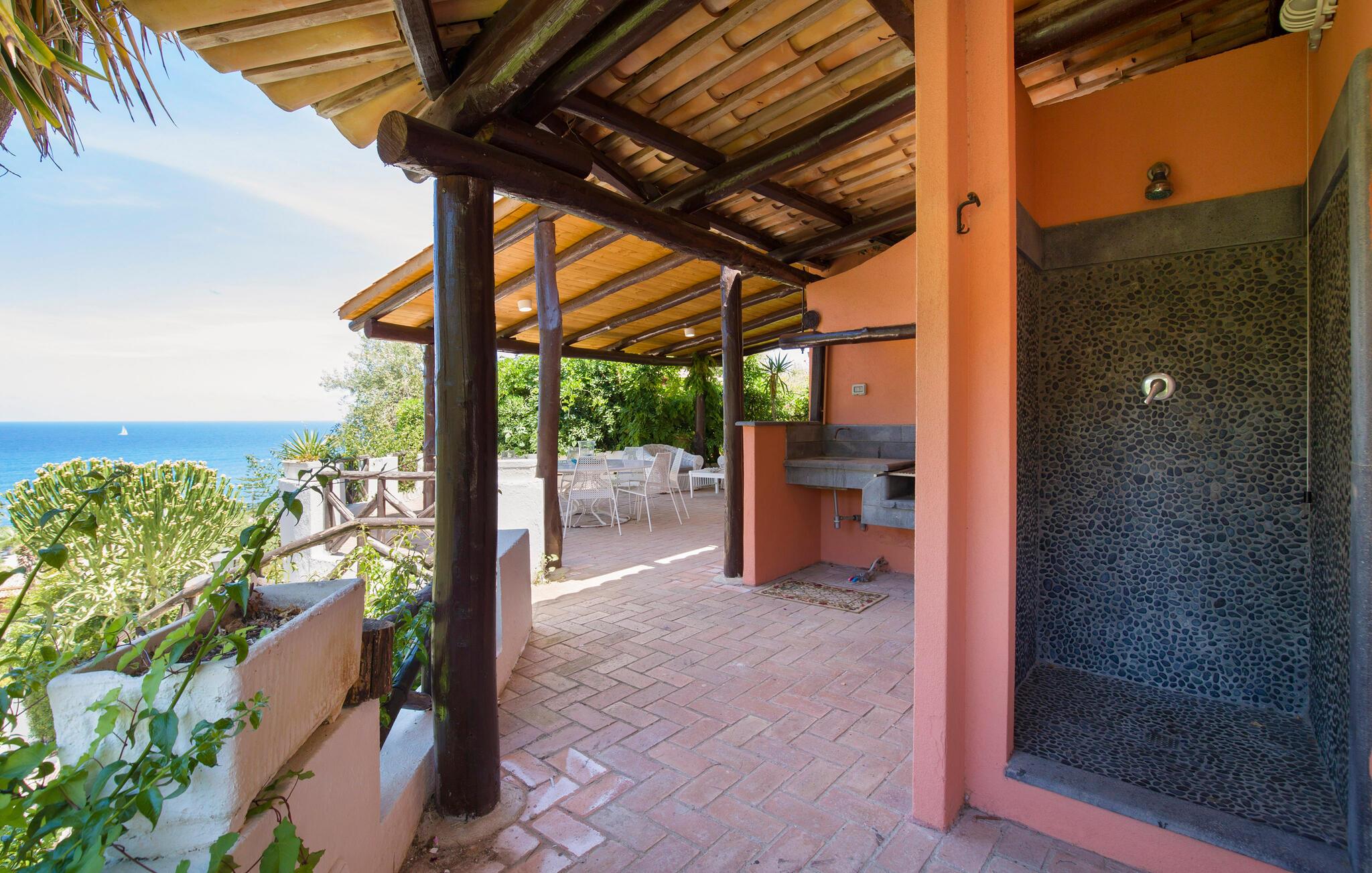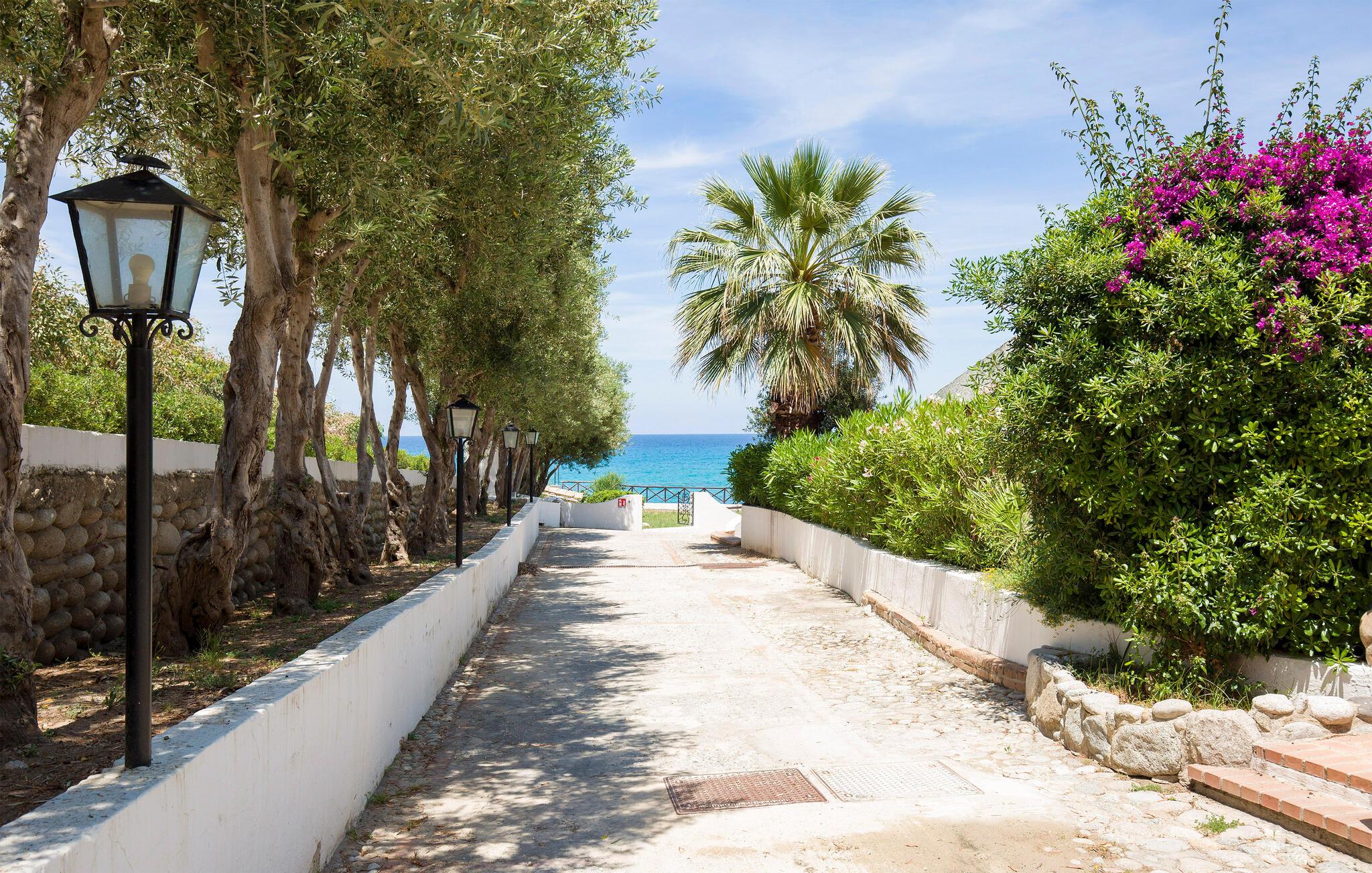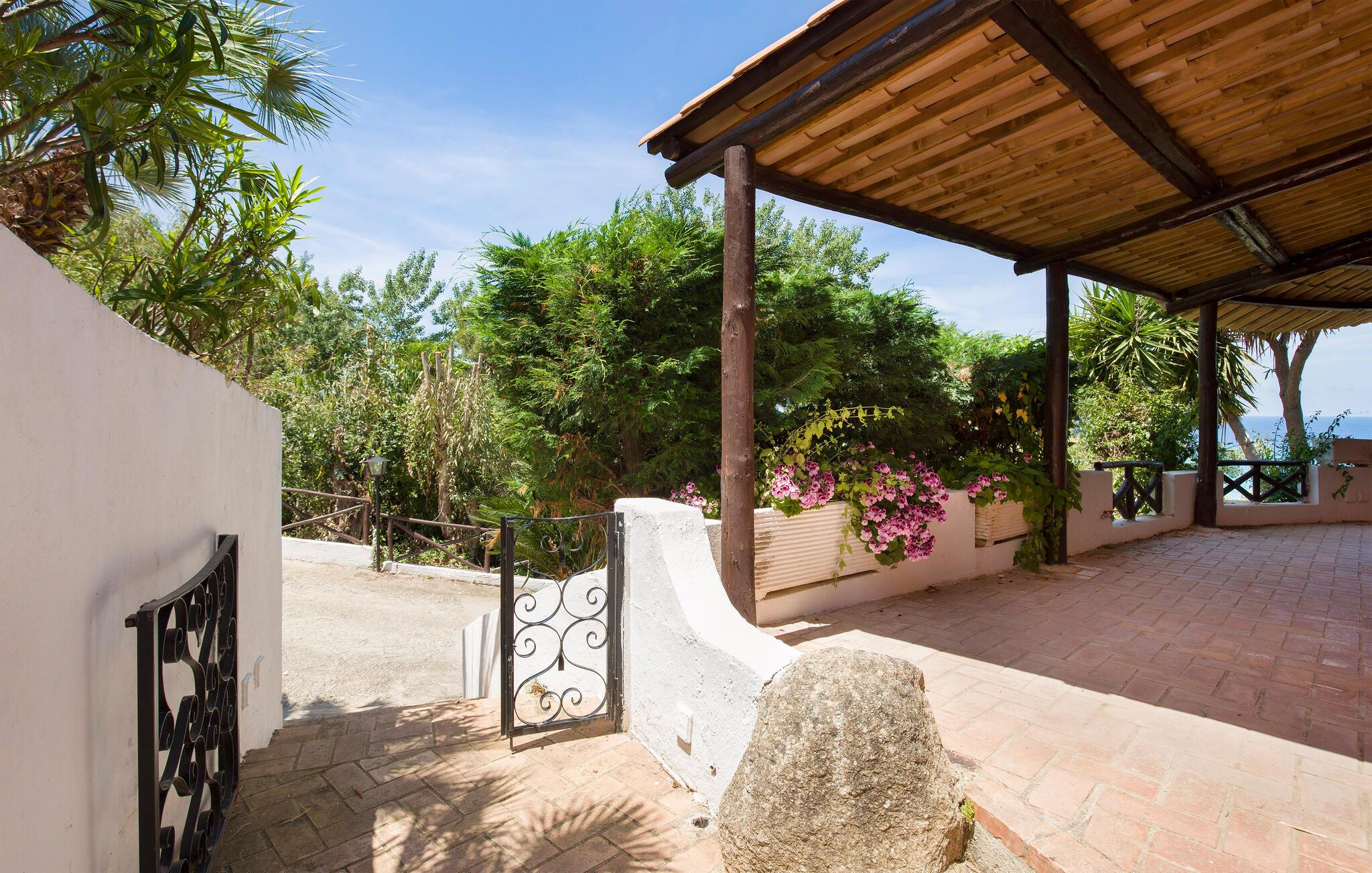 Feriehus i Parghelia, 3,5 km fra Tropea og 100 m fra havet. Huset ligger i et ferieområde med privat sandstrand, som egner sig godt til familier. Det lyse og indbydende hus består af tre soveværelser, to badeværelser, køkken og en stue. I har havudsigt fra den delvist overdækkede terrasse. I den kendte ferieby Tropea kan I svømme i det krystalklare vand, besøge valfartskirken Santa Maria dell'Isola eller smage den røgede pølse 'Nduja og andre delikatesser. Fra Tropea kan I sejle til de andre æoliske øer. Fra Leuchtturm i Capo Vaticano (15 km) kan man på skyfrie dage se til de fjerne øoliske øer. Capo Vaticano 15 km, Vibo Velentina 20 km.