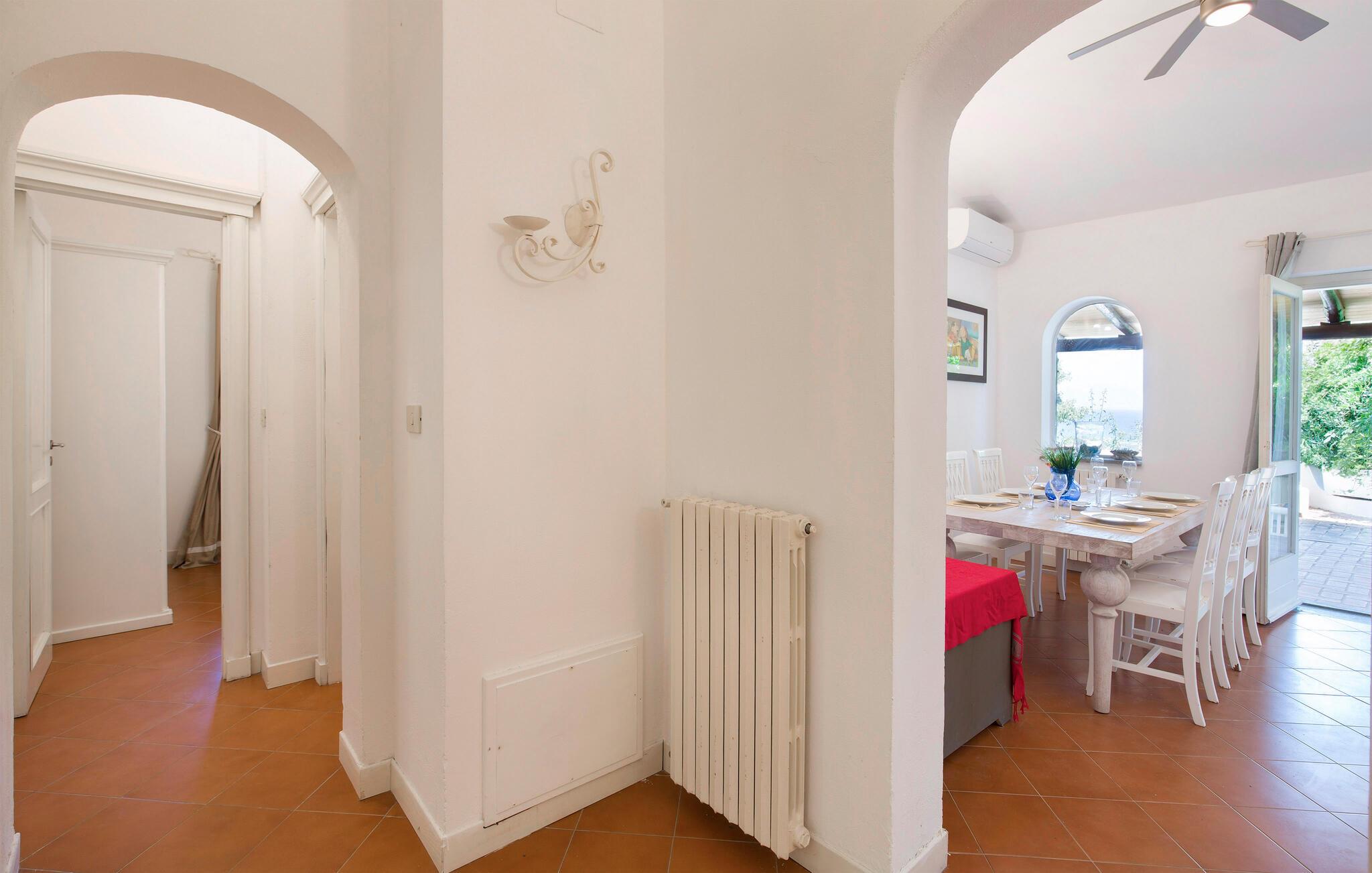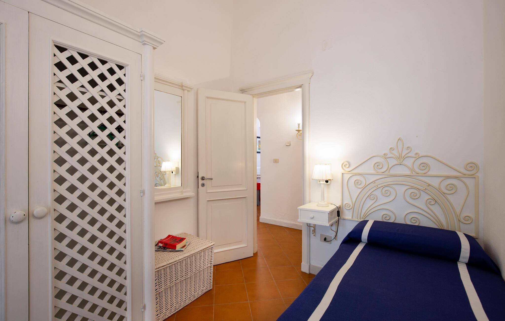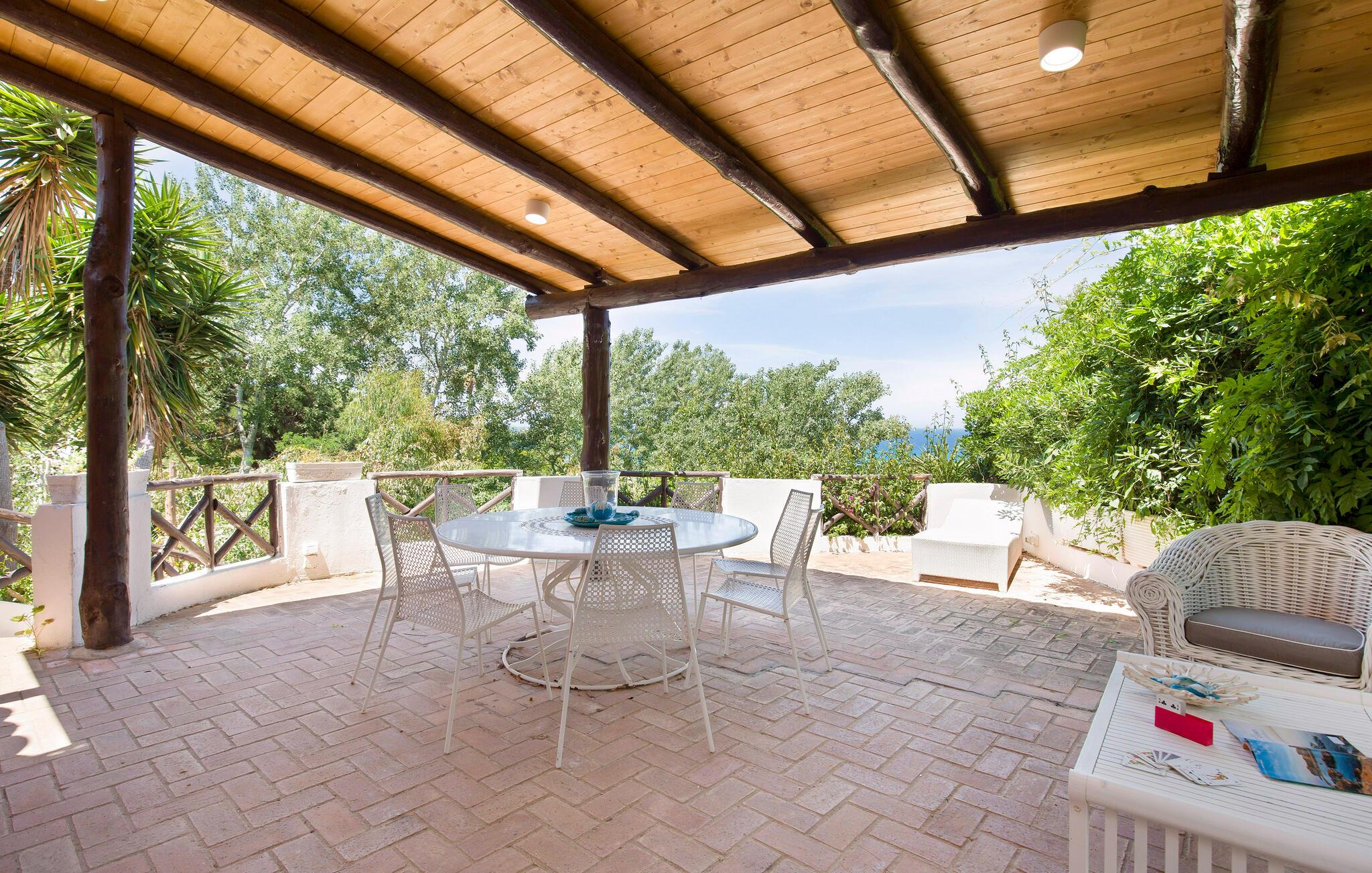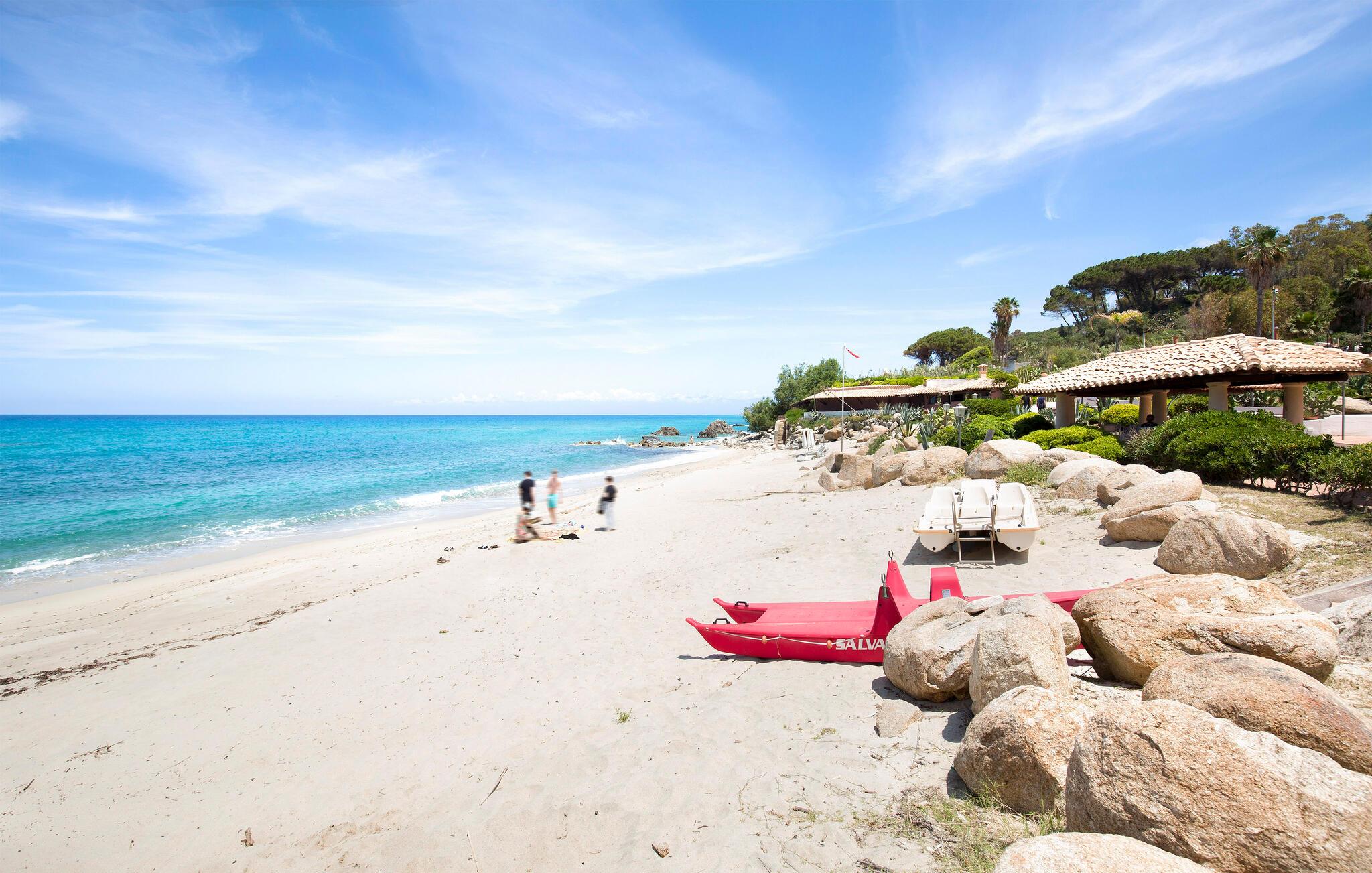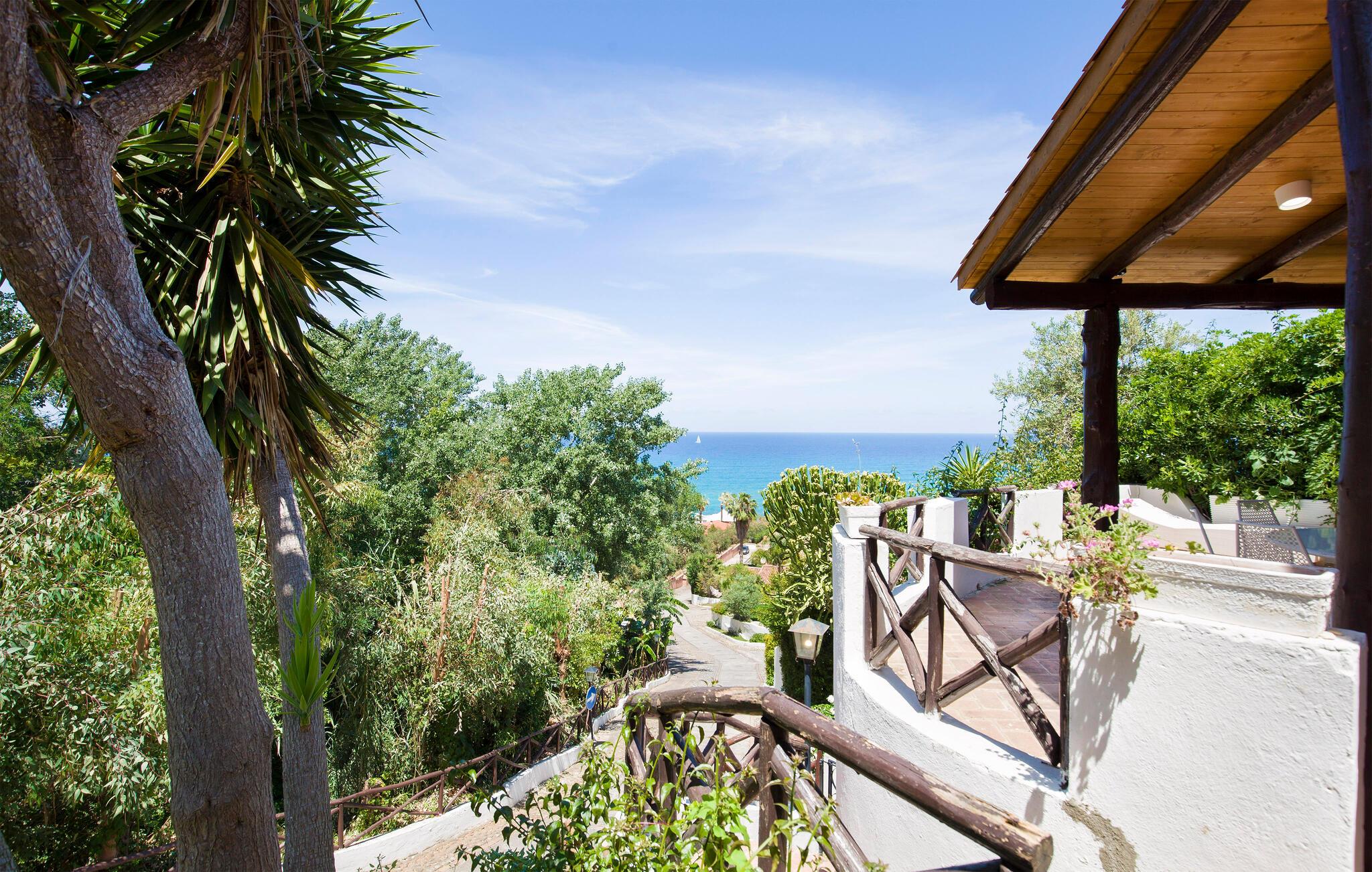 Feriehus i Parghelia, 3,5 km fra Tropea og 100 m fra havet. Huset ligger i et ferieområde med privat sandstrand, som egner sig godt til familier. Det lyse og indbydende hus består af tre soveværelser, to badeværelser, køkken og en stue. I har havudsigt fra den delvist overdækkede terrasse. I den kendte ferieby Tropea kan I svømme i det krystalklare vand, besøge valfartskirken Santa Maria dell'Isola eller smage den røgede pølse 'Nduja og andre delikatesser. Fra Tropea kan I sejle til de andre æoliske øer. Fra Leuchtturm i Capo Vaticano (15 km) kan man på skyfrie dage se til de fjerne øoliske øer. Capo Vaticano 15 km, Vibo Velentina 20 km.