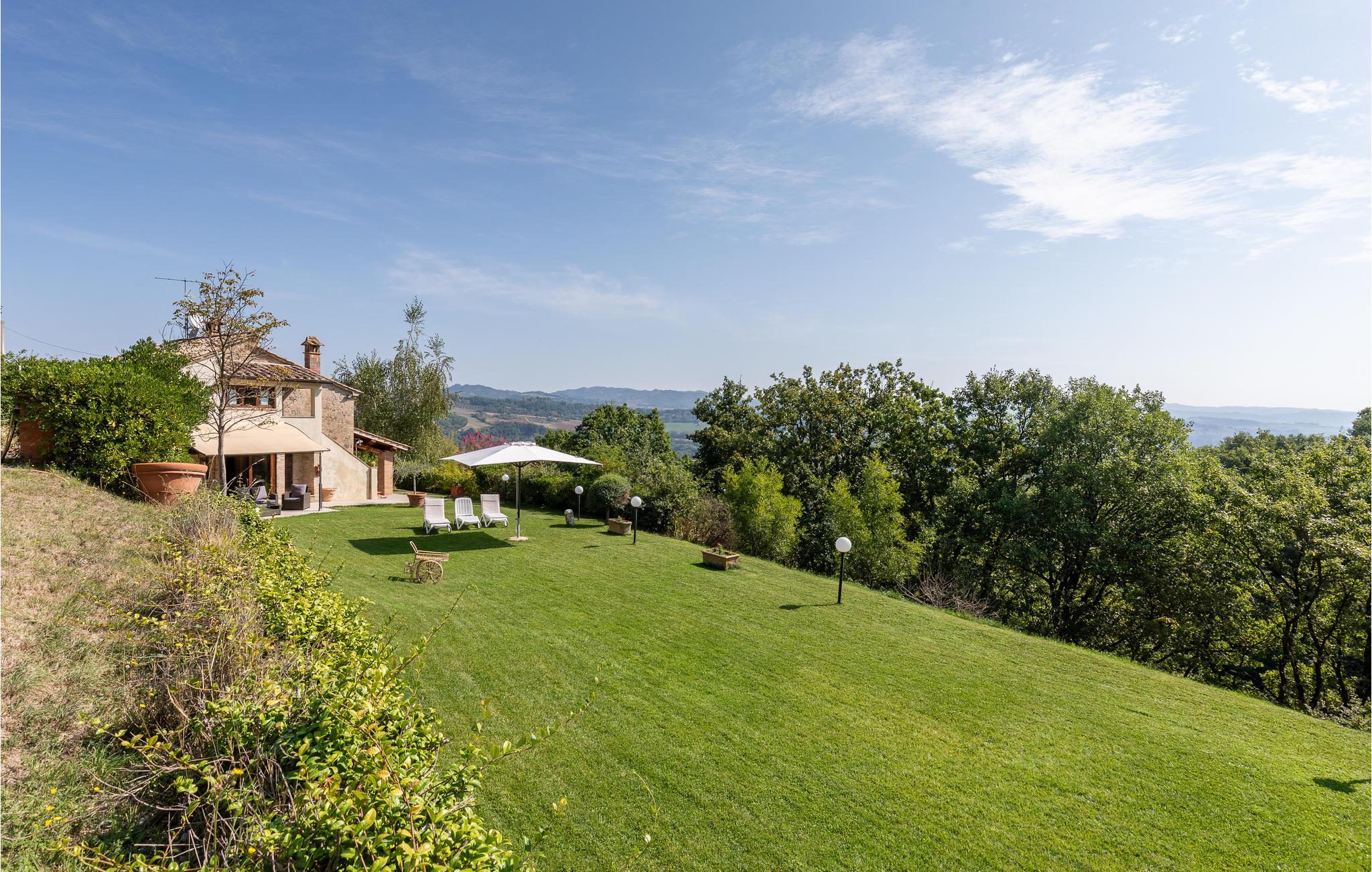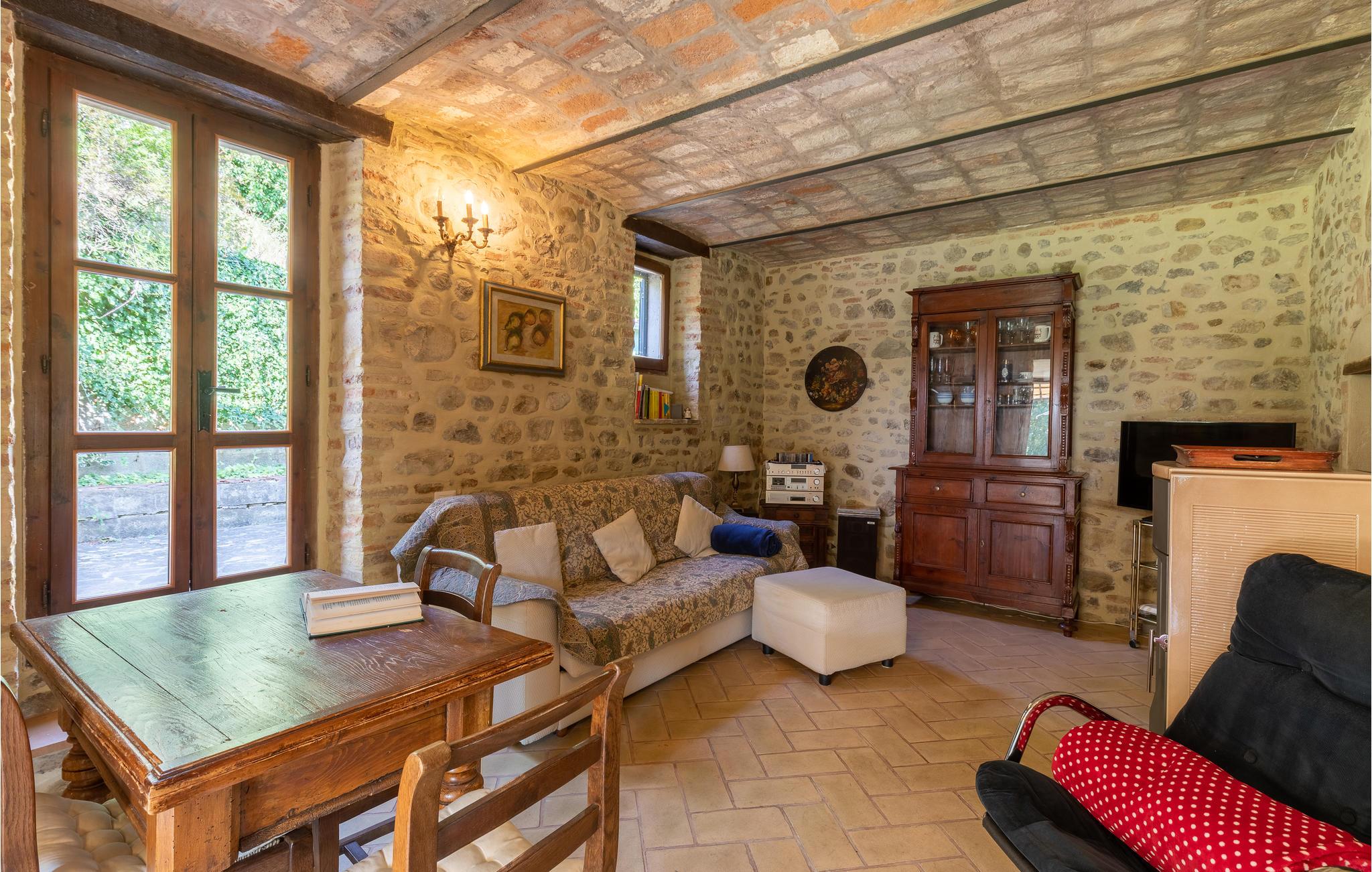Se frem til udsigten over den øverste Tiberdal, når I bor i dette skønne feriehus, der ligger i et bakkeområde. Fra stueplan er der indgang til den indbydende og lyse stue i åben forbindelse med det lille køkken, åben kamin og udgang til den overdækkede terrasse. På første sal (udedørs trappe med loggia) er der yderligere en stue med sovesofa, to soveværelser og et badeværelse. Foran huset er der en stor grund med havehus, omgivet af et blødt bakket landskab, helt ideelt til et afslappet ophold. Det tager under en time at køre til flere spændende Umbriske og Toscanske byer som Perugia, Assisi, Gubbio, Arezzo, Cortona (ca. 40-50 km) og Lago Trasimeno (30 km) med sandstrande og små øer. Til Umbertide med alle former for butikker, trattorier og ugemarkeder er der syv km, til den skønne by Montone 8 km og Città di Castello 20 km. Lille grusvej fører op til huset.