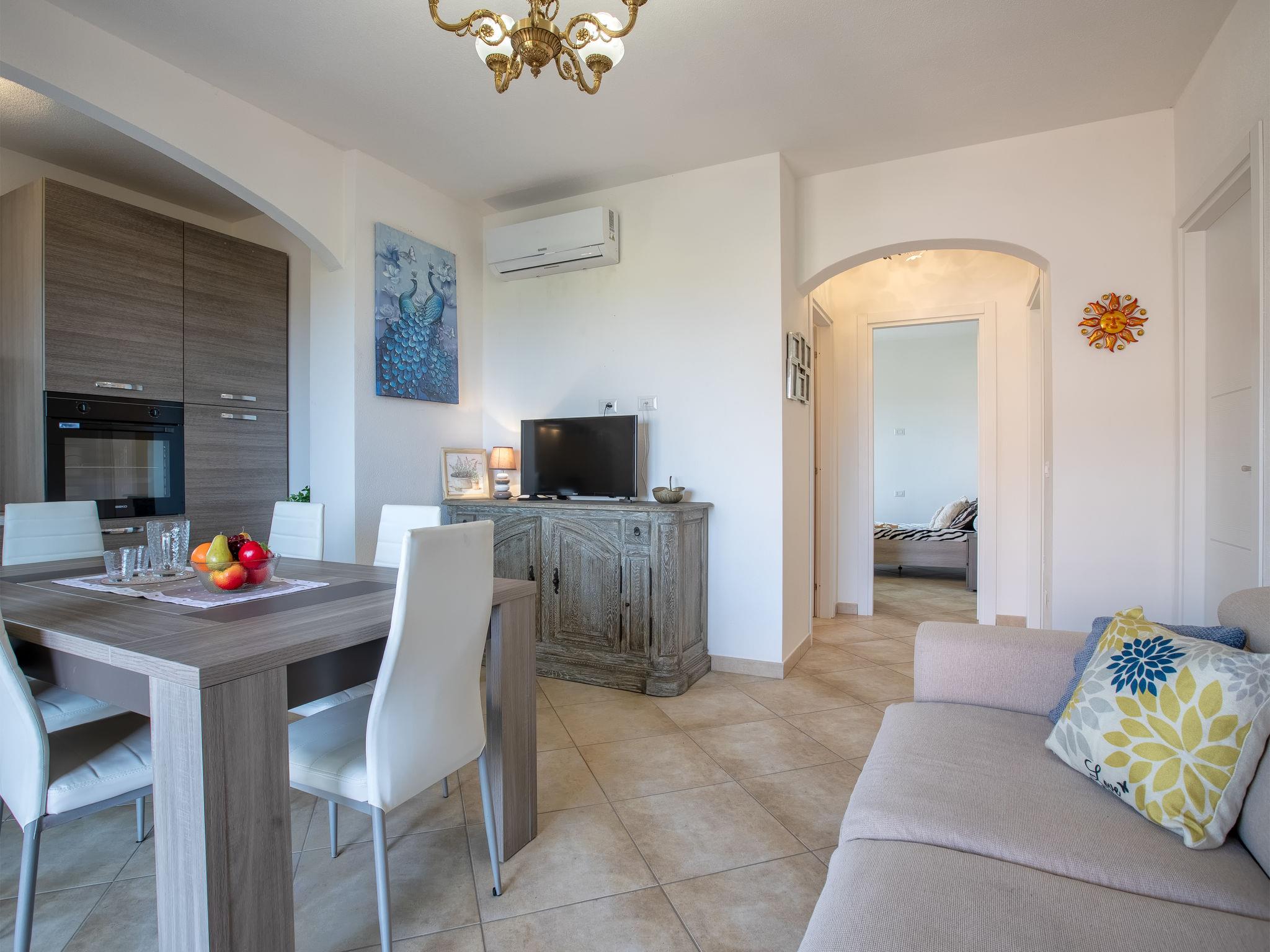 Cosy apartment block "Lo Smeraldo", 3 storeys, built in 2014. 17 houses in the residence. La Muddizza, 3.5 km from the centre of Valledoria, in a quiet, sunny position in the residential district, 2.3 km from the sea, 2.3 km from the beach. Stepped path (14 steps) to the house. Parking at the house. Supermarket 700 m, restaurant 350 m, bar 300 m, 7 minute walk to the centre, bus stop "linea 728" 700 m, sandy beach "San Pietro a Mare" 2.3 km. Tennis 2.3 km. Nearby attractions: Castelsardo 11 km, Stintino 78 km, Alghero 85 km, Olbia 87 km, Porto Torres 48 km, Costa Paradiso 30 km. Please note: car recommended, no lift.