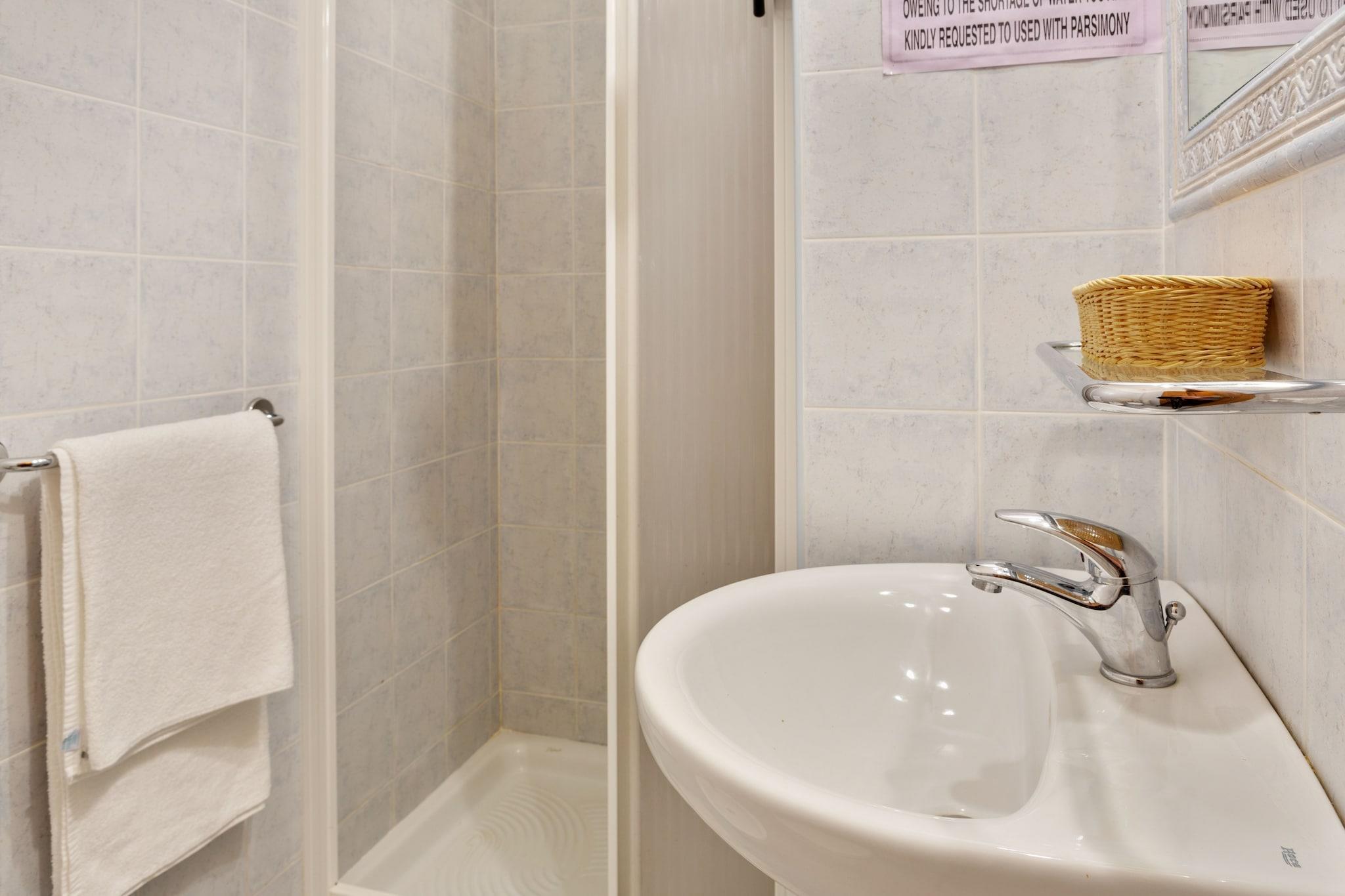 Stueetage: (køkken-alrum(terrasse), badeværelse(bruser, håndvask, toilet)) På 1. etage: (soveværelse(dobbeltseng, Fjernsyn(parabol), balkon)) varme(central, gas), have(deles med andre gæster), havemøbler, parkering
