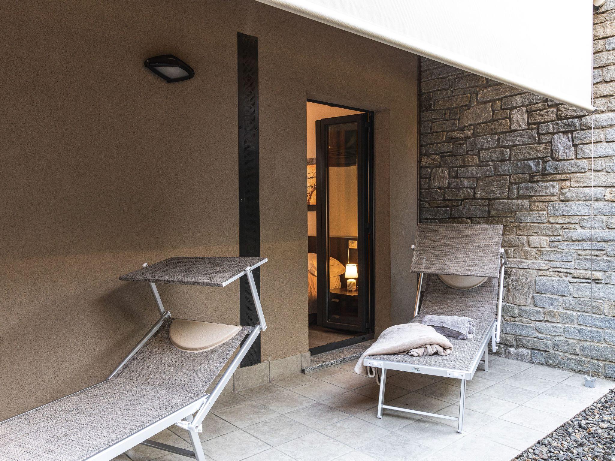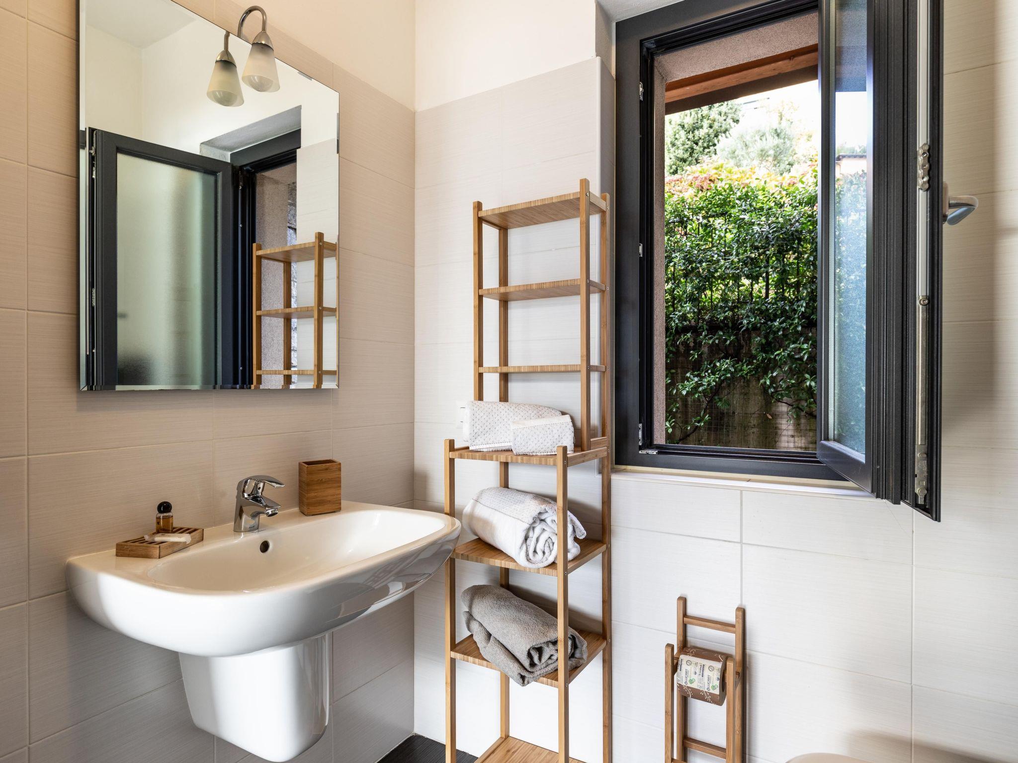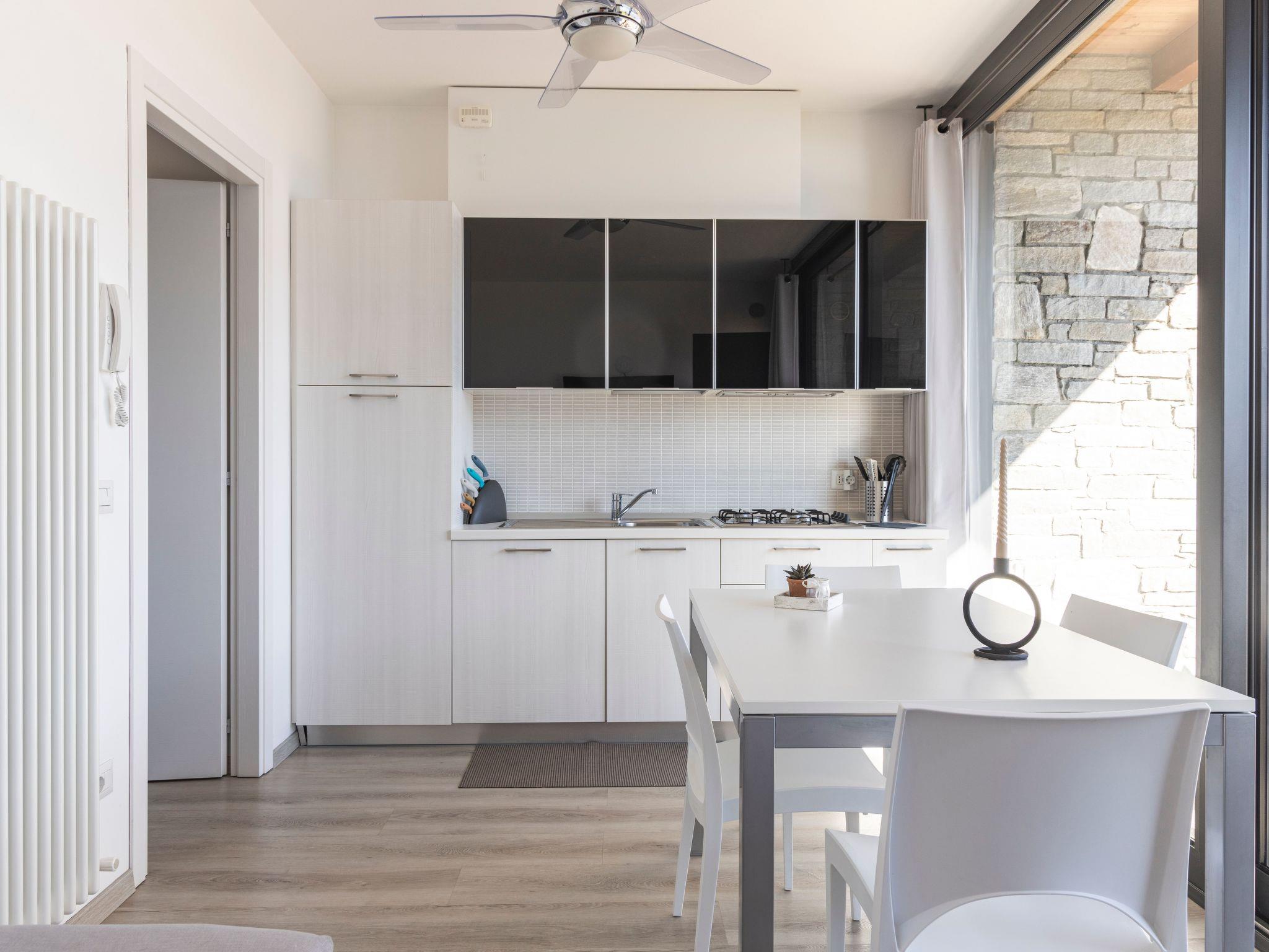 The flat is situated on the ground floor, with direct access to the garden and swimming pool. The large living room with kitchenette opens onto the porch equipped with table and chairs; behind it is the sleeping area consisting of a bedroom with double bed, wardrobe and bathroom with shower. It is possible to accommodate up to three adults, taking advantage of the comfortable sofa bed in the living room.