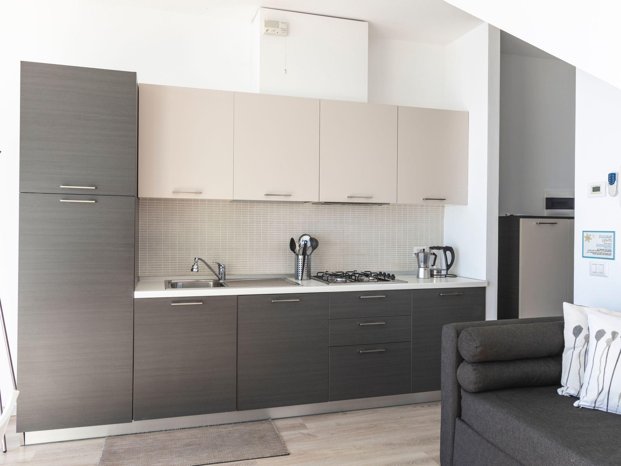 The apartment is located on the first floor of the building and spread over two levels. The ground floor has the daytime area with a big living room, an open kitchen and a dining space, with direct access to a sunny terrace overlooking the garden and the pool further down. One of the two bathrooms is also on this floor. The night-time area is on the upper floor, where there are two beedrooms, one with a double bed and the other with a double bed and a single bed, as well as the second bathroom of the apartment. Owing to the comfortable double sofa bed in the living room, up to six adults can be accommodated.