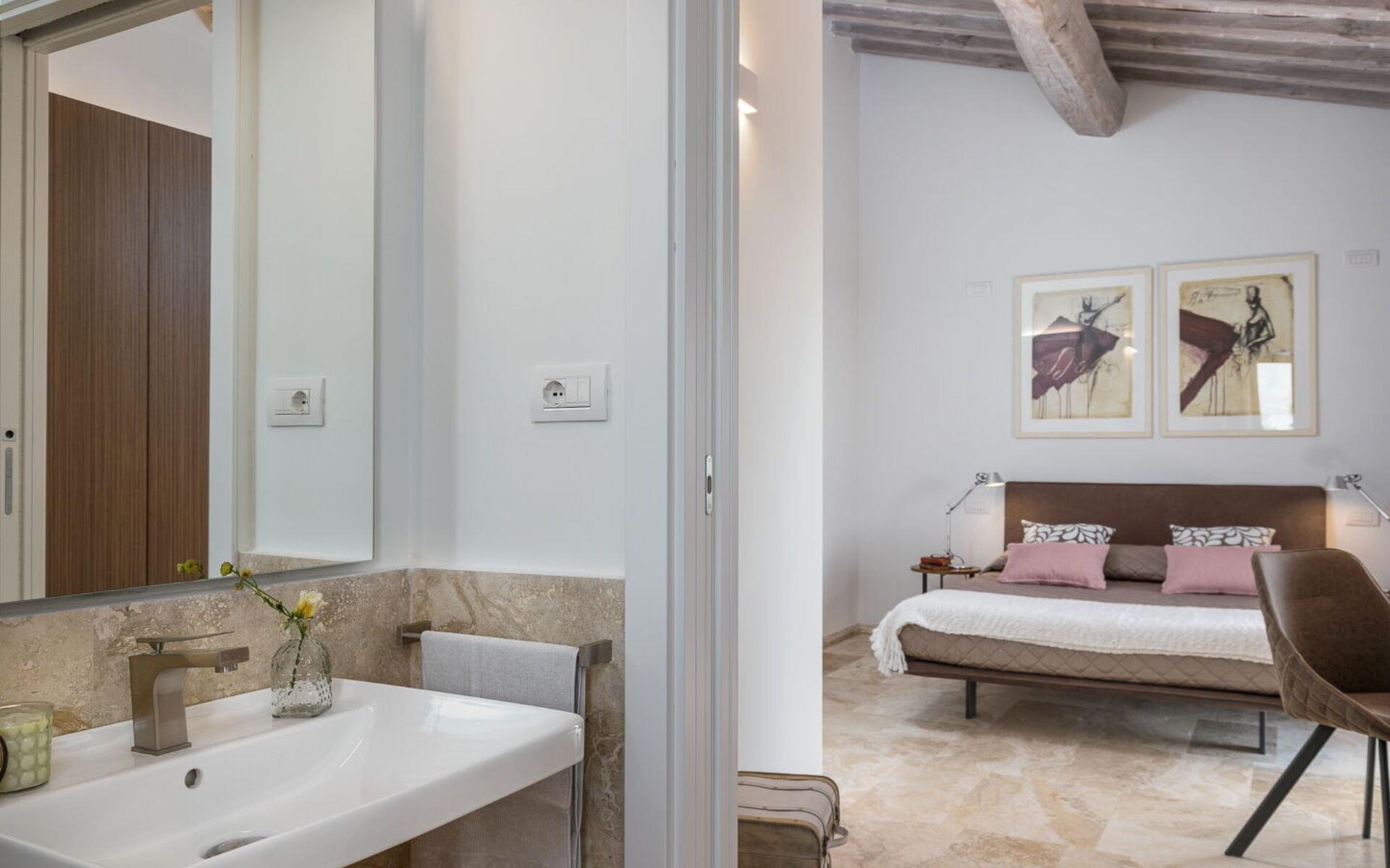 Der Schlafbereich der Villa Fibbiano besteht aus 3 Doppelschlafzimmern, alle mit eigenem Bad mit Dusche. Die ersten beiden Schlafzimmer befinden sich im Erdgeschoss und blicken direkt auf den Garten, während das dritte eine große Suite ist, die sich im ersten Stock befindet und einen herrlichen Blick auf die Landschaft bietet. Die Suite hat auch ein privates Wohnzimmer im Erdgeschoss.