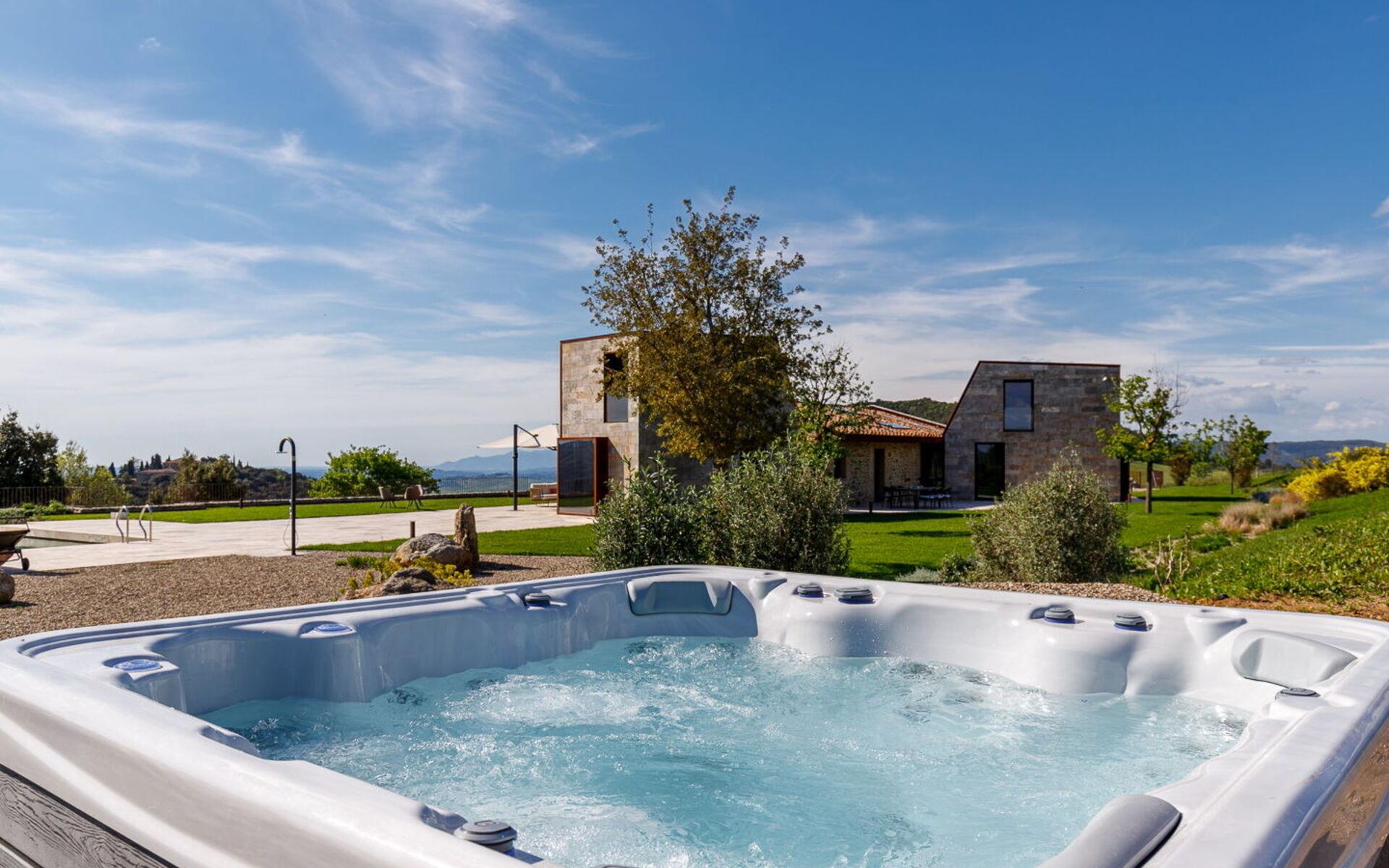 Der schöne Infinity-Pool (7 x 14 Meter - maximale Höhe 1,60 Meter, minimale Höhe 0,80 Meter - ganzjährig geöffnet - auf Anfrage gegen Aufpreis beheizt) ist den ganzen Tag über der Sonne ausgesetzt und mit Liegestühlen und Sonnenschirmen ausgestattet. Wenige Schritte davon entfernt befindet sich ein Wellnessbereich mit einem Jacuzzi-Pool, der Sie ganz in die Atmosphäre dieser herrlichen Struktur und die Essenz der umliegenden Natur eintauchen lässt.