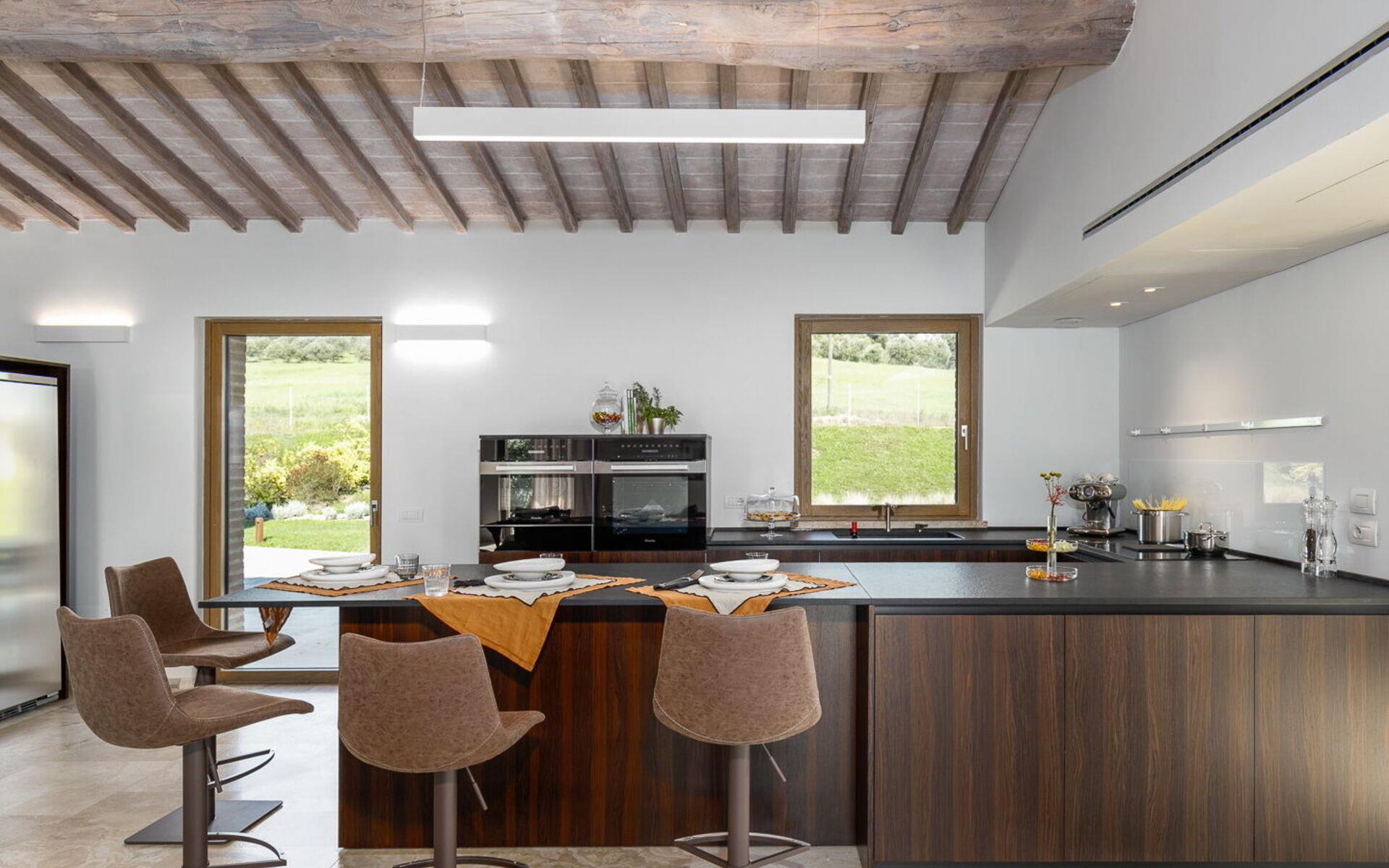 Der Wohnbereich ist das Herzstück der Unterkunft: Er ist mit einem offenen Raumkonzept konzipiert und besteht aus einem Panorama-Esszimmer, das mit einem Glasfenster ausgestattet ist, um dank des Blicks auf das Schwimmbad einen Effekt der Kontinuität mit dem Garten zu schaffen. Das Esszimmer schließt sich direkt an das Wohnzimmer an, das mit einem großen Sofa, Satellitenfernsehen, einem modernen Kamin und der offenen Küche ausgestattet ist, die sehr elegant und mit hochwertigen Materialien gebaut wurde, über eine Halbinsel verfügt und mit allem ausgestattet ist, was man für die Zubereitung seiner Lieblingsrezepte braucht.