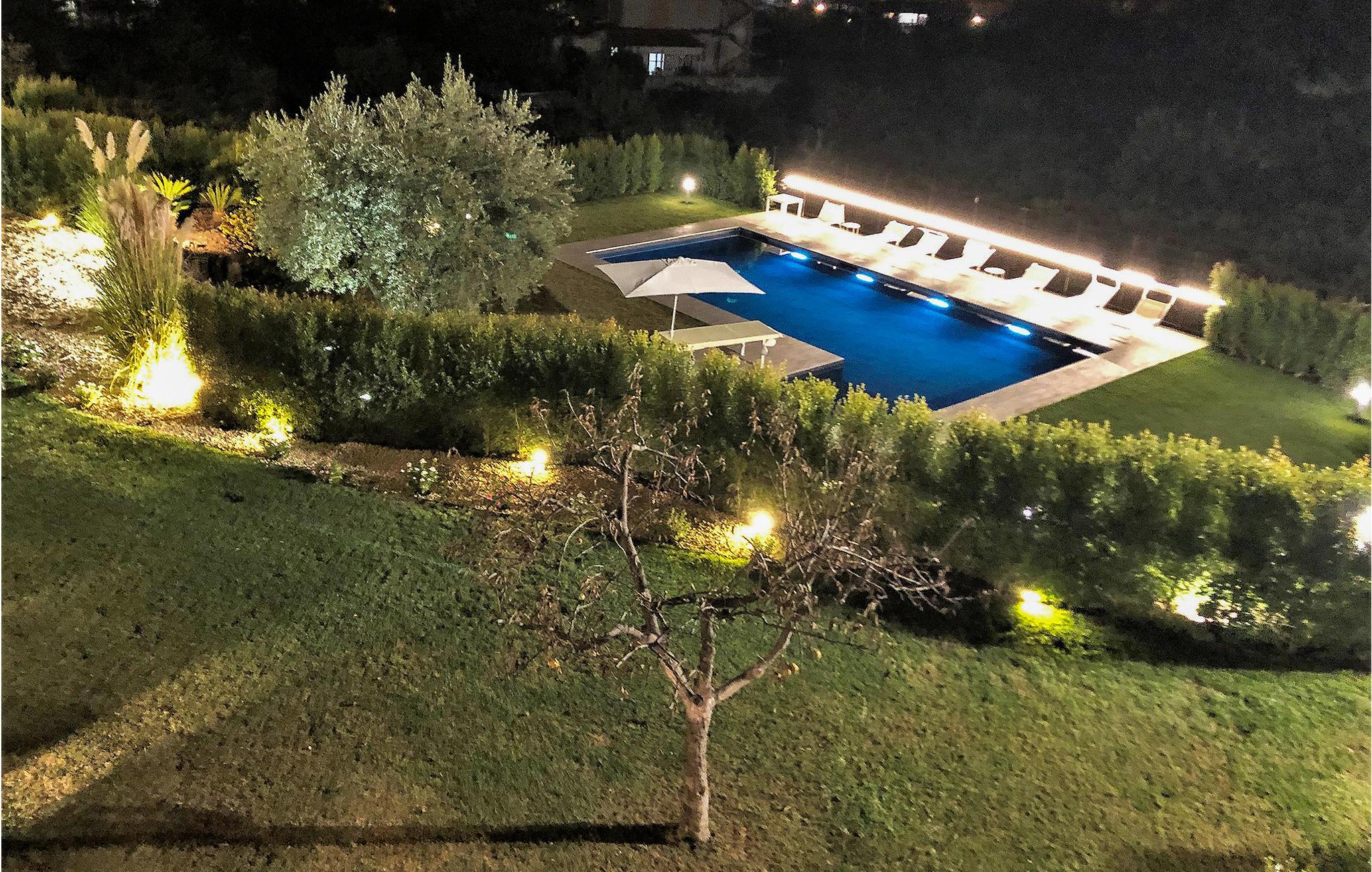 Huset ligger på en kæmpe grund med græsplæner, træer, vinmarker og mange hyggekroge. Tilbring skønne timer med at plaske rundt i den store, private pool og suge solen til jer. Om aftenen kan I lade dagen gå på hæld med et glas lokal vin, mens I nyder den fortryllende udsigt over fjeldene.