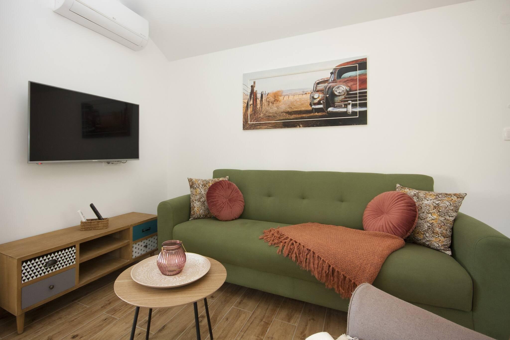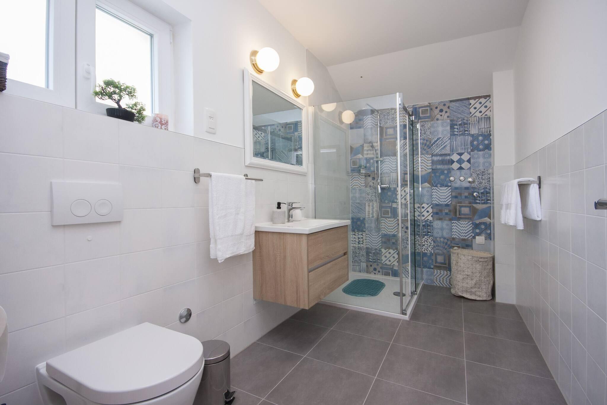 Denne moderne og hyggelige 48 kvadratmeter store lejlighed i Šibenik-Brodarica er det perfekte tilflugtssted for familier eller par med plads til op til 3 gæster. Lejligheden har en komfortabel queen-size seng og en praktisk sovesofa til yderligere gæster. Gæsterne kan nyde den smukke havudsigt fra balkonen, som er udstyret med udendørsmøbler og et grillområde, ideelt til udendørs spisning. Den fælles swimmingpool, der måler 3,5x6 meter, giver et forfriskende rum til afslapning. Yderligere faciliteter omfatter aircondition, WiFi og fladskærms-satellit-tv. Lejligheden er beliggende på en indhegnet grund, hvilket sikrer privatliv og en fredelig atmosfære. Kæledyr er ikke tilladt, og rygning er kun tilladt udenfor. Beliggende kun 850 meter fra både sand- og klippestrande, tilbyder lejligheden nem adgang til den uberørte Adriaterhavskyst. Gæsterne kan udforske lokale attraktioner, herunder den historiske Šibenik gamle bydel, som ligger 9 km derfra. I nærheden finder du et supermarked inden for 1 km og den lokale Konoba Dalmare restaurant, der tilbyder lækre kroatiske retter. For udendørsentusiaster er to cykler tilgængelige til brug, og ejendommen er bekvemt placeret for dagsture til de omkringliggende områder. Split Lufthavn ligger omkring 55 km væk, hvilket giver praktiske rejsemuligheder. Lejligheden har et fuldt udstyret køkken i amerikansk stil, komplet med induktionstilberedning, en opvaskemaskine, ovn, kaffemaskine og alt nødvendigt køkkenudstyr til at tilberede måltider. Boligområdet omfatter også en spiseplads og væsentlige faciliteter såsom et førstehjælpskasse og rengøringsmidler.
