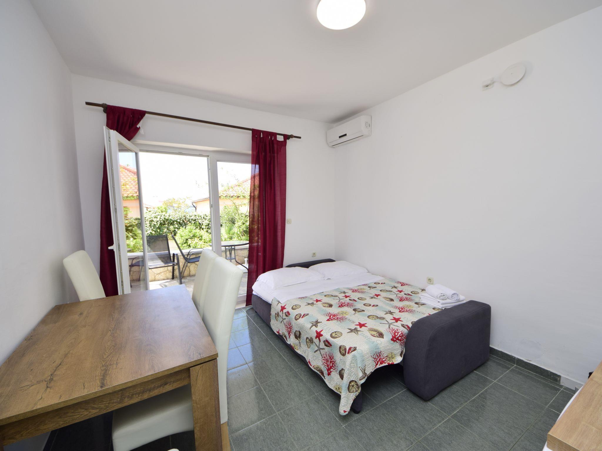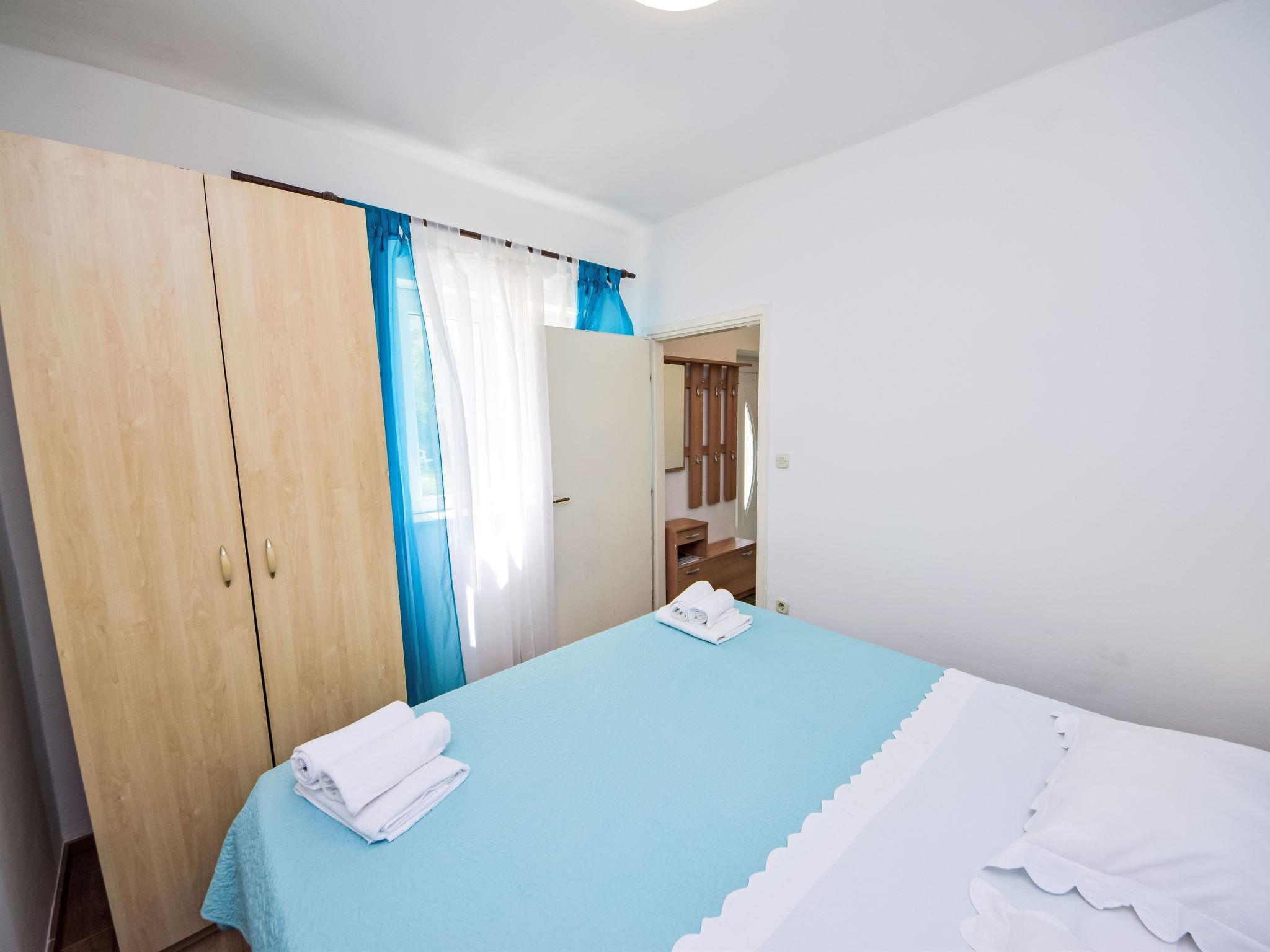 "Katarina 1", 2-room apartment 40 m2, on the upper ground floor. Living/dining room with 1 double sofabed (150 cm, length 200 cm), satellite TV (flat screen), air conditioning. Exit to the terrace. 1 room with 1 french bed (180 cm, length 200 cm). Open kitchen (2 ceramic glass hob hotplates, toaster, kettle, microwave, electric coffee machine). Shower/WC. No heating option. Terrace roofed. Terrace furniture. Facilities: Internet (WiFi, free). Parking (1 car). Please note: private entrance.