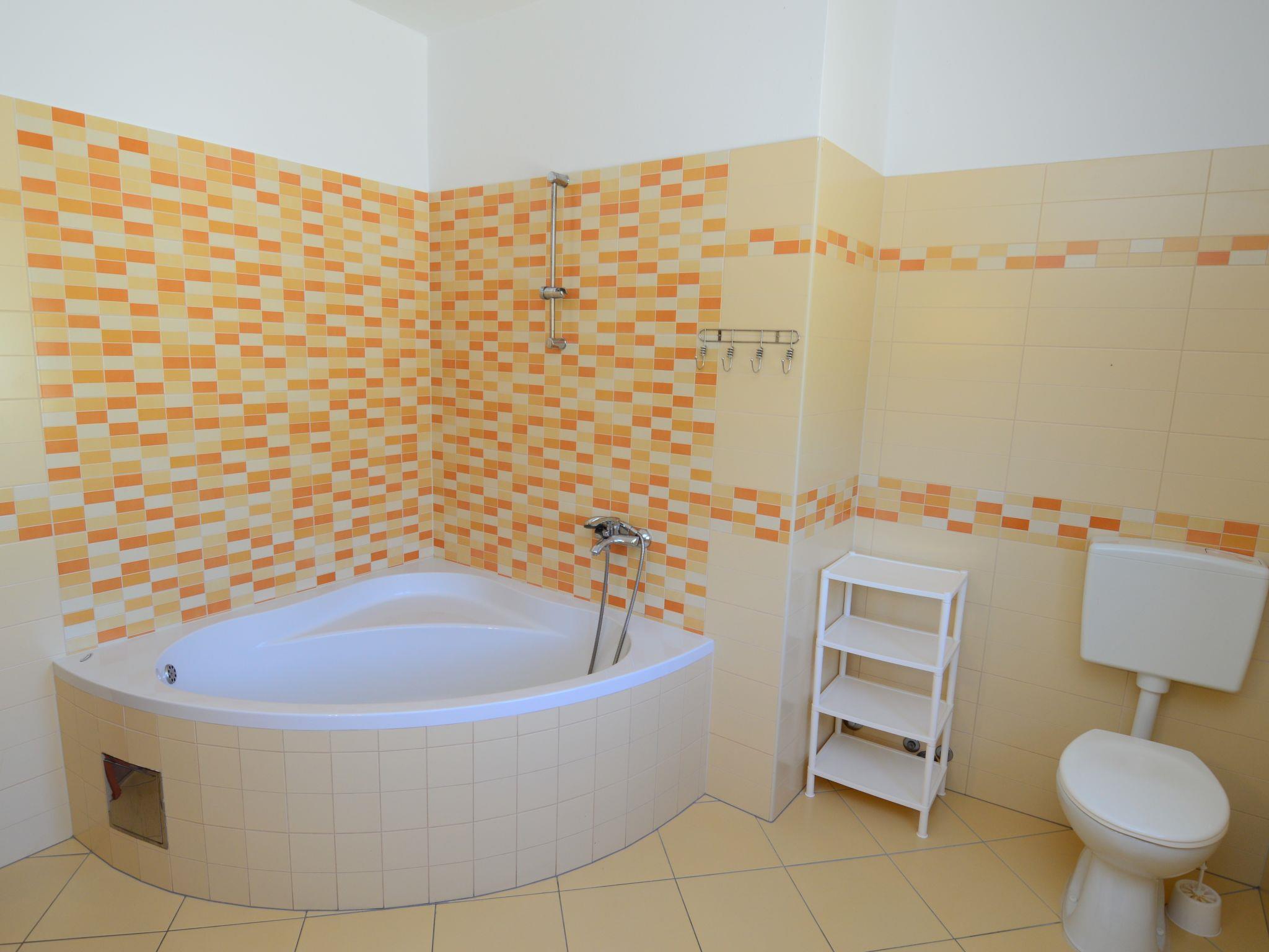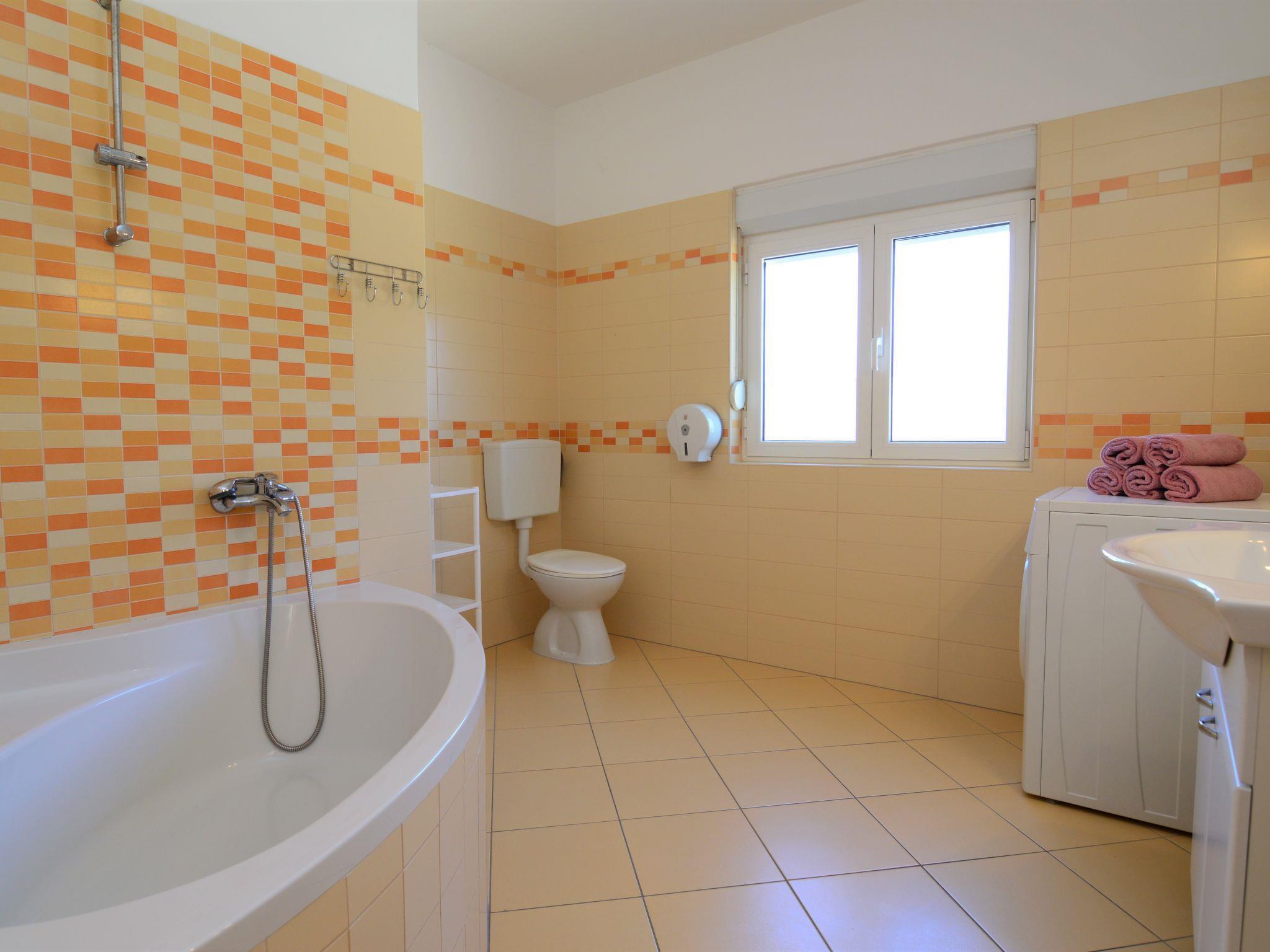 5-room apartment 85 m2 on 1st floor. Entrance hall with air conditioning. 1 room with 1 bed and 1 double bed. 1 room with 2 beds. 1 room with 2 beds. 1 room with 1 french bed. Kitchen-/living room (dishwasher, 4 ceramic glass hob hotplates, toaster, kettle, microwave, electric coffee machine) with dining table, satellite TV. Exit to the balcony. Bath/WC, shower/WC. Forced-air heating. Balcony 25 m2. Balcony furniture. View of the sea. Facilities: washing machine. Internet (WiFi, free). Please note: non-smoking house.