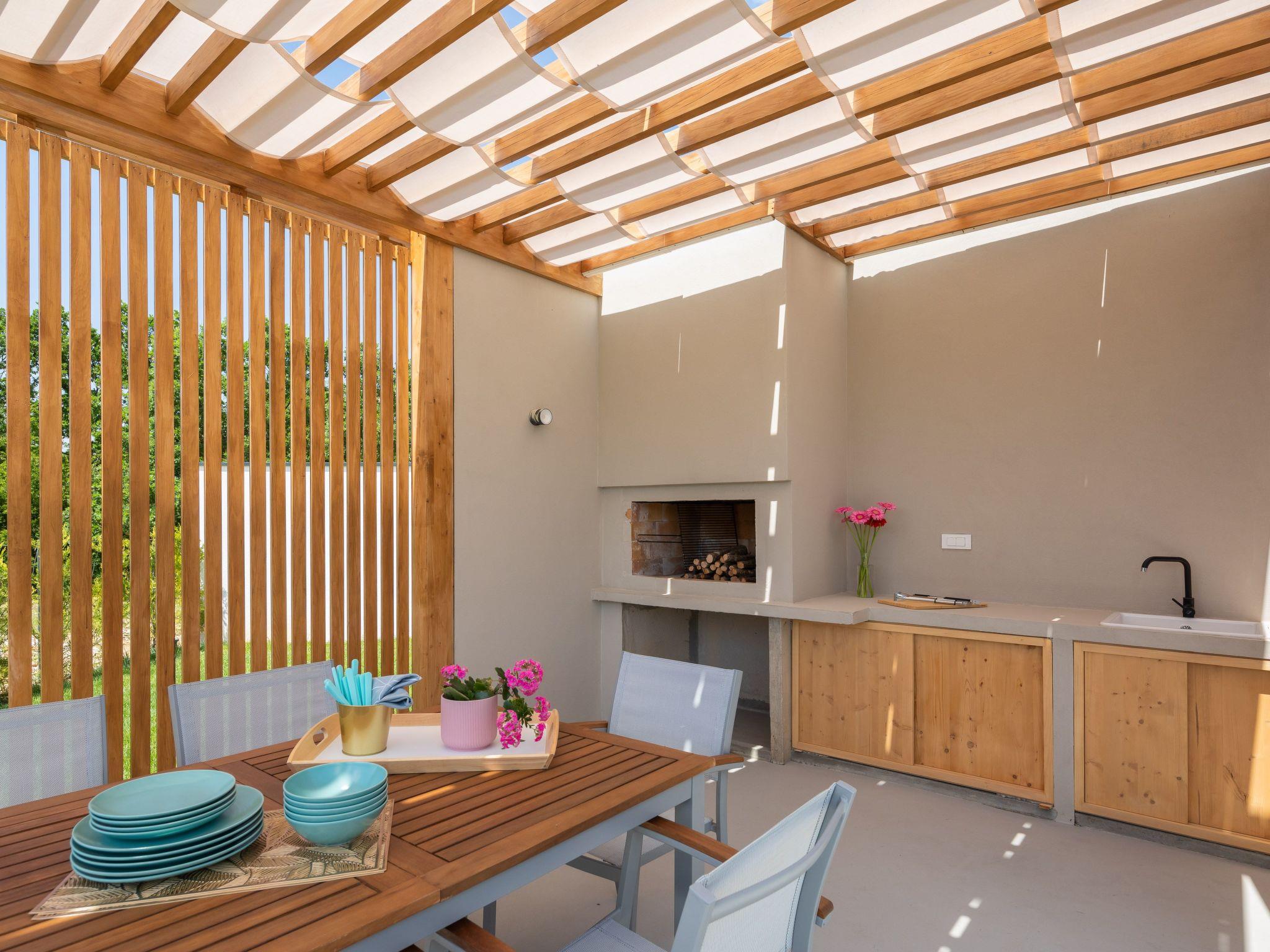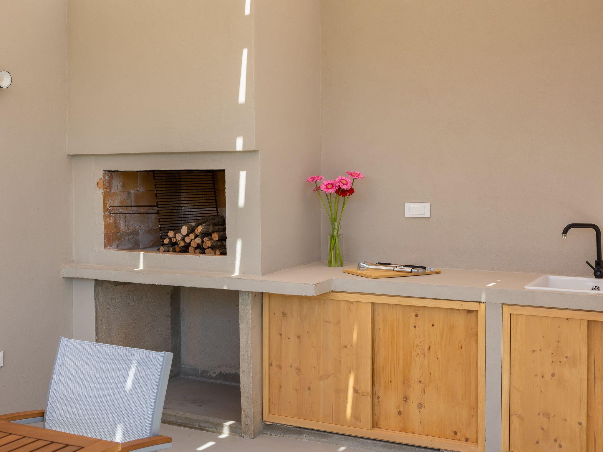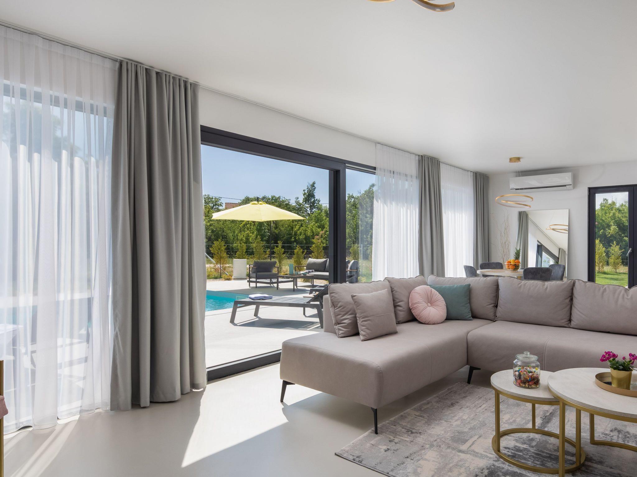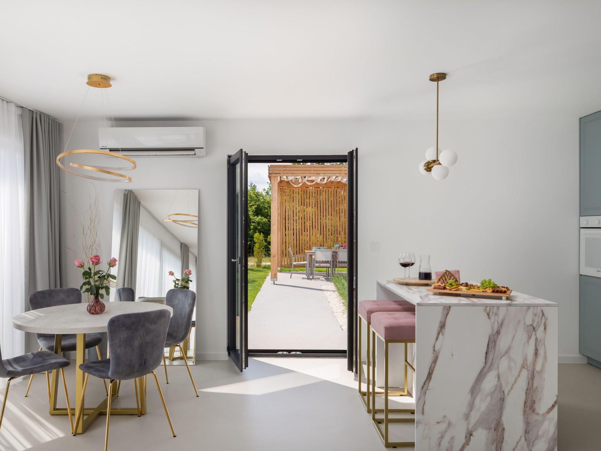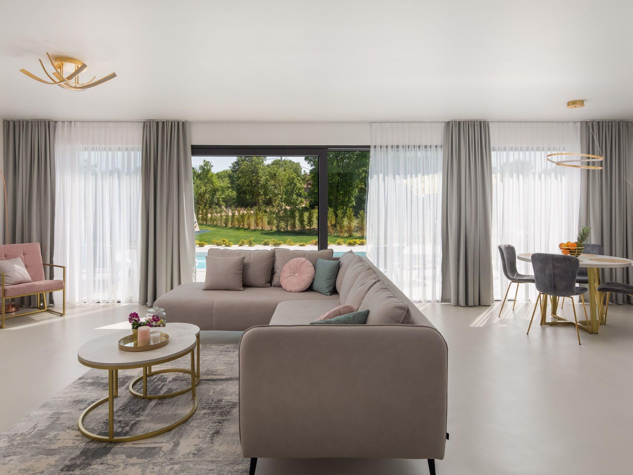 The modernly designed interior consists of 2 spacious bedrooms that accommodate 4 guests. The bedrooms, just like the rest of the villa, are mostly designed in neutral colours with a bit of rose and mauve. A traditional welcome package is waiting for you in the fully equipped kitchen, right by the indoor dining area. Depending on the time of the year, you can cook and dine in the indoor or the outdoor kitchen/dining area, whichever you prefer. And, the beautiful living room is right by the entrance to the terrace, so your days will surely be sun-soaked.