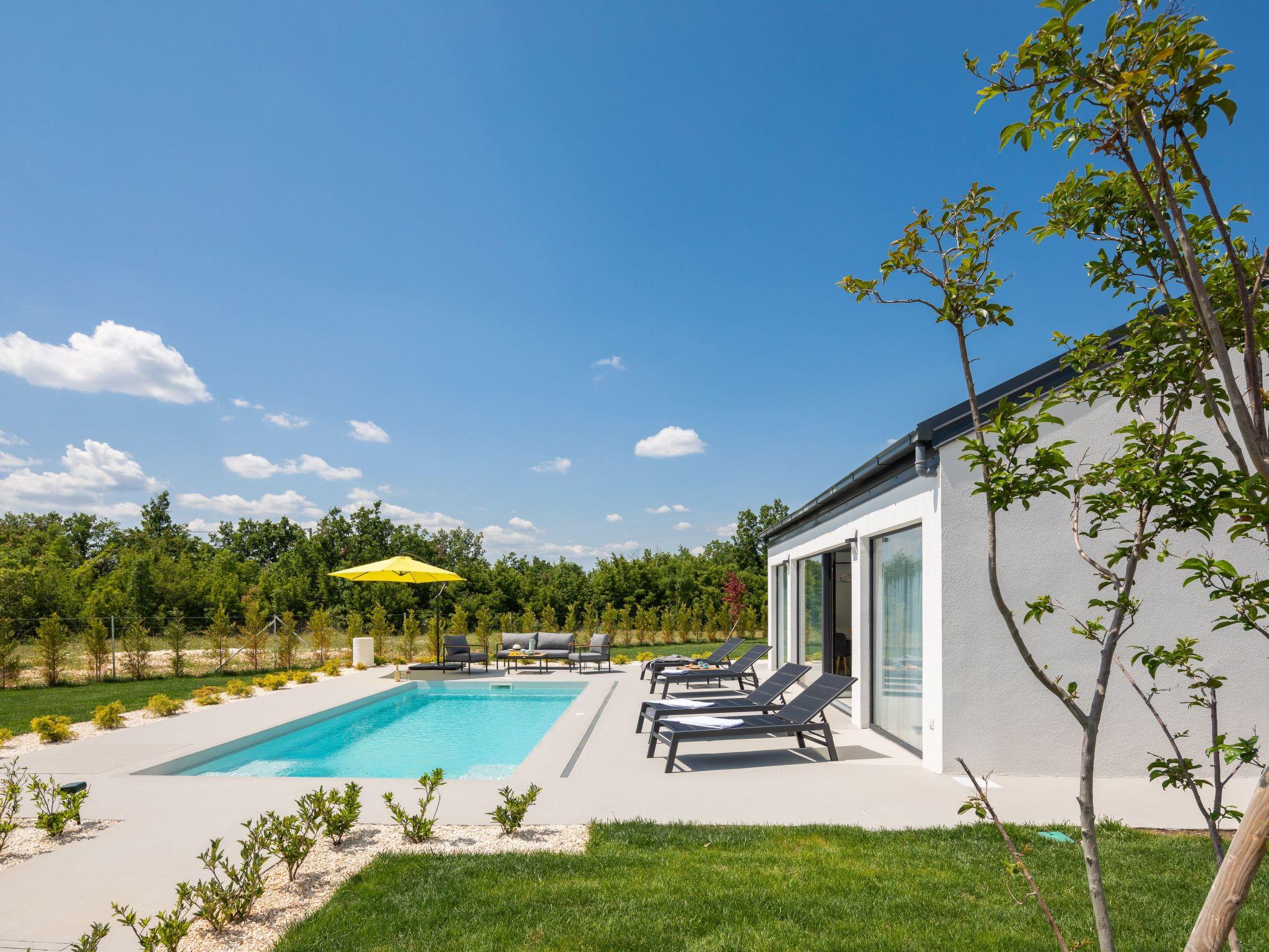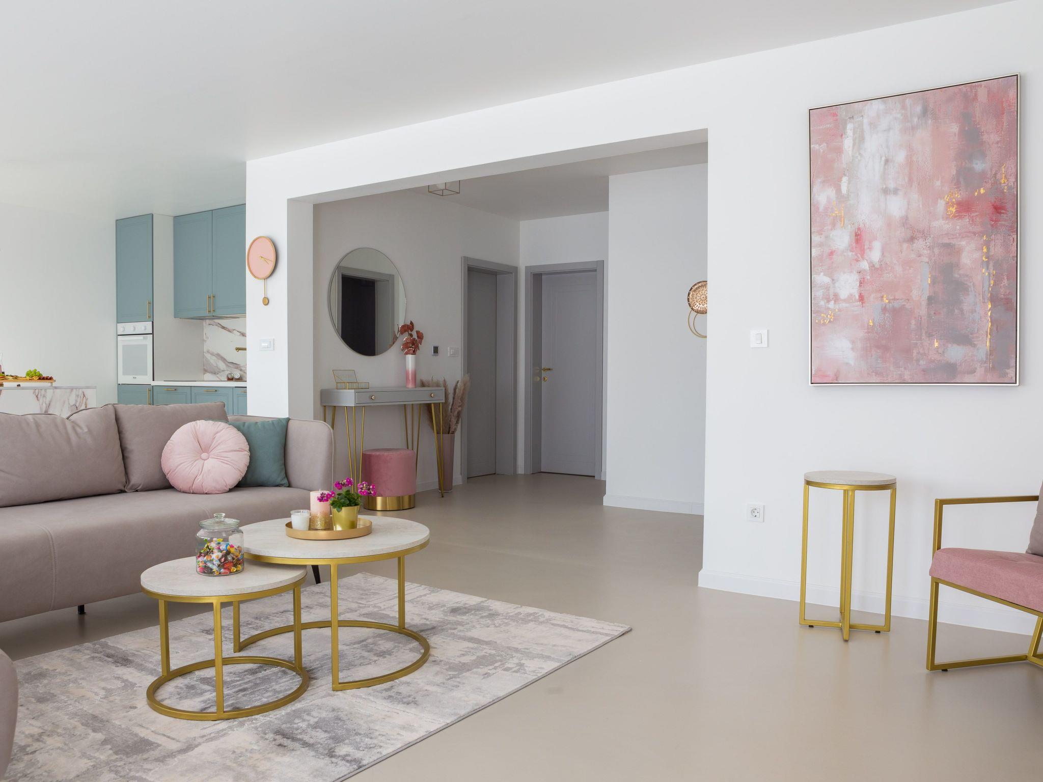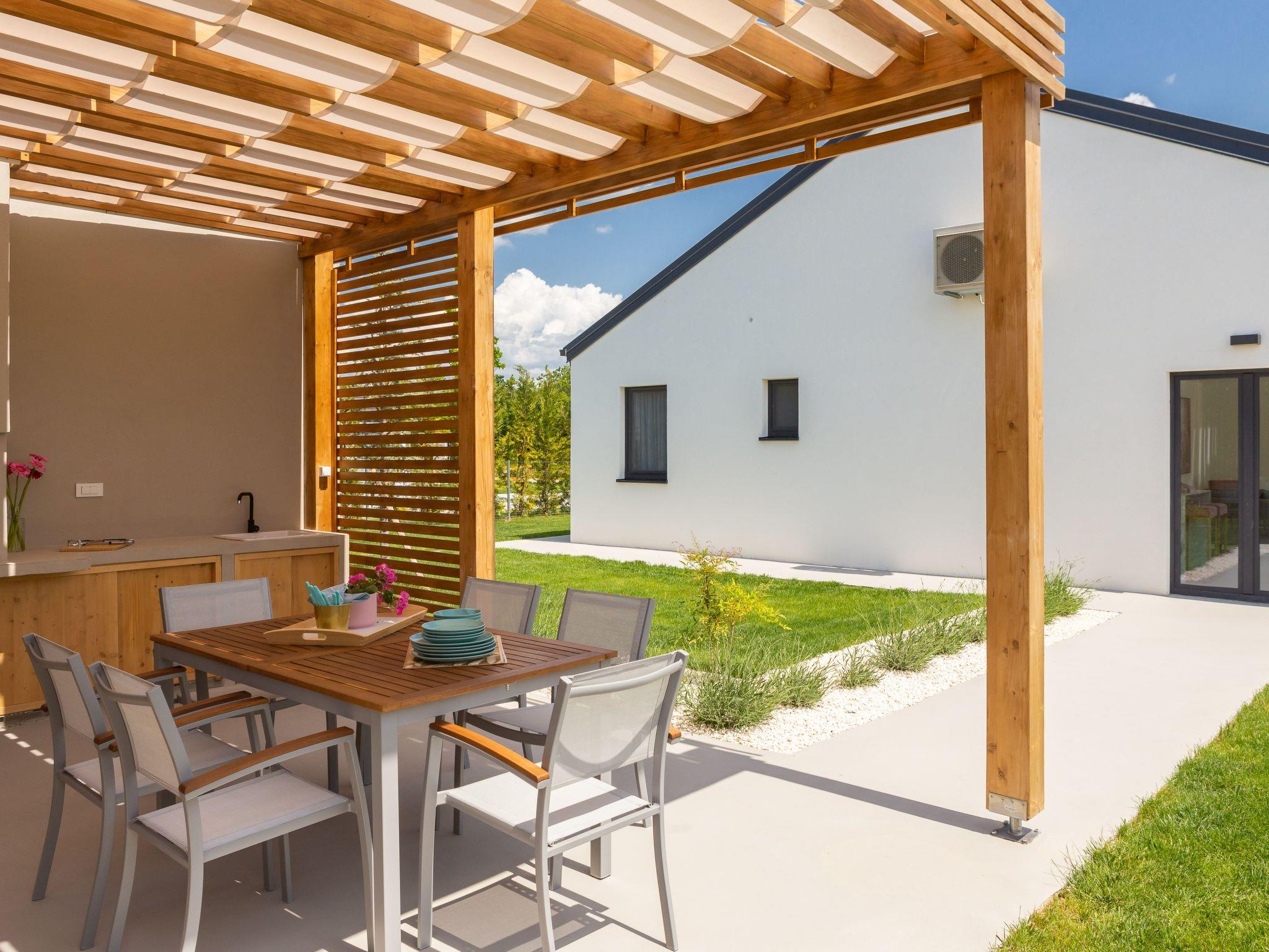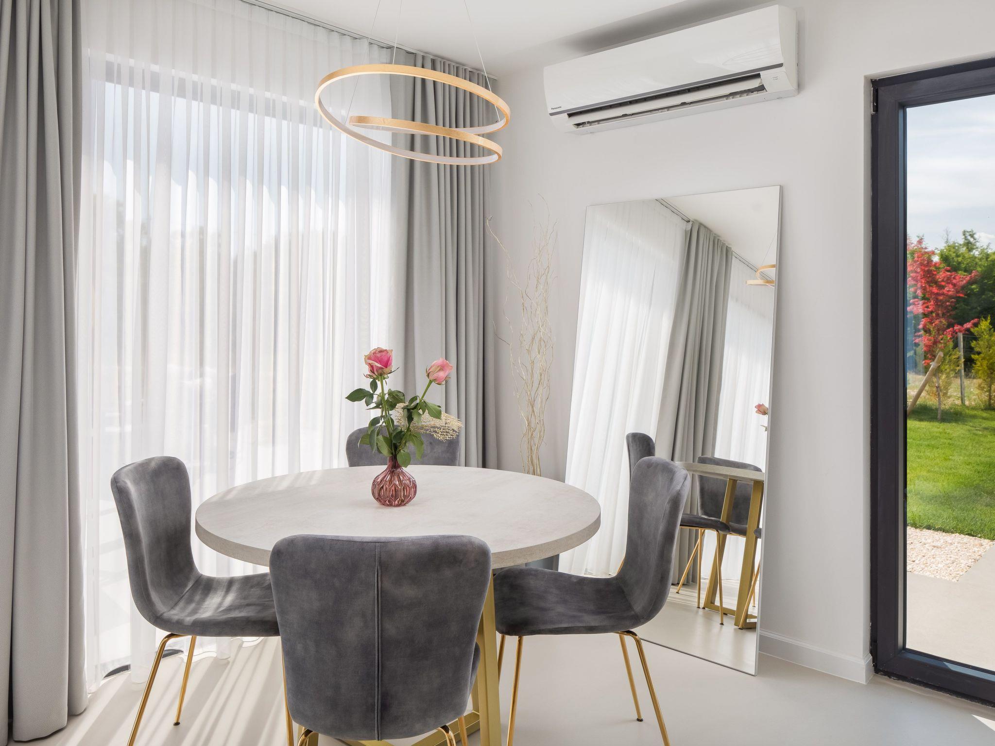 The modernly designed interior consists of 2 spacious bedrooms that accommodate 4 guests. The bedrooms, just like the rest of the villa, are mostly designed in neutral colours with a bit of rose and mauve. A traditional welcome package is waiting for you in the fully equipped kitchen, right by the indoor dining area. Depending on the time of the year, you can cook and dine in the indoor or the outdoor kitchen/dining area, whichever you prefer. And, the beautiful living room is right by the entrance to the terrace, so your days will surely be sun-soaked.