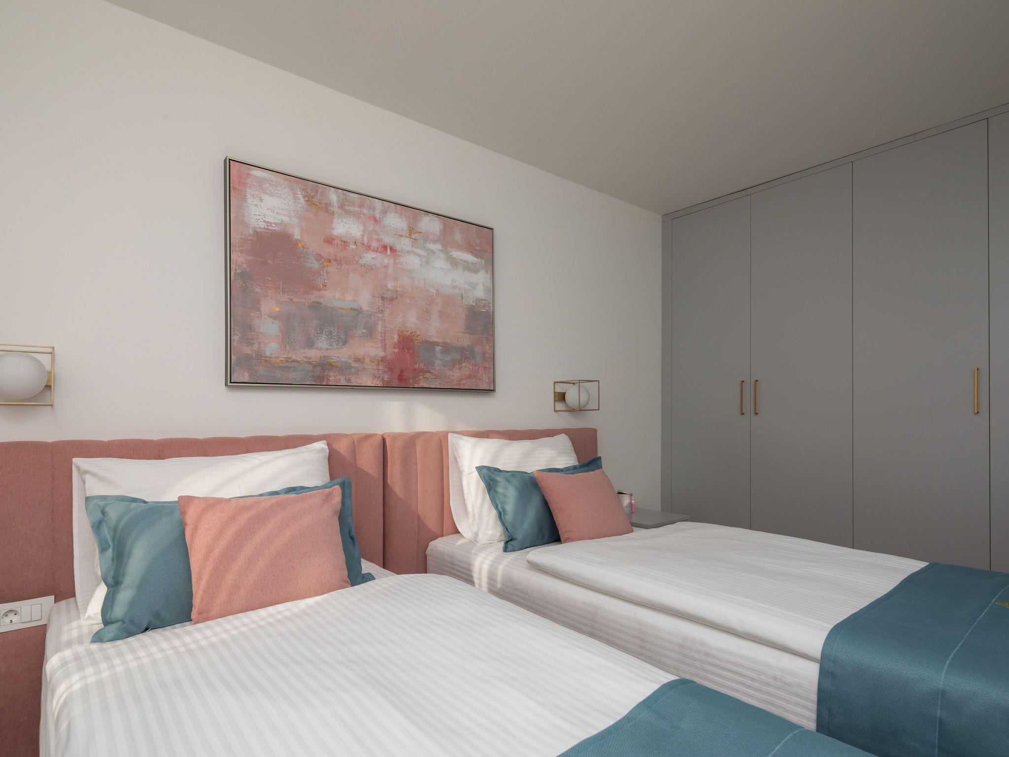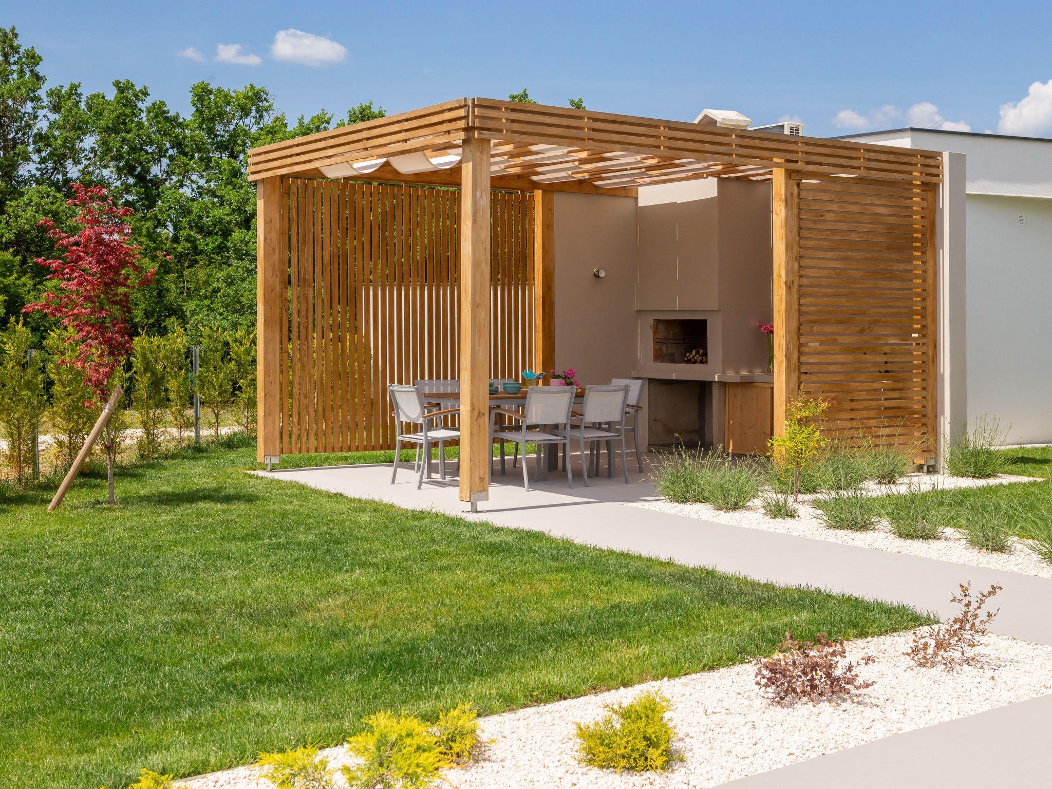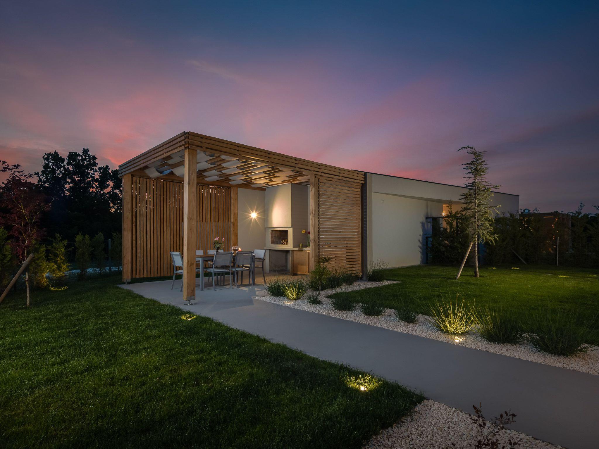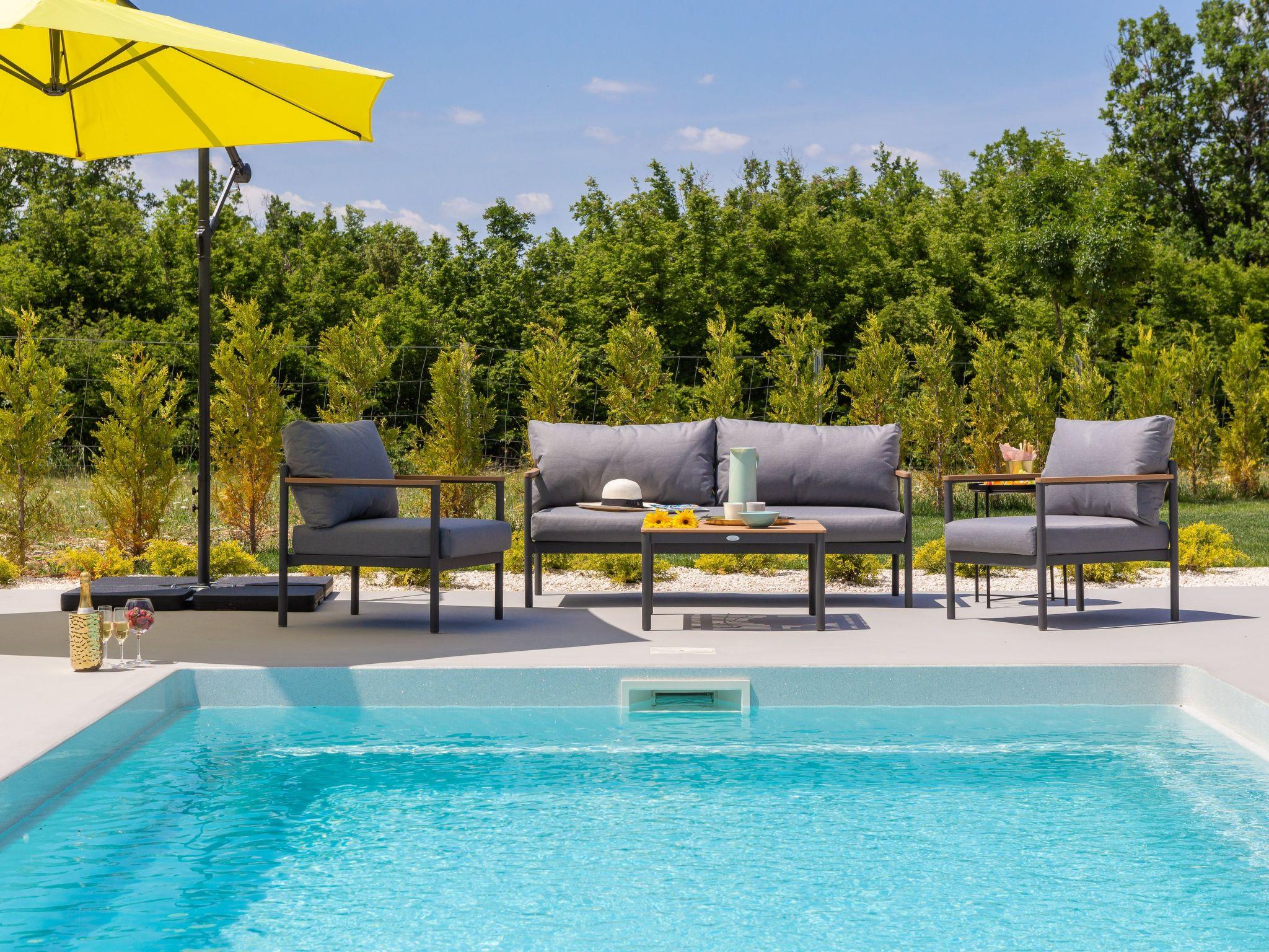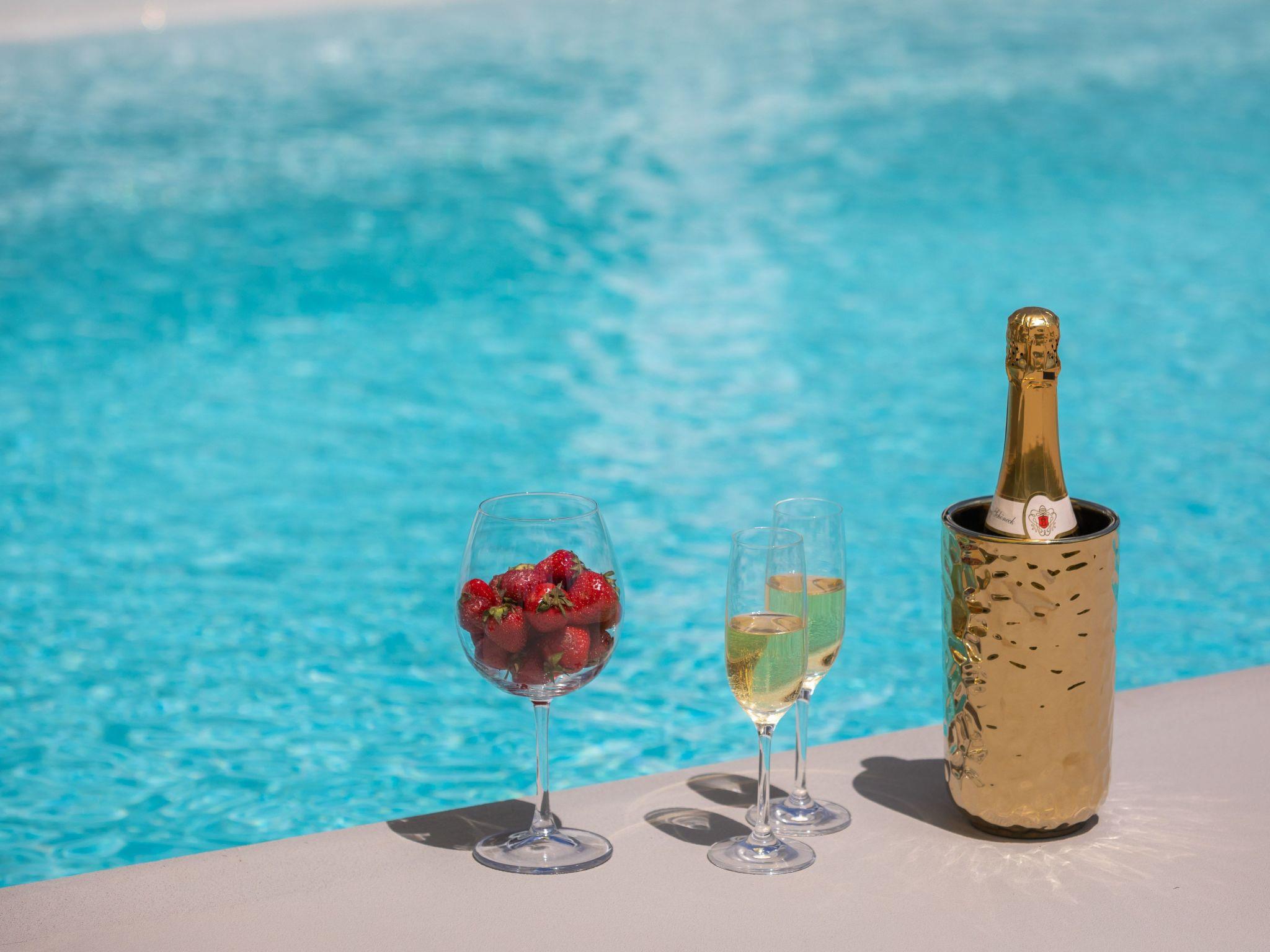 The modernly designed interior consists of 2 spacious bedrooms that accommodate 4 guests. The bedrooms, just like the rest of the villa, are mostly designed in neutral colours with a bit of rose and mauve. A traditional welcome package is waiting for you in the fully equipped kitchen, right by the indoor dining area. Depending on the time of the year, you can cook and dine in the indoor or the outdoor kitchen/dining area, whichever you prefer. And, the beautiful living room is right by the entrance to the terrace, so your days will surely be sun-soaked.