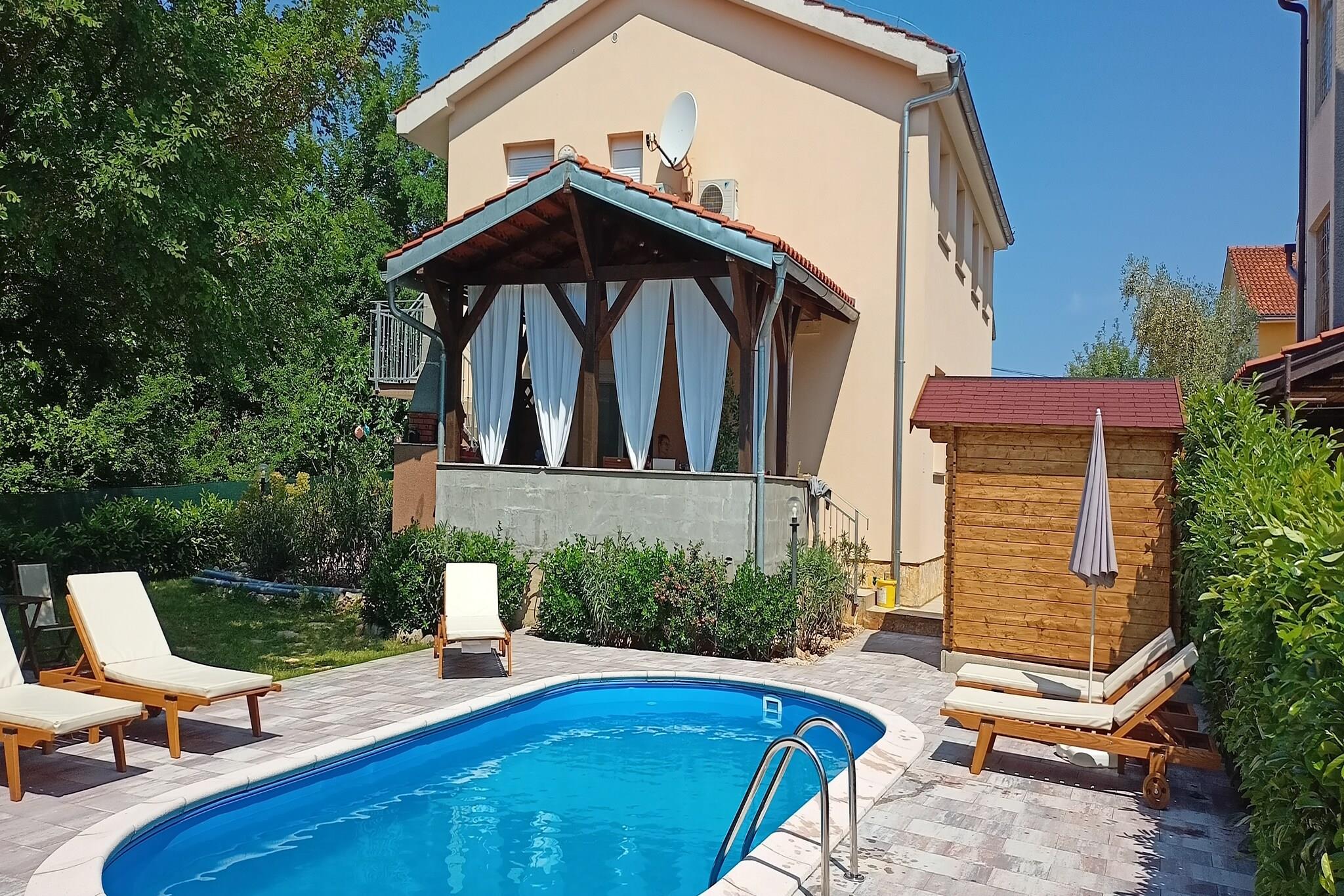 På 1. etage: (Stue(enkeltsovesofa, Fjernsyn(fladskærm, parabol)), Køkken(spisebord, elkedel, brødrister, komfur, kaffemaskine, ovn, mikrobølgeovn, køle-fryseskab), soveværelse(dobbeltseng), soveværelse(dobbeltseng), badeværelse(bruser, håndvask, toilet), balkon) bruser med lysterapi, varme, klimaanlæg, have(deles med andre gæster), havemøbler, grill(deles med andre gæster), parkering, swimmingpool(privat, deles med andre gæster, opvarmet)