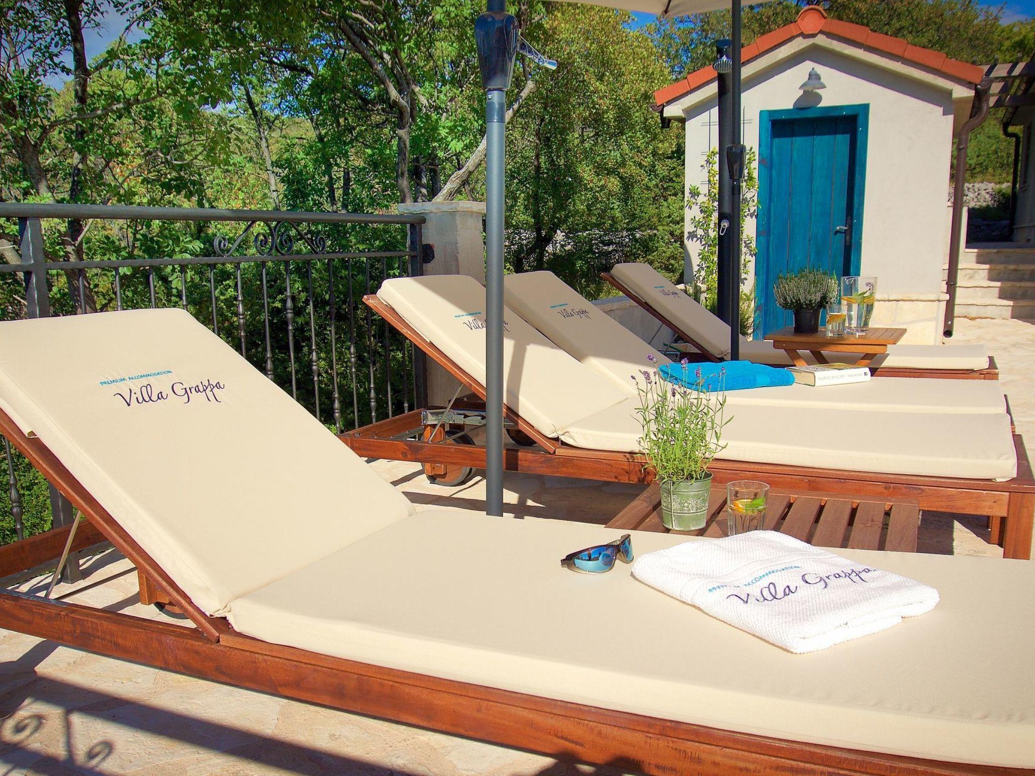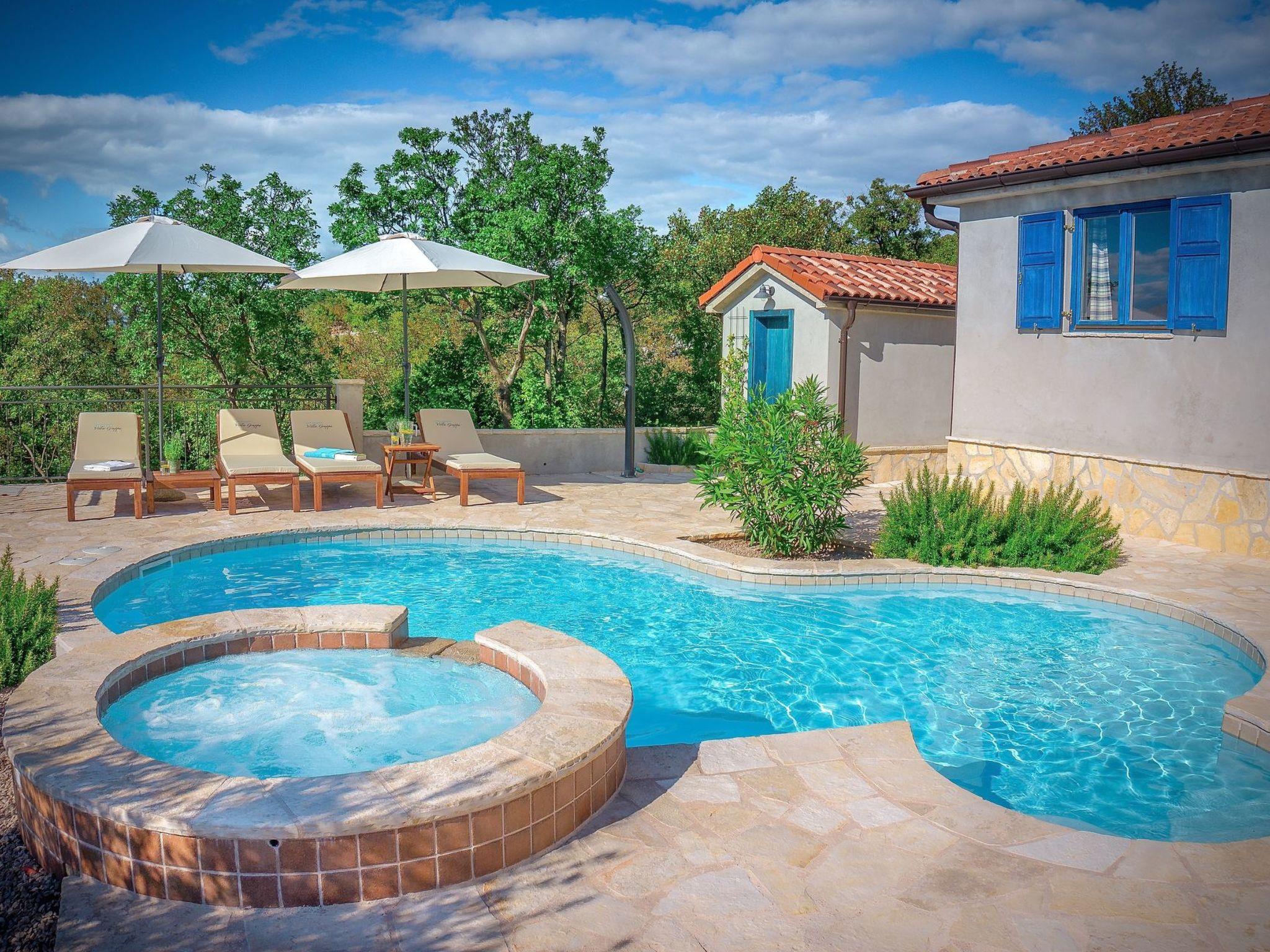 The villa comprises two kitchens; the inner one, fully equipped with all necessary electrical devices and the outdoor kitchen with indispensable barbecue kit. In addition to the large garden with stunning views, the summer kitchen and several terraces for relaxing, the absolute highlight are the pool and the hydro massage area.