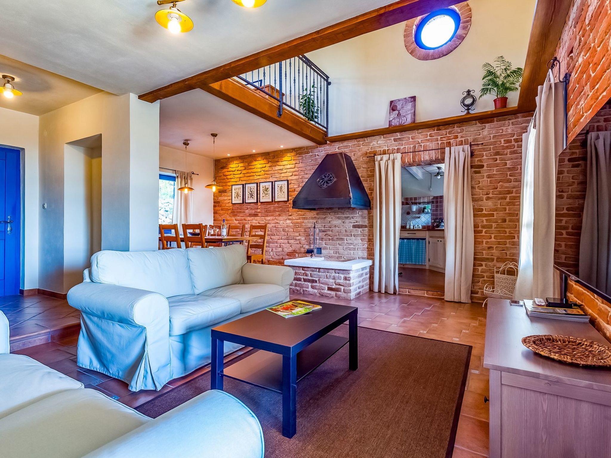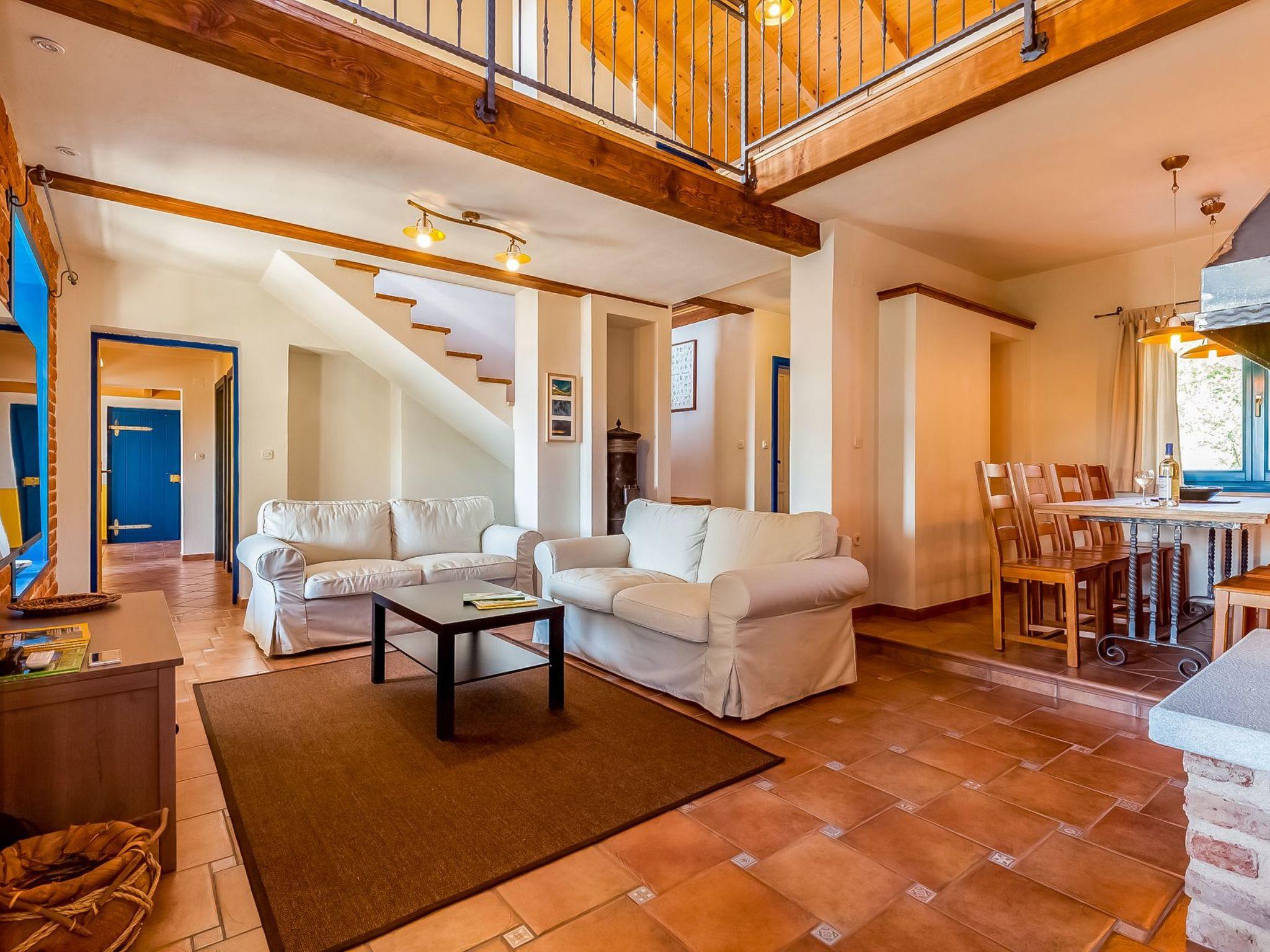 The generously laid out villa has four bedrooms and three bathrooms, providing comfortable accommodation for eight people. It offers a large living room with a fireplace, TV and dining area on the ground floor and an open gallery as a common area with connection to the upper terrace. In order to preserve the peace and quiet and provide a more relaxed atmosphere, we chose not to provide our rooms with television sets.