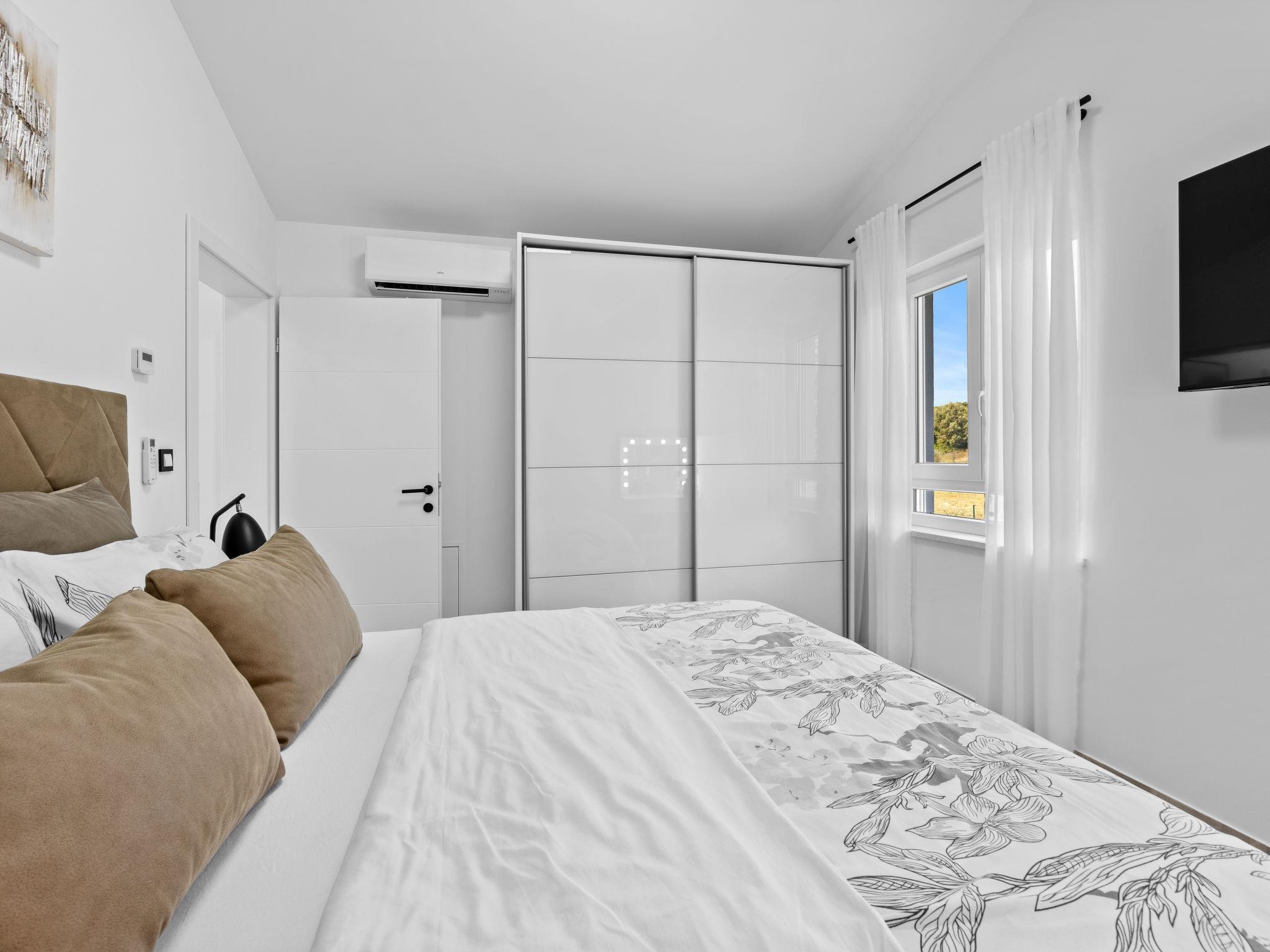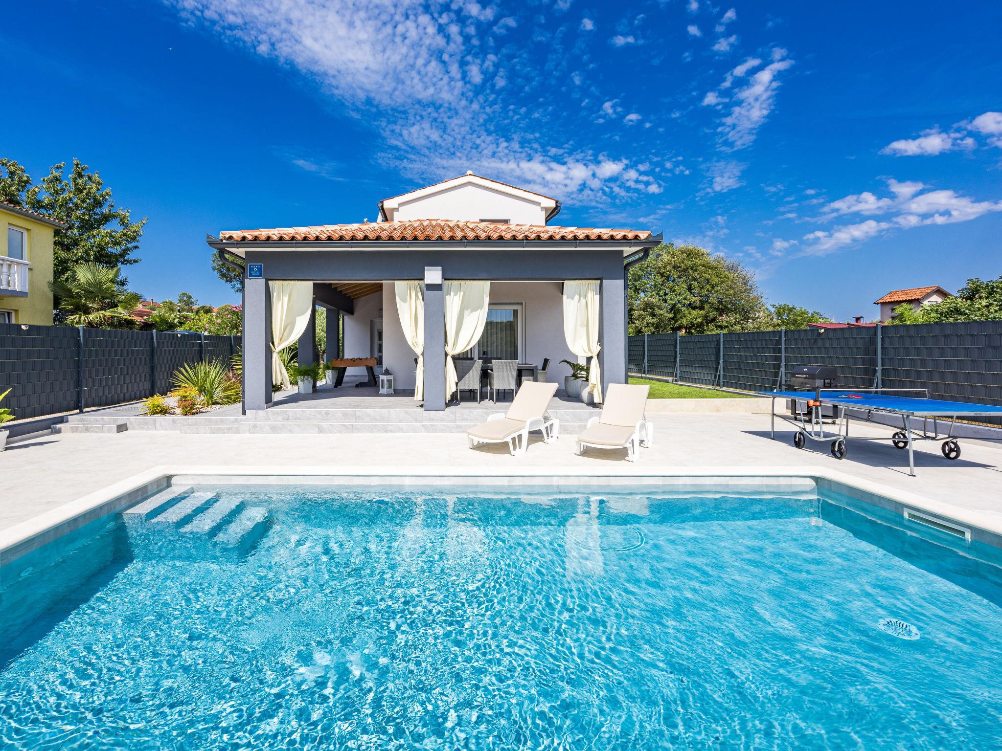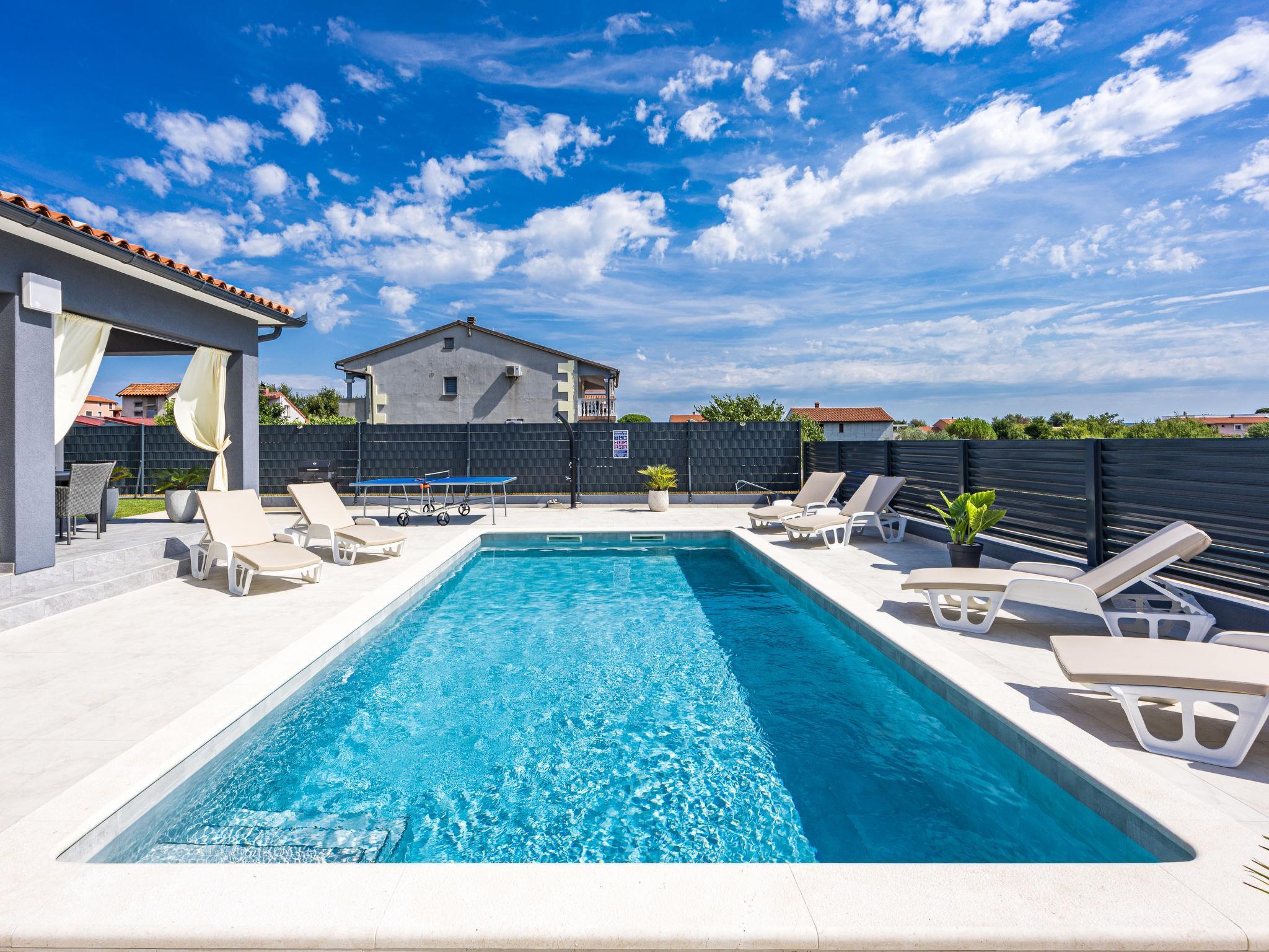Štinjan 5 km from Pula: Modern, beautiful villa "S&V", 2 storeys, built in 2023. 3 km from the centre of Fažana, in a sunny position, 1.5 km from the sea, 1.5 km from the beach. Private: property 500 m2 (fenced), garden, swimming pool angular (32 m2, depth 140 cm, seasonal availability: 01.May. - 01.Oct.) with internal staircase and salt-electrolysis pool-cleaning system. Outdoor shower, table tennis. In the house: internet access, table football, washing machine, tumble dryer. Parking (for 3 cars) at the house on the premises. Shop 300 m, supermarket 2 km, restaurant, bus stop 700 m, pebble beach 1.5 km, rocky beach 1.5 km. Golf course (18 hole) 5 km, sailing school 5 km, tennis 500 m, riding stable 4 km, walking paths from the house 700 m, cycle lane 500 m. The owner does not accept any youth groups.