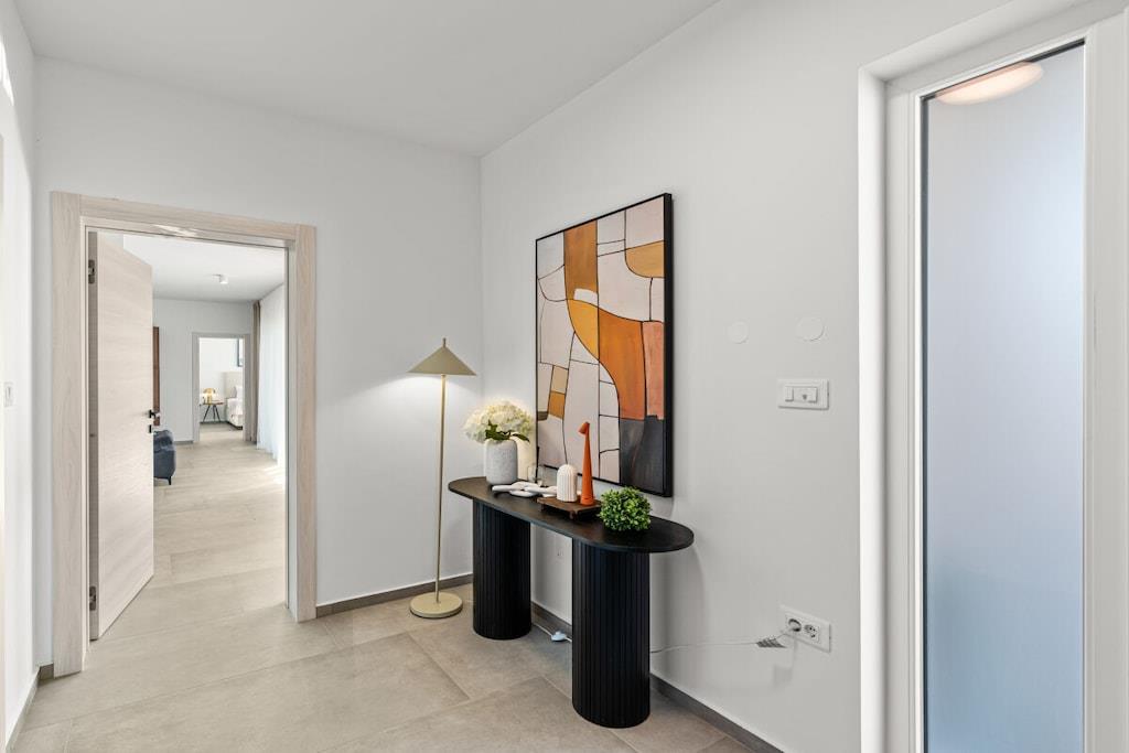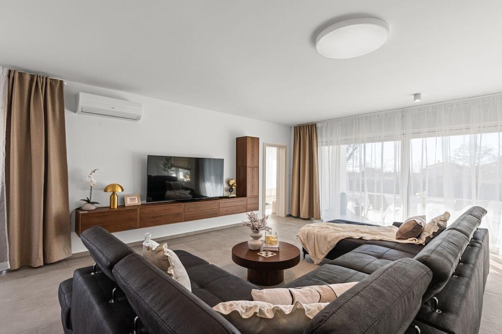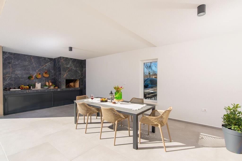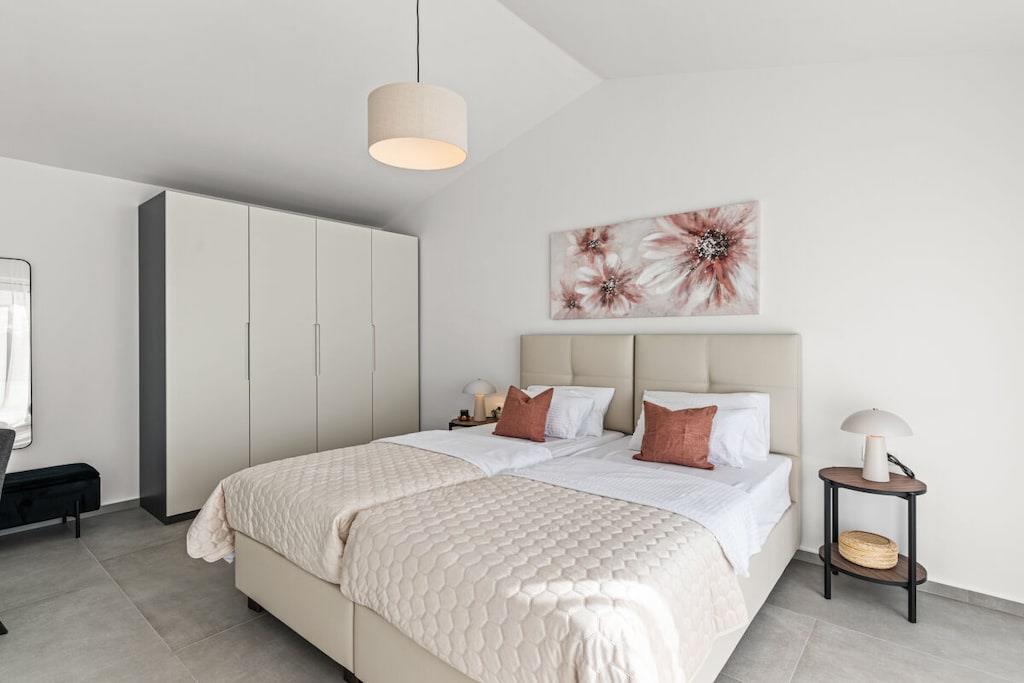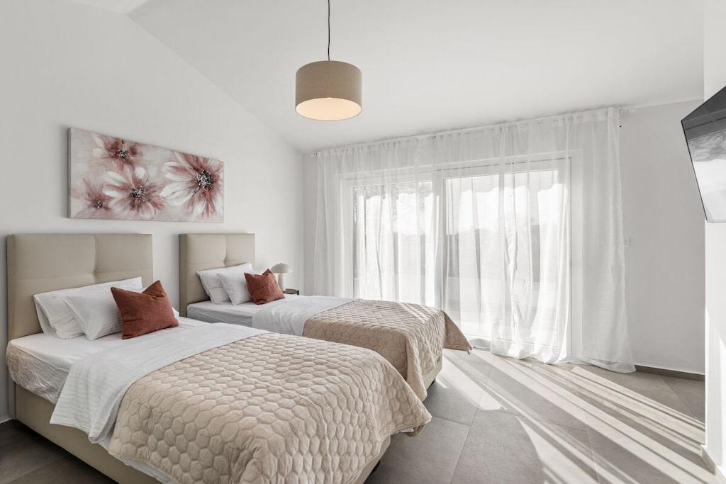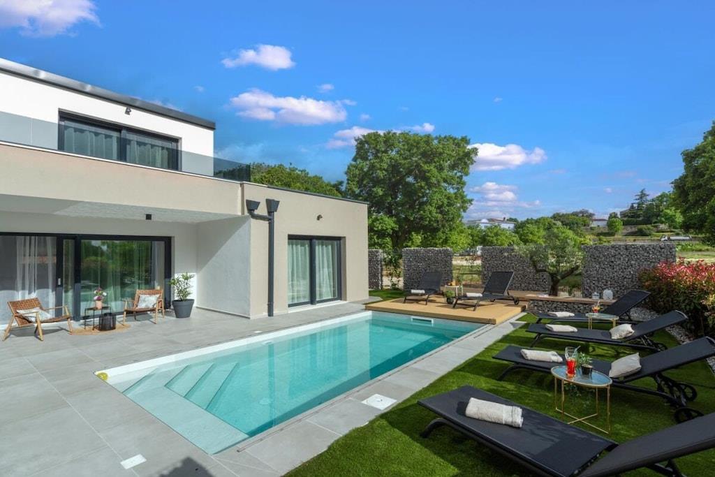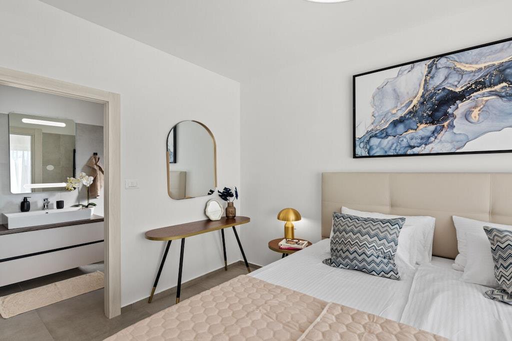 Villaen er udstyret med moderne apparater og indrettet i afslappende farver. Den har 3 soveværelser med private badeværelser, et moderne og fuldt udstyret køkken (brødrister, mikrobølgeovn, cafeteria) med spisebord, en stue og toilet samt et vaskerum. Udendørs er der en swimmingpool, en overdækket terrasse med spisebord og en grill til hyggelige sammenkomster med familie og venner. Og en ekstra terrasse, der er perfekt til at nyde morgensolen.