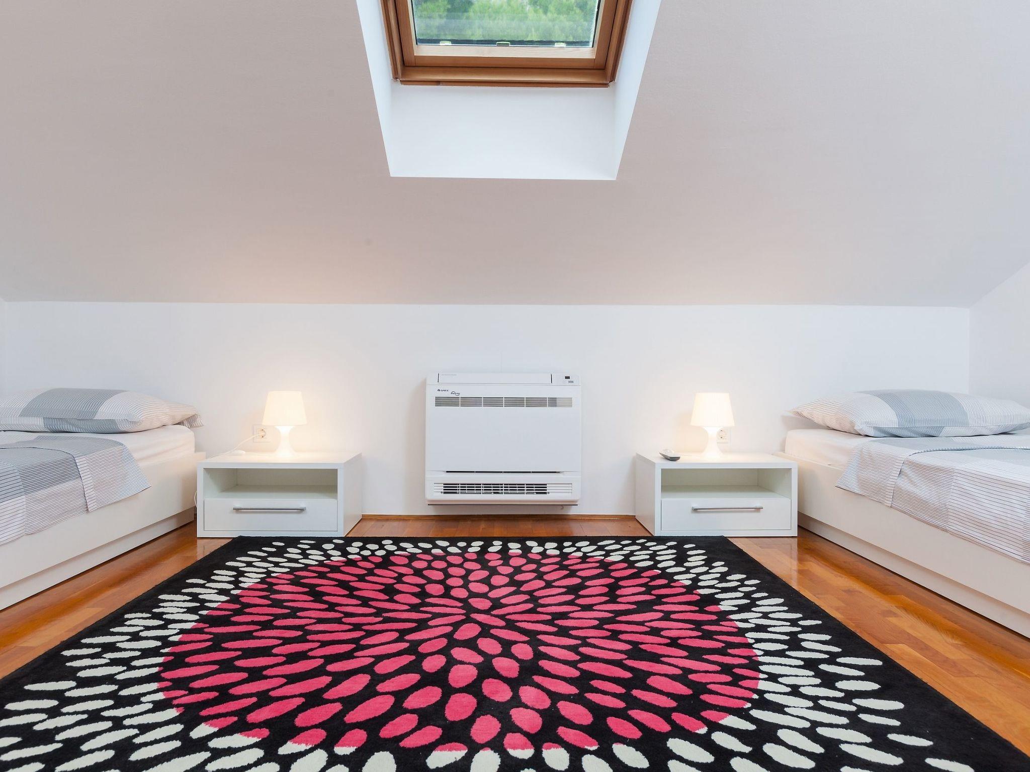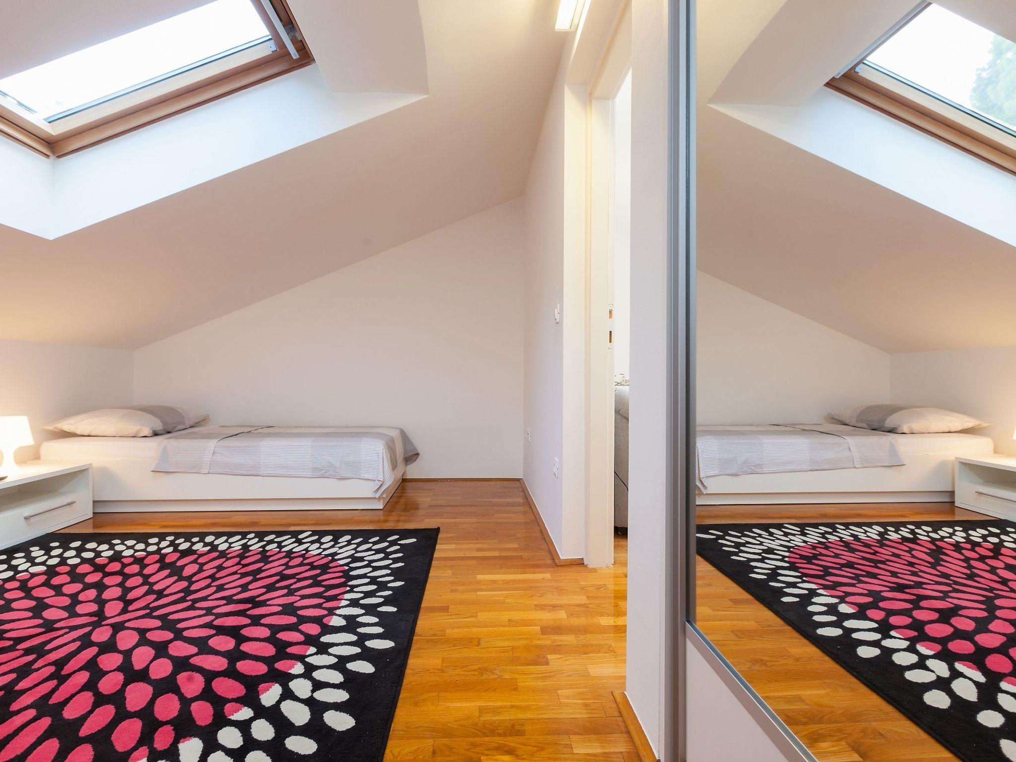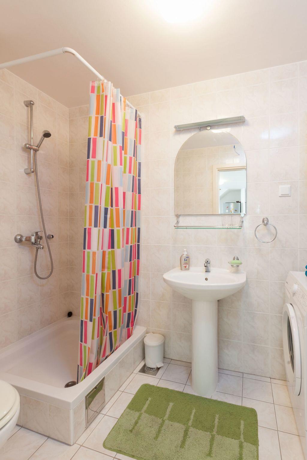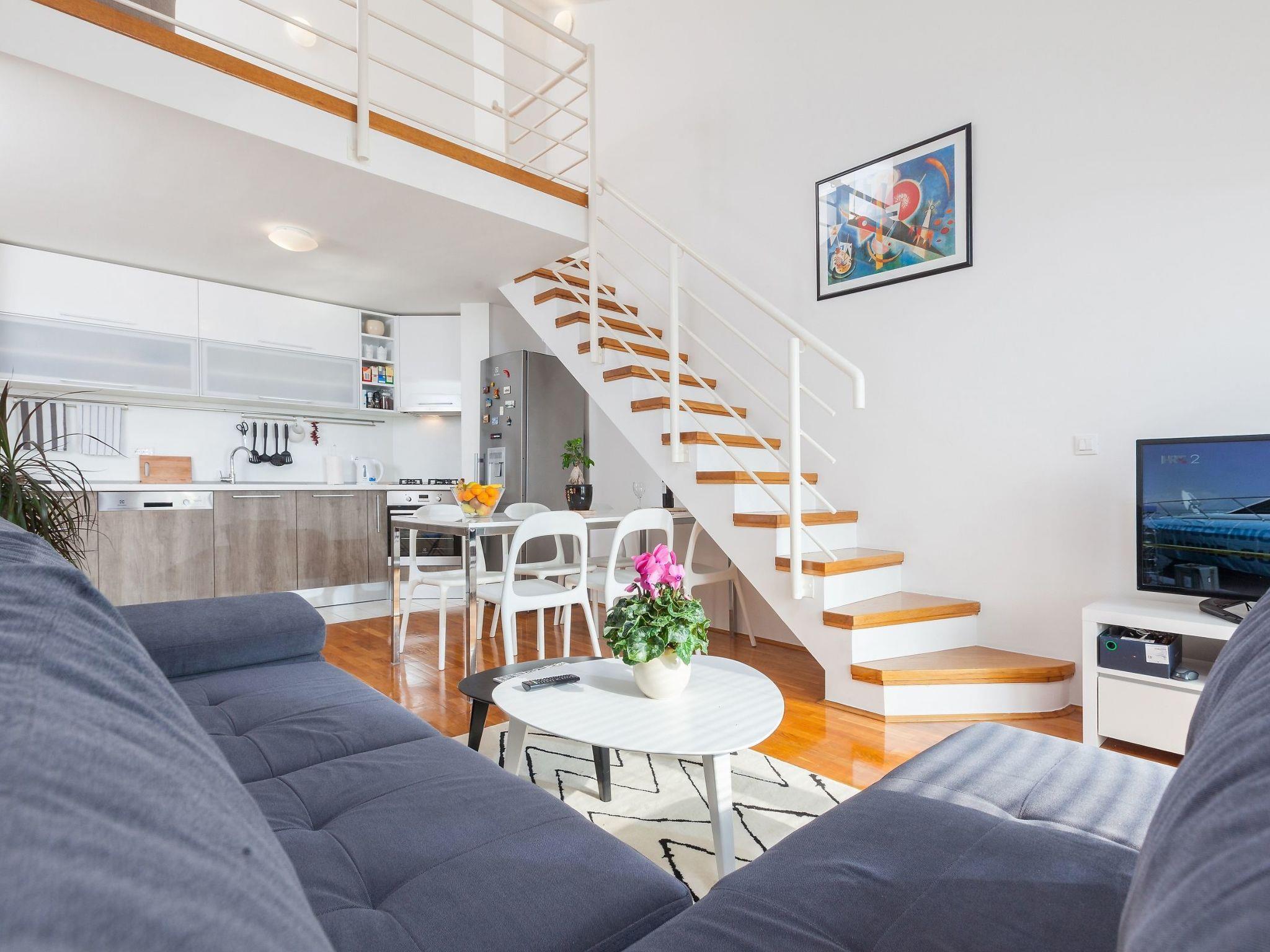 The surface of the apartment is 75 m² in size and comprises of the following rooms: A living room with a dining table, kitchen and a flatscreen TV and a double sofa bed. There is also a bedroom next to it, which includes a double bed. Plus there is a fully-equipped kitchen with an oven, electric kettle, fridge and a dining area, as well as an adjoining bathroom with a shower. On the upper floor there is another sleeping room with two beds and bathroom.