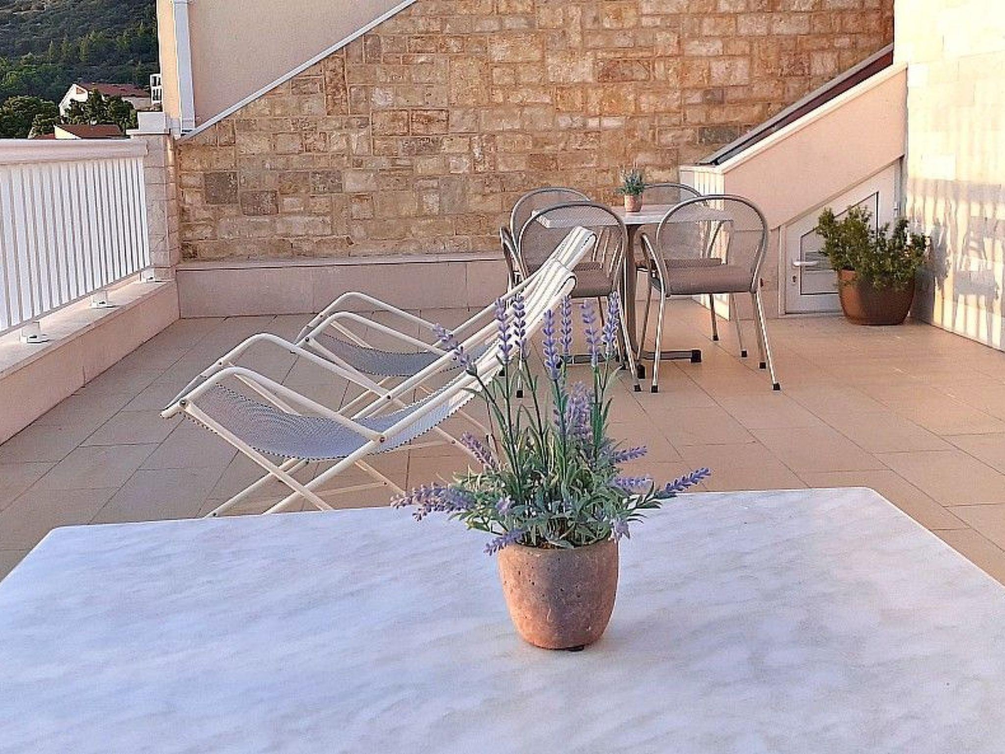 You can enjoy a wonderful view of the sea and the hilly landscape from the generous terrace, which is shared with the neighbouring apartment, with garden furniture and a parasol. Barbecuing is not permitted.