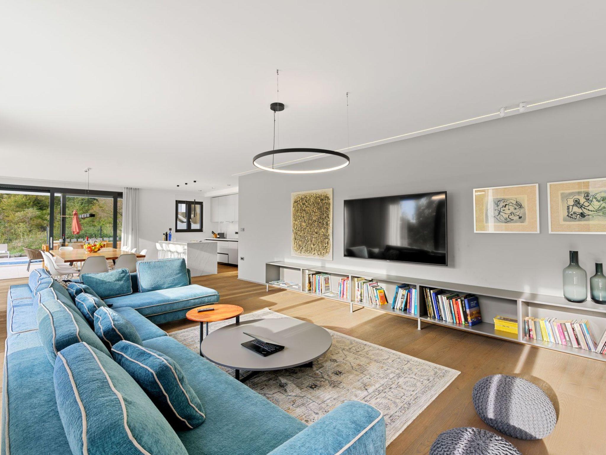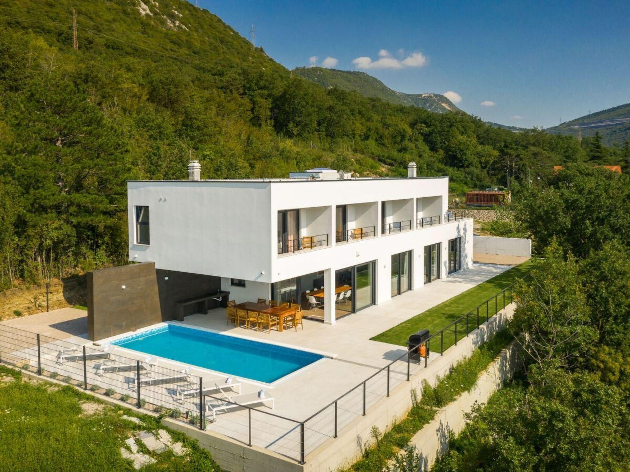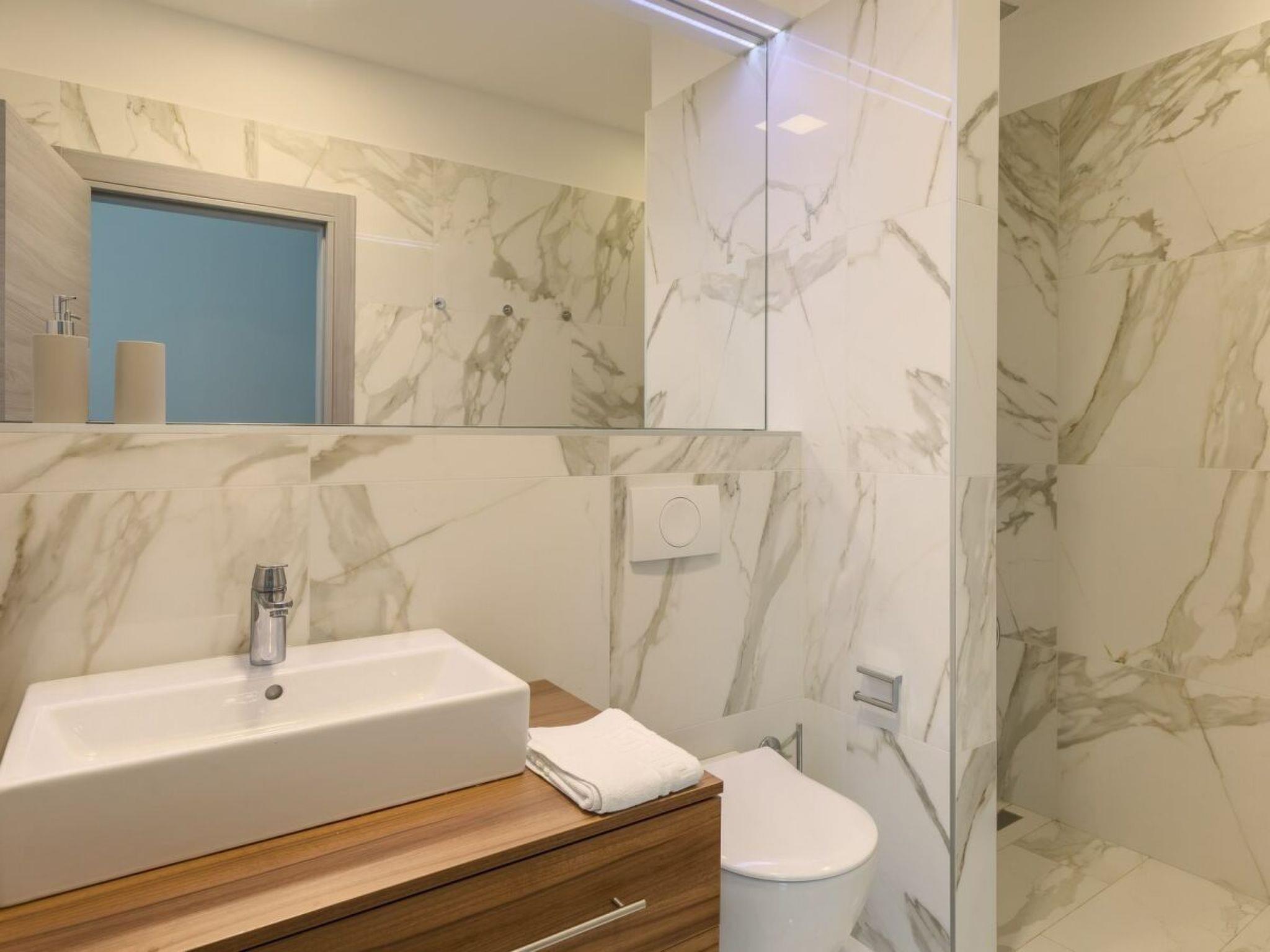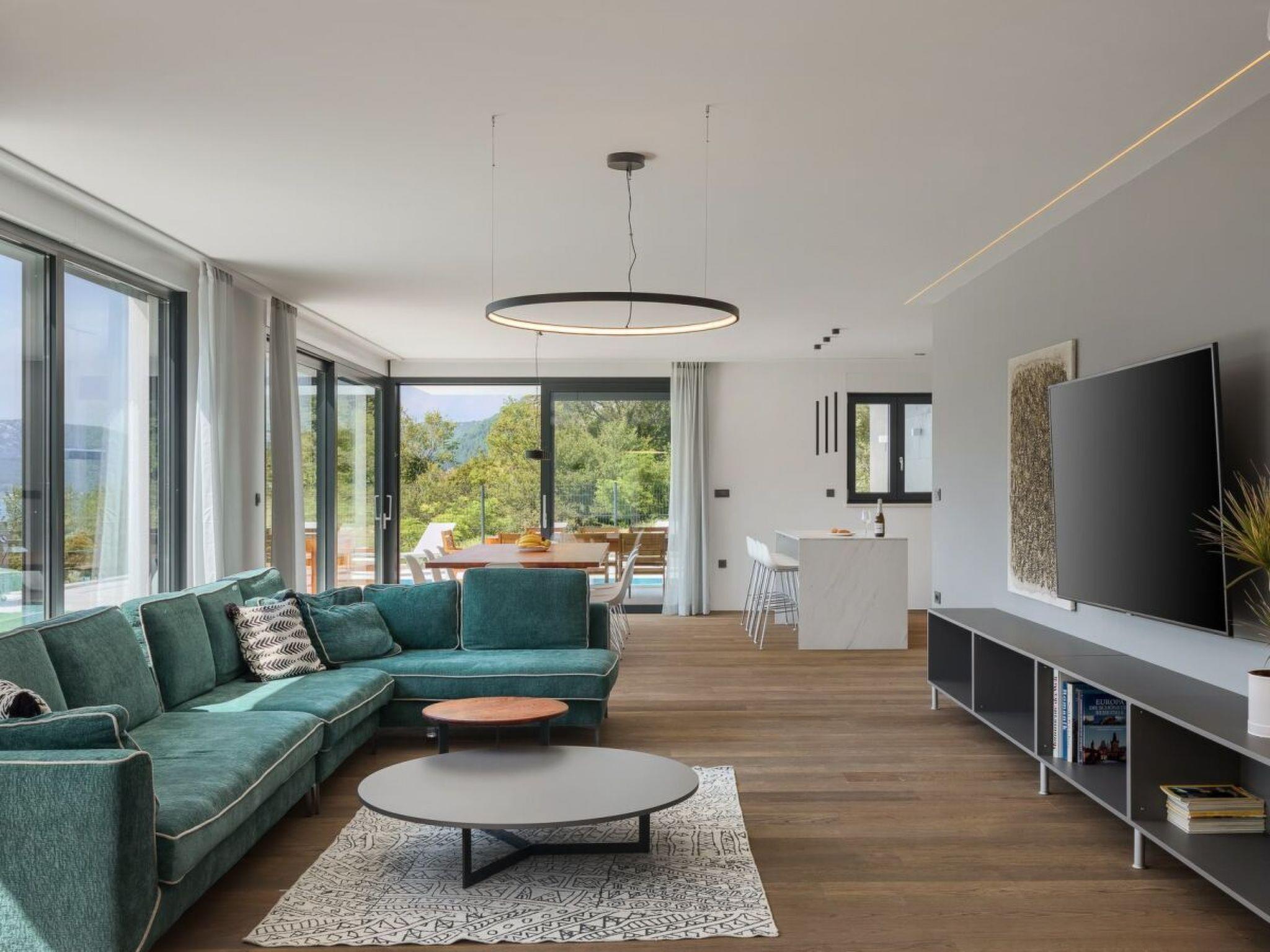 The dreamlike Villa Adria Blue was built in 2020 and is furnished with great charm and attention to detail. A simply elegant, extremely comfortable 314 m² house for a maximum of twelve people awaits you. You can enjoy the fabulous sea view all day long while soaking up the Mediterranean sun on one of the comfortable sun loungers by the 32 m² pool. Here you are sure to spend unforgettable barbecues with family and friends, while the children play volleyball, football or badminton on the green area behind the house. Each room has its own bathroom, a balcony with a view of the bay and a TV. The entire house has underfloor heating and is air-conditioned throughout, making it cosy all year round. On the ground floor there is a huge light-flooded living and dining area, as well as a fully equipped kitchen.