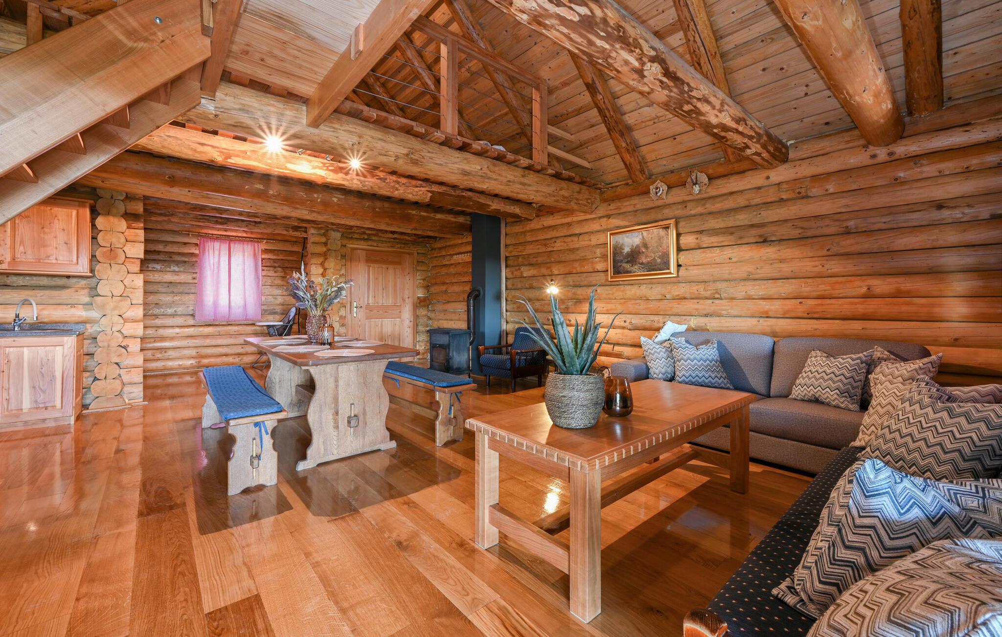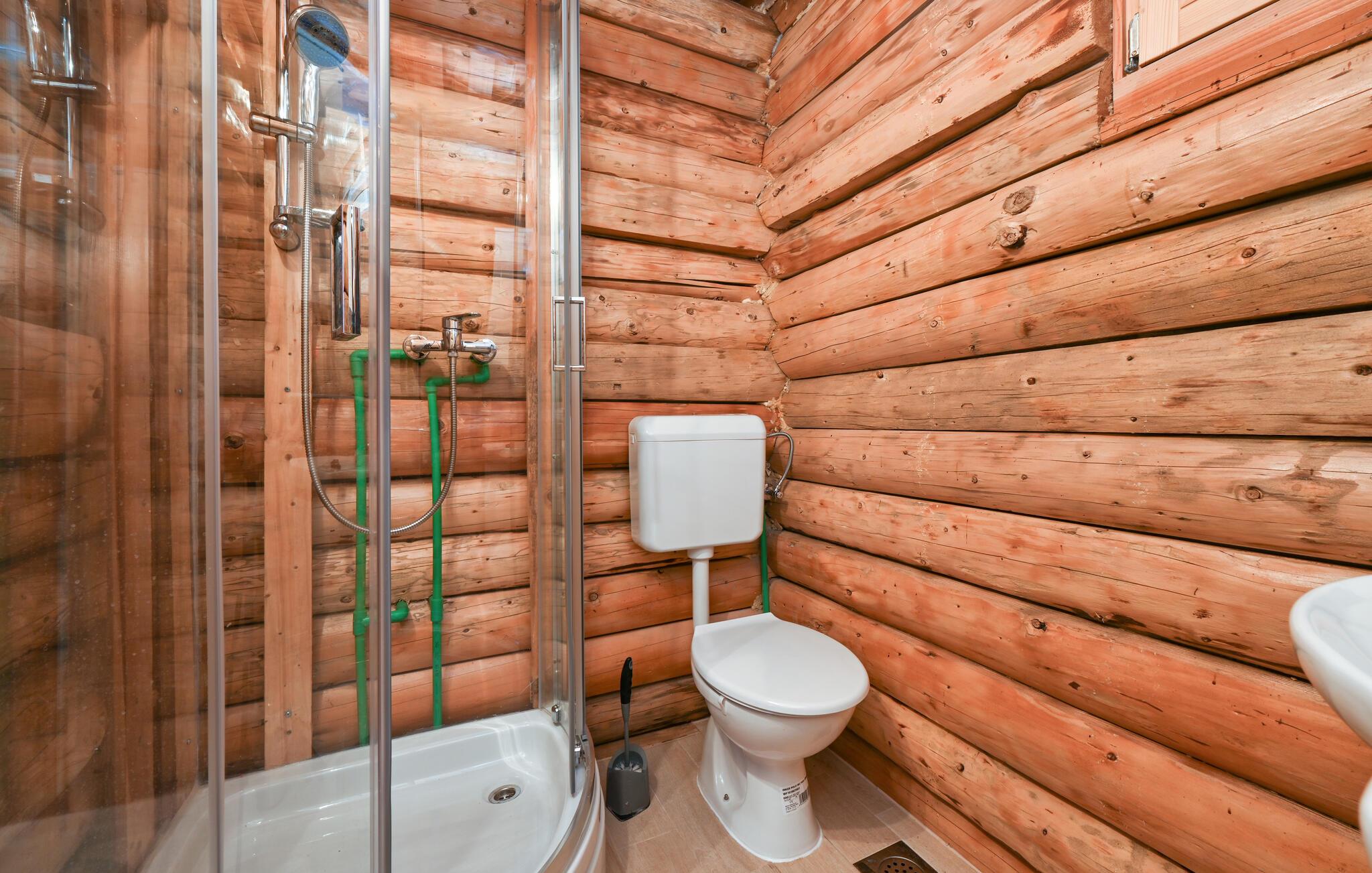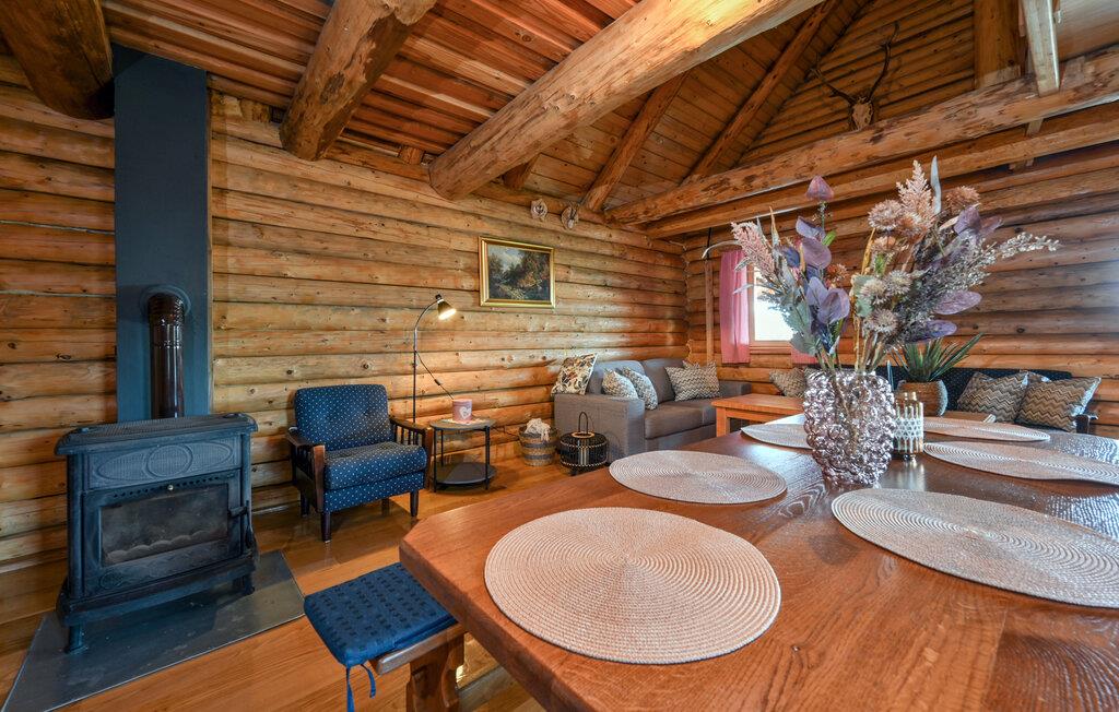 I dette rummelige træhus venter der jer en ferie fyldt med komfort og afslapning. Det rustikke trædesign giver huset en varm, indbydende atmosfære, hvor I straks vil føle jer hjemme. De store indendørsrum tilbyder jer masser af plads til afslapning, og den højkvalitets indretning sikrer maksimal komfort. Efter et besøg i saunaen kan I slappe af på den store overdækkede terrasse og nyde roen. Den afskærmede grund giver jer absolut privatliv og gør dette træhus til et idyllisk tilflugtssted midt i naturen.