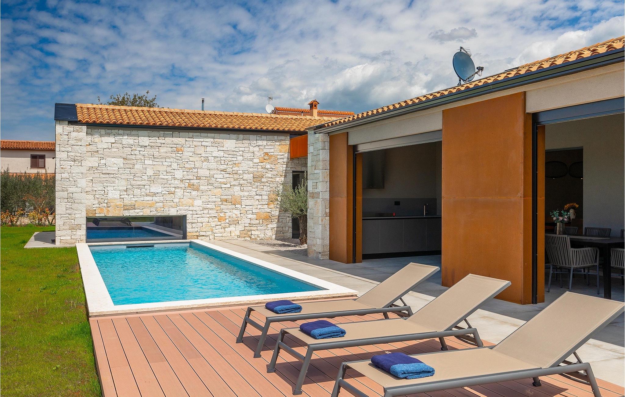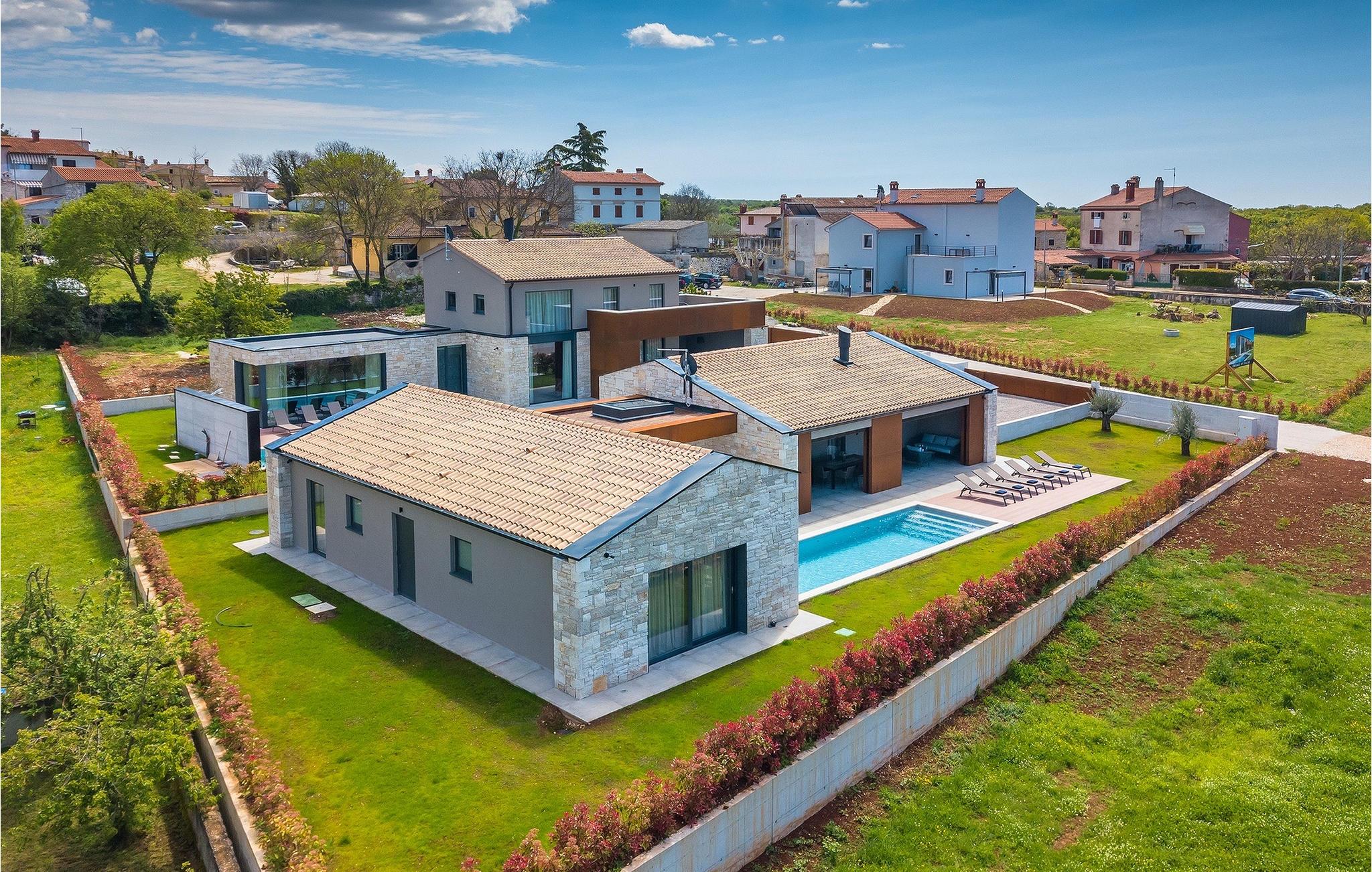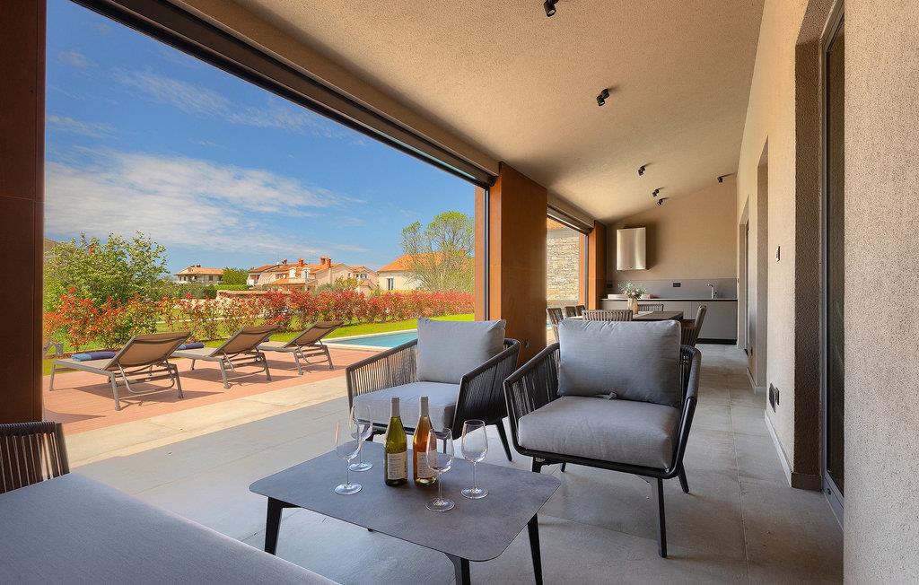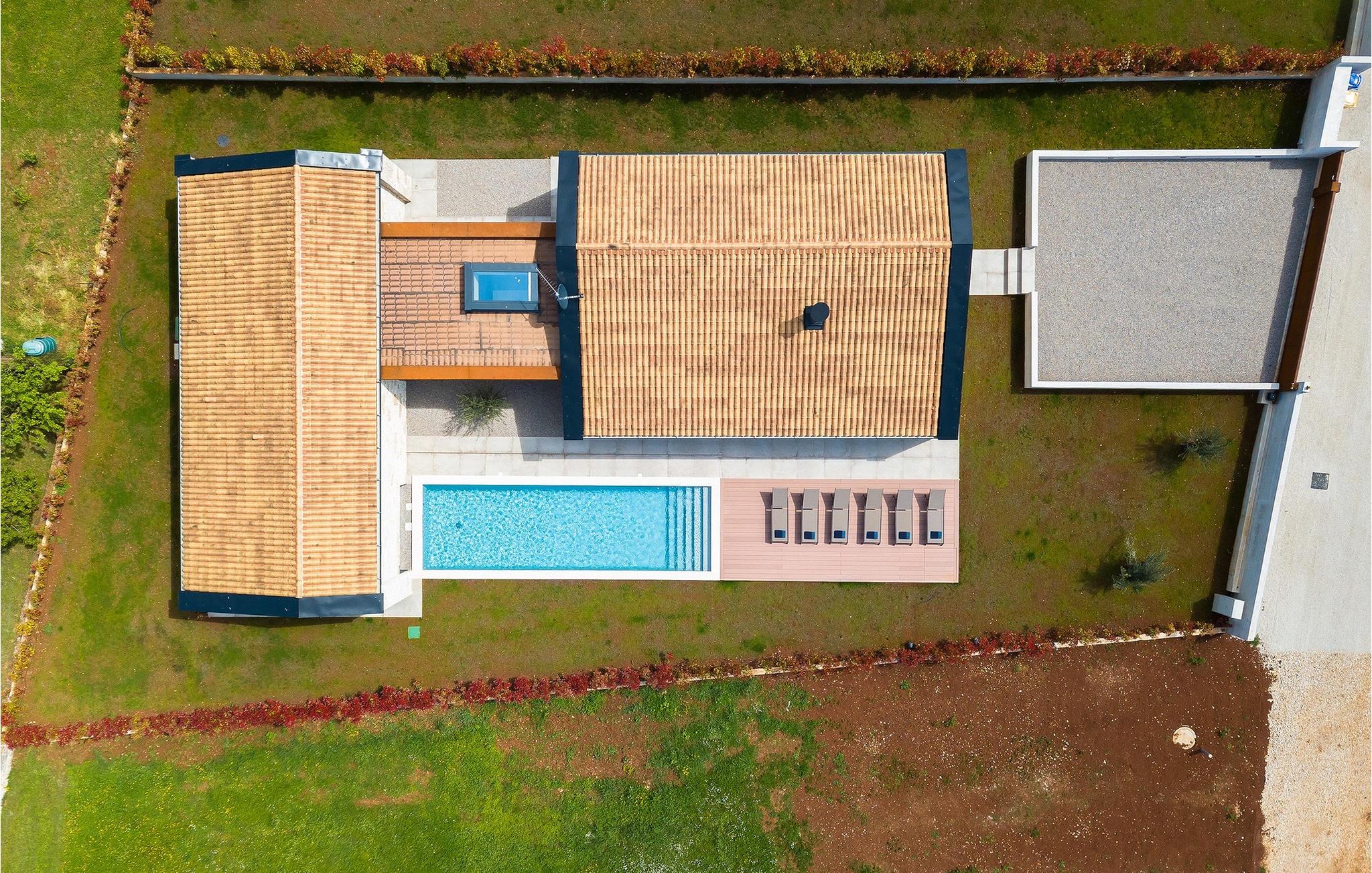 Villa Oliba er et moderne et-plans hus med stendetaljer, der kan rumme op til 5+1 gæster. En privat swimmingpool er tilgængelig udenfor, hvilket er fantastisk til feriesport eller bare et køligt spring på en varm sommerdag. Selvfølgelig er der også liggestole og parasoller til rådighed for en hel dag med afslapning. Når det er tid til frokost eller aftensmad, behøver du ikke engang at gå ind i villaen. Den overdækkede terrasse har et udekøkken og et stort spisebord lige ved siden af. Efter de daglige måltider kan du tage til loungeområdet og nyde din eftermiddagskaffe. De talrige glasvægge i denne ejendom, som giver fri udgang/udsigt til omgivelserne og lukker meget lys ind, understreger sammenhængen mellem inde og ude. Den overdækkede terrasse giver direkte adgang til de åbne rum i stue, køkken og spisestue. Stuens marmorbeklædte pejs tilfører et særpræg og bidrager til rummets overordnede neutrale, moderne æstetik. Den store glasvæg, der vender ud mod køkkenet, er dog uden tvivl det mest spændende træk ved dette rum. Gennem denne glasvæg giver det moderne køkken med træ- og marmoraccenter et klart udsyn til poolen og oliventræet. Samme område har også ovenlys på oversiden. Der fortsætter 3 moderne og neutralt indrettede soveværelser, som alle har eget bad, men også har deres egne særpræg. Det store soveværelse har en interessant glasvæg med udsigt over poolen, mens det andet soveværelse har direkte adgang til terrassen og poolen. Bale er en lille by i den kontinentale del af Istrien nær Rovinj. Det er en fantastisk beliggenhed for dagsture enten mod kysten eller længere inde i landet. Der er mange muligheder for at udforske strande og bugter, og fra byerne skal du sørge for at besøge Rovinj og Pula. I Rovinj vil du blive henrykt over de farverige huse og kirken St. Euphemia på toppen af den gamle bydel. I Pula kan du besøge adskillige seværdigheder, og hvis du formår det, så sørg for at tage til en koncert i Pula Arena (Amfiteater). I den indre del af Istrien kan du finde mange taverner og restauranter med istriske delikatesser, og der er også talrige vingårde, hvor du kan smage lokale vine.