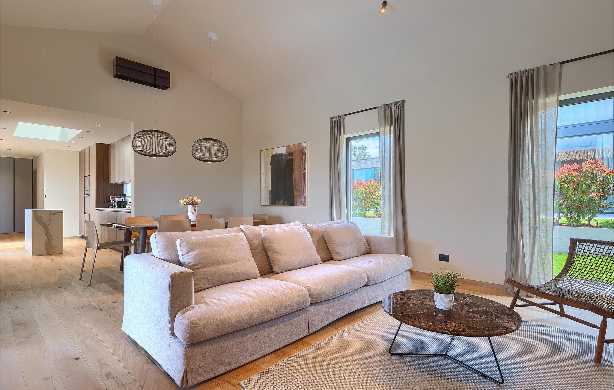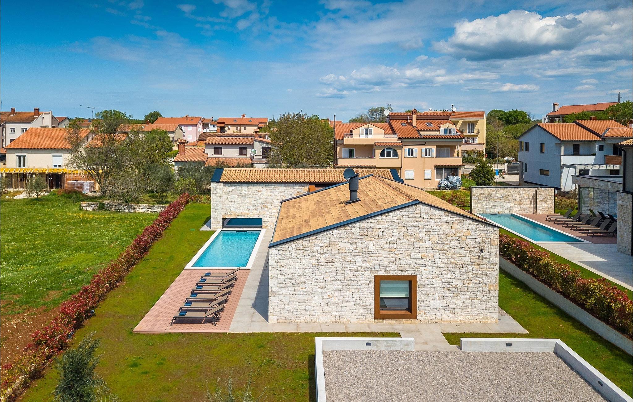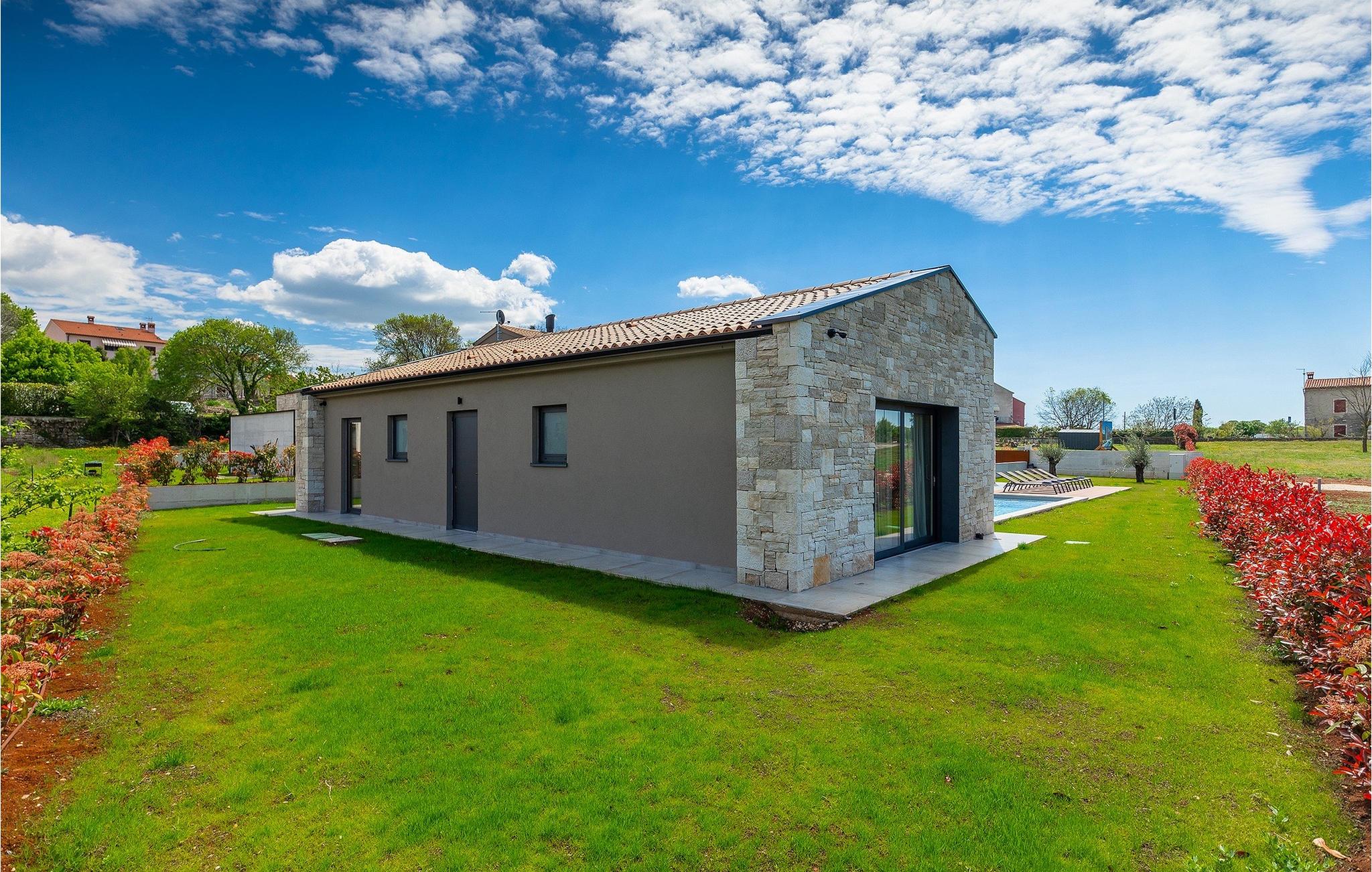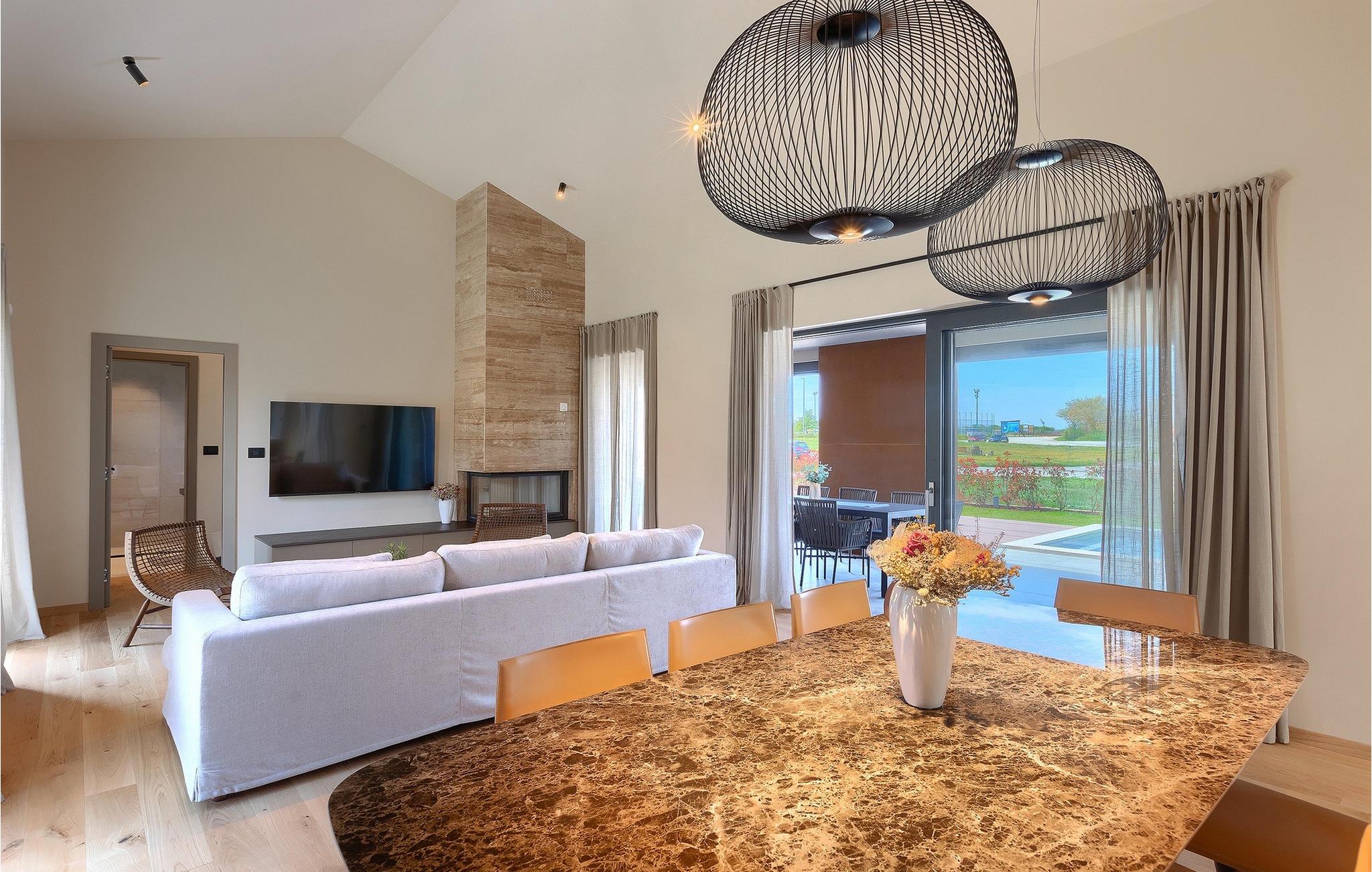 Villa Oliba er et moderne et-plans hus med stendetaljer, der kan rumme op til 5+1 gæster. En privat swimmingpool er tilgængelig udenfor, hvilket er fantastisk til feriesport eller bare et køligt spring på en varm sommerdag. Selvfølgelig er der også liggestole og parasoller til rådighed for en hel dag med afslapning. Når det er tid til frokost eller aftensmad, behøver du ikke engang at gå ind i villaen. Den overdækkede terrasse har et udekøkken og et stort spisebord lige ved siden af. Efter de daglige måltider kan du tage til loungeområdet og nyde din eftermiddagskaffe. De talrige glasvægge i denne ejendom, som giver fri udgang/udsigt til omgivelserne og lukker meget lys ind, understreger sammenhængen mellem inde og ude. Den overdækkede terrasse giver direkte adgang til de åbne rum i stue, køkken og spisestue. Stuens marmorbeklædte pejs tilfører et særpræg og bidrager til rummets overordnede neutrale, moderne æstetik. Den store glasvæg, der vender ud mod køkkenet, er dog uden tvivl det mest spændende træk ved dette rum. Gennem denne glasvæg giver det moderne køkken med træ- og marmoraccenter et klart udsyn til poolen og oliventræet. Samme område har også ovenlys på oversiden. Der fortsætter 3 moderne og neutralt indrettede soveværelser, som alle har eget bad, men også har deres egne særpræg. Det store soveværelse har en interessant glasvæg med udsigt over poolen, mens det andet soveværelse har direkte adgang til terrassen og poolen. Bale er en lille by i den kontinentale del af Istrien nær Rovinj. Det er en fantastisk beliggenhed for dagsture enten mod kysten eller længere inde i landet. Der er mange muligheder for at udforske strande og bugter, og fra byerne skal du sørge for at besøge Rovinj og Pula. I Rovinj vil du blive henrykt over de farverige huse og kirken St. Euphemia på toppen af den gamle bydel. I Pula kan du besøge adskillige seværdigheder, og hvis du formår det, så sørg for at tage til en koncert i Pula Arena (Amfiteater). I den indre del af Istrien kan du finde mange taverner og restauranter med istriske delikatesser, og der er også talrige vingårde, hvor du kan smage lokale vine.