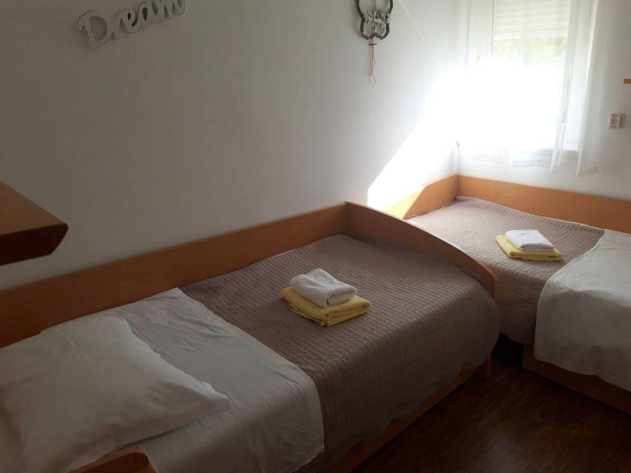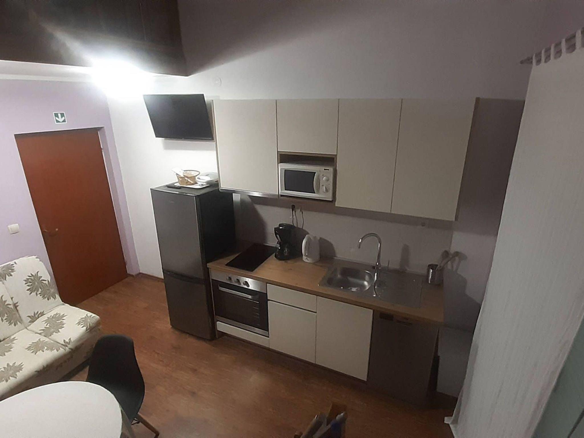 Apartment "Violet" consists of two double bedrooms, a living room and a kitchen, a bathroom with a shower and a toilet, and a balcony. The apartment has free wireless internet access, satellite TV, and air conditioning. The accommodation is located in a house with several apartments on a plot of 1500 m2, surrounded by a garden full of greenery and flowers, an outdoor swimming pool measuring 9m x 4m with a depth of 1.20m - 1.60m, deck chairs, and a loggia. If you want to prepare a meal at home, you can do so in the kitchen equipped with an electric stove, refrigerator, microwave, kettle, coffee maker, and dishes. You can also prepare food in the loggia on the outdoor grill, which is equipped with dishes, a gas stove, and a dishwasher. Both bedrooms are doubles and can accommodate four adults, and in one room, the beds can be separated. You have a reserved parking space in front of the house.