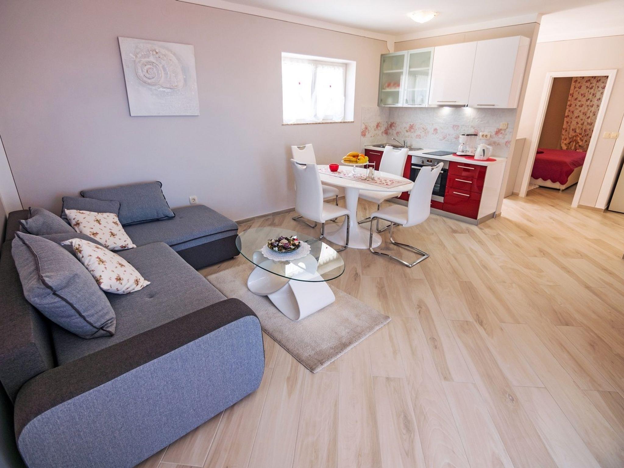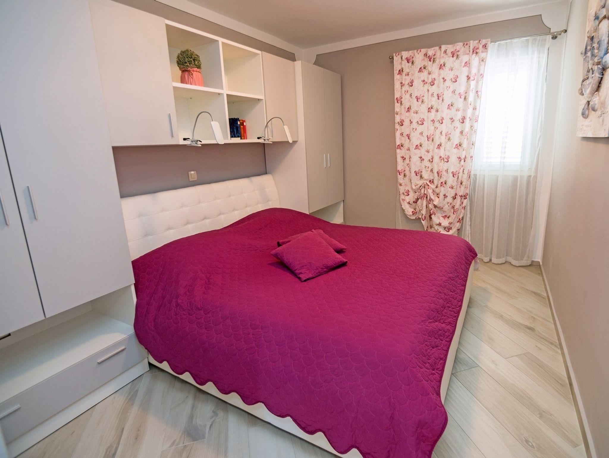 Ferienwohnung bietet Platz für 4 Gäste. Die Betten sind in Schlafzimmern, die es 1 gibt, und in Wohnzimmer, innerhalb einer Gesamtfläche von 52m2, angeordnet. Die Gäste haben einen eigenen Balkon zur Verfügung, auf der sie in warmen Sommernächten genießen können. Das Apartment bietet Meerblick. Es ist erlaubt, Speisen auf dem Gemeinschafts-Grill vorzubereiten. Während ihres Aufenthalts können Gäste das gemeinsam zur Nutzung stehende Schwimmbad benutzen. IM PREIS INBEGRIFFEN: Kurtaxe, Endreinigung, Klimatisierung, Pool, Parkplatz, Internet, Kinderbett, Bügeleisen, Föhn, Sonnenschirm, Liegestühle. VERBINDLICHE ZUSÄTZLICHE KOSTEN: Aufzahlung für Kurzaufenthalte (prozentualer Zuschlag pro Nächtigungsanzahl: 30% - 1, 20% - 2, 10% - 3). UNVERBINDLICHE ZUSÄTZLICHE KOSTEN: Frühstück (13,00 €, 50% Nachlass für Kinder zwischen 4 und 12 Jahren, Kinder bis 4 Jahre sind frei.), Bootsanlegeplatz (5,00 € pro Nacht), Zusatzbett (10,00 € pro Nacht). Die Verfügbarkeit zusätzlicher Dienstleistungen in Ihrem reservierten Termin und die Preise derselben (falls nicht aufgeführt) müssen im Voraus überprüft werden. Zusätzliche Dienstleistungen die in der Zahlungsaufforderung nicht aufgeführt sind werden direkt beim Vermieter bezahlt, angenommen der Gast nutzt auch diese.