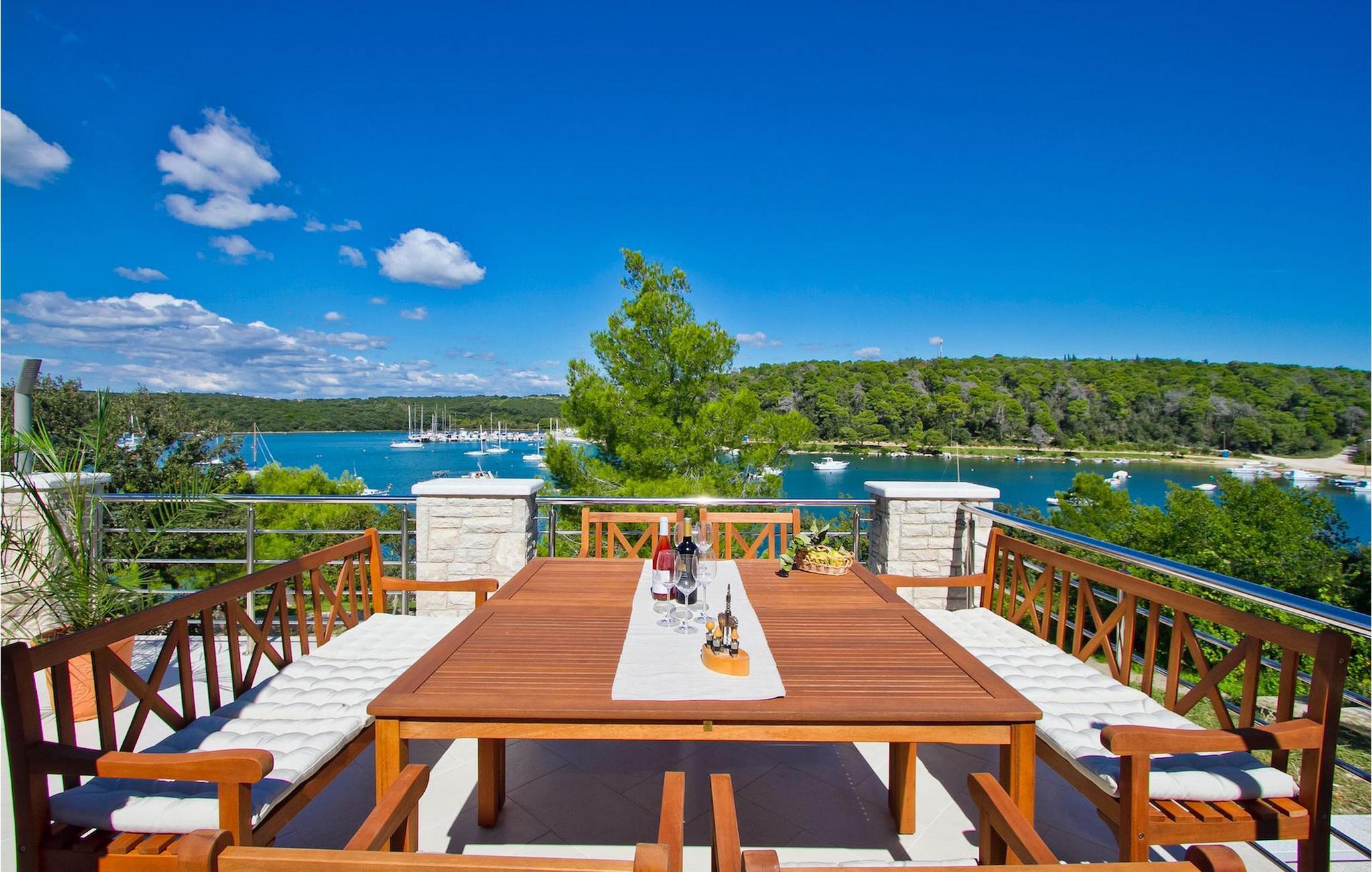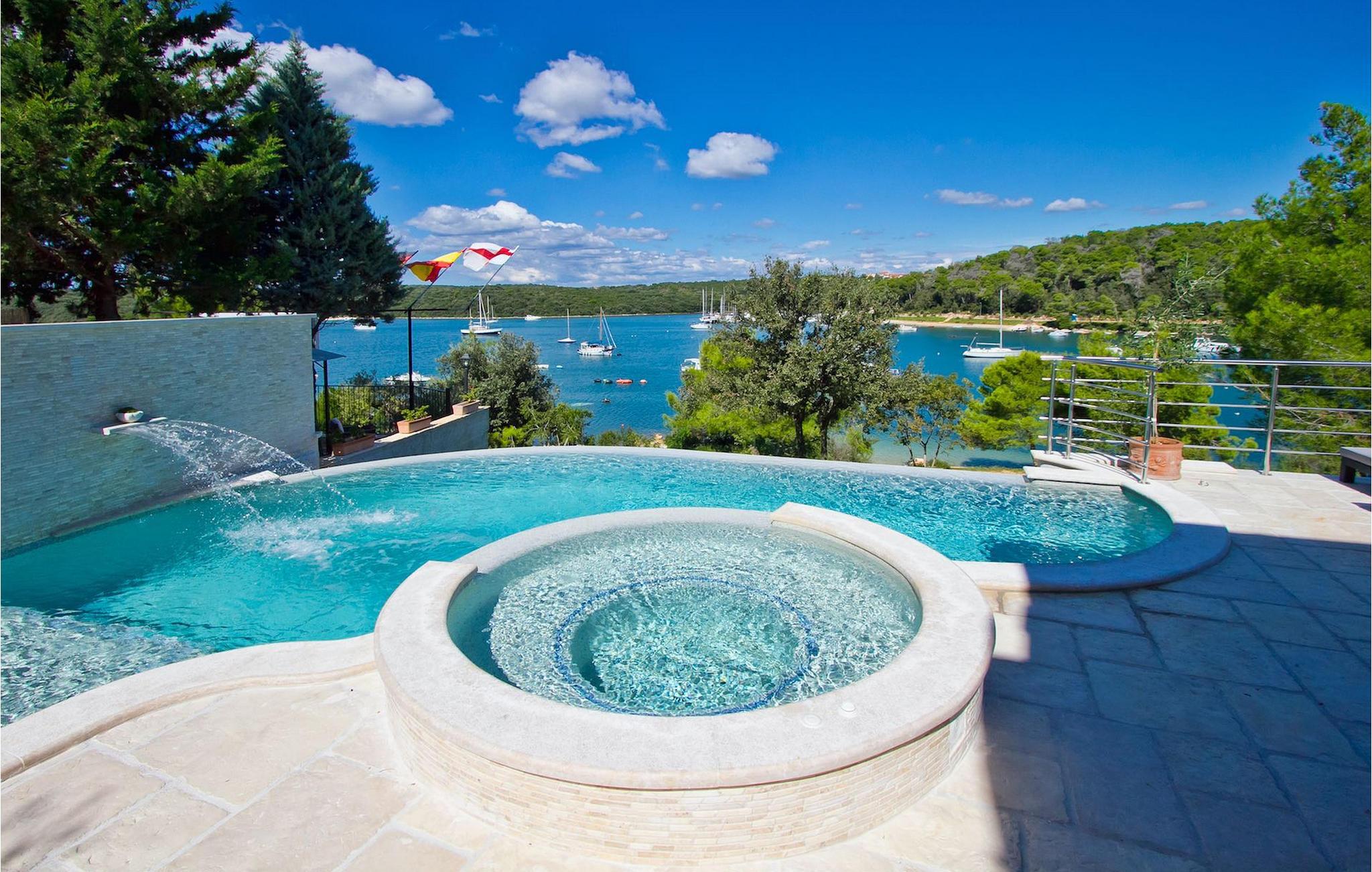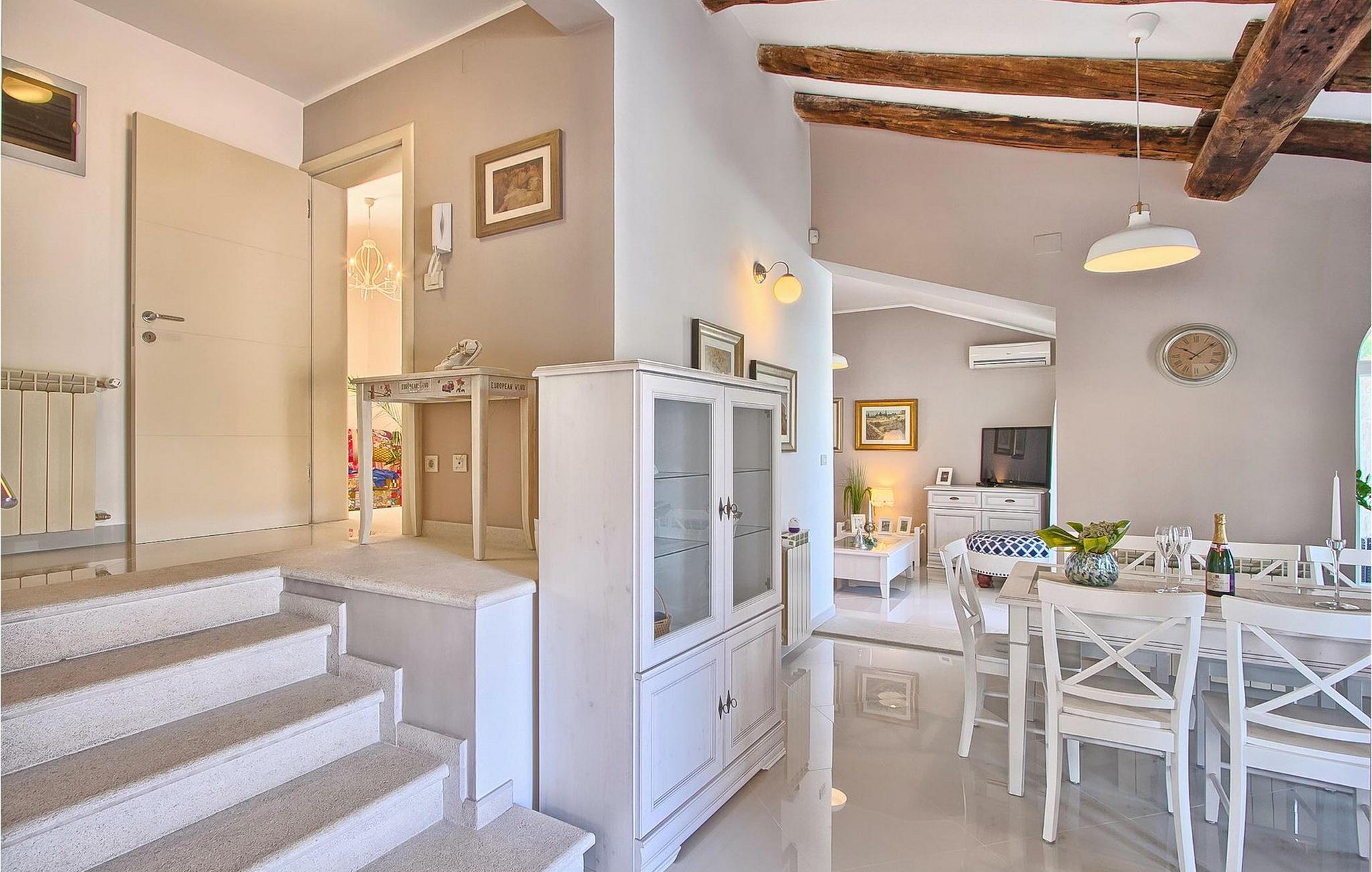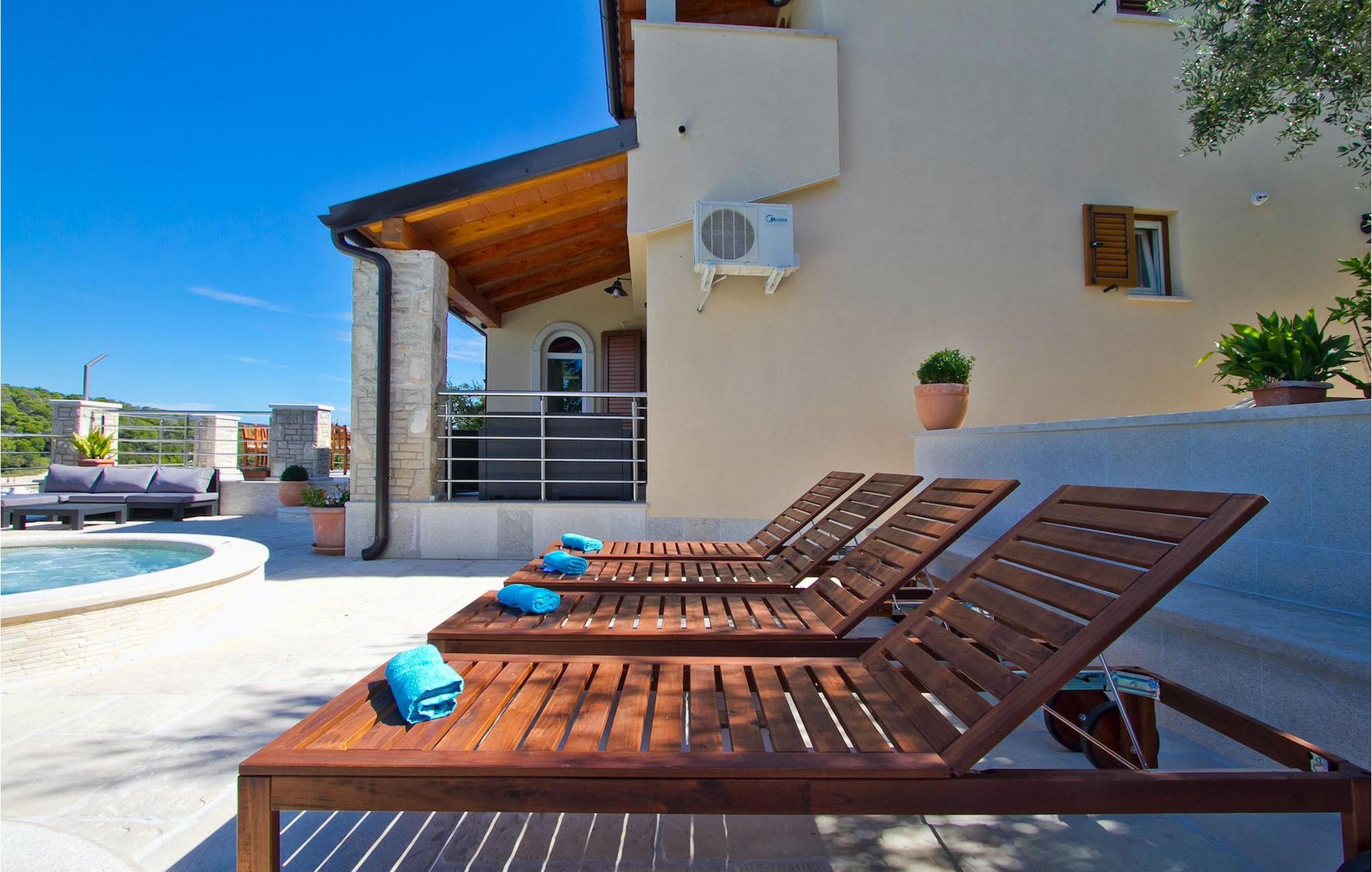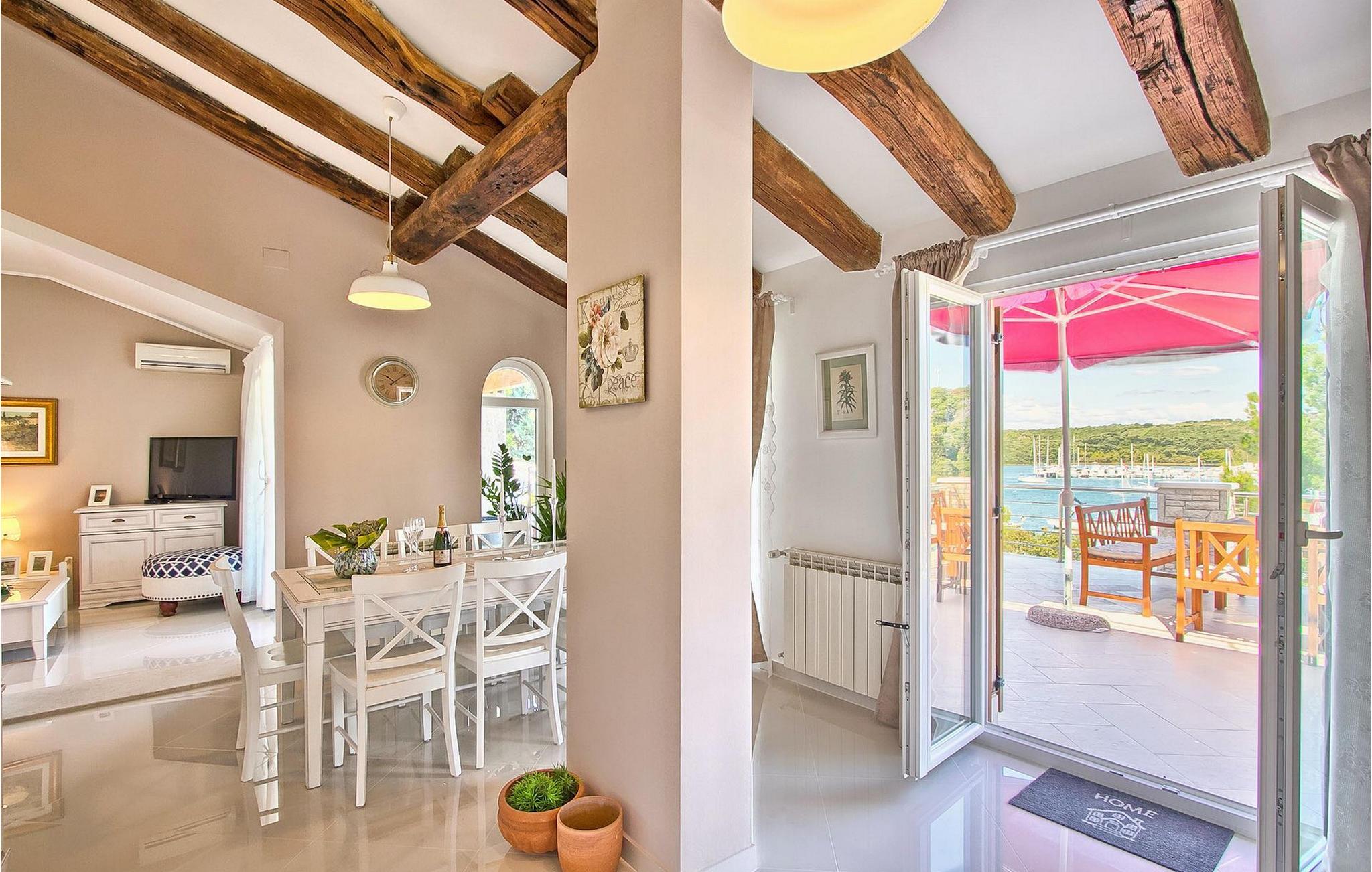 Den charmerende Villa Avemar i Banjole nær Pula er perfekt til en drømmeferie med familie og venner. Dens fem smagfuldt indrettede soveværelser fordelt på to etager kan rumme op til 8+1 gæster. Interiøret er lyst og luftigt, men stadig hyggeligt takket være træbjælkerne. Den smarte stue, spiseplads og fuldt udstyret køkken er forbundet. I stueetagen finder du to soveværelser med dobbeltsenge, et af dem med eget badeværelse. Her er også et ekstra badeværelse og et toilet. Den øverste etage rummer to soveværelser med dobbeltsenge med eget badeværelse og et enkelt soveværelse. Et af dobbeltværelserne på øverste etage har en privat terrasse med en fantastisk udsigt over bugten. Udendørsområdet er meget godt designet og rummeligt. På flere forskellige niveauer og separate terrasser kan du nyde dit privatliv eller tilbringe timer sammen med dine kære. Du vil være meget tilbageholdende med at forlade den vidunderlige pool på varme sommerdage, for her kan du slappe af med den fantastiske udsigt over Soline-bugten med dens yachter og fiskerbåde og en kølig drink i hånden! Vil du dog til stranden, er den kun 30 m væk. Hvis du kan lide gruppeaktiviteter, har du et bord til bordtennis og bordfodbold til din rådighed. Villa Avemar ligger direkte ved stranden. Havet er uden tvivl hovedattraktionen i dette hjørne af paradis. Den lille fiskerby Banjole ligger på en lille halvø med en naturligt beskyttet havn, det er det perfekte sted at nyde havet, sejle og for fiskeentusiaster. Her er ingen trafikpropper eller store hotelkomplekser, og stadig har du alt, hvad du skal bruge. Hvis du kan lide sport, kan du vælge mellem mange sportsaktiviteter. Istrien-halvøen er også hjemsted for en af de smukkeste nationalparker i denne del af Europa - Brijuni. Det kan nås med 10 min bådtur med afgang fra den hyggelige fiskerby Fazana, kun 15 kilometer væk fra villaen. Villa Avemar er den ideelle villa, hvis du leder efter en bolig, der er tæt nok på alle byens bekvemmeligheder, men som samtidig tilbyder et tilbagetog og al den komfort, du har brug for.