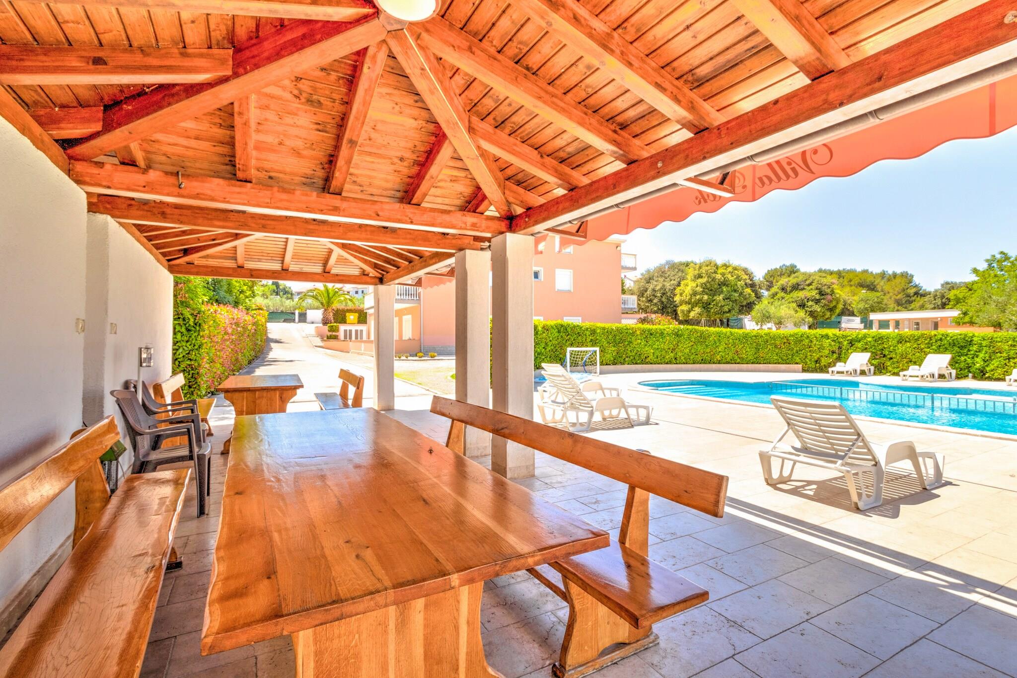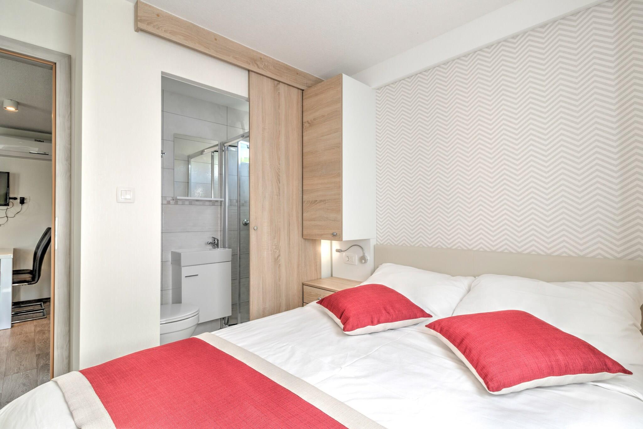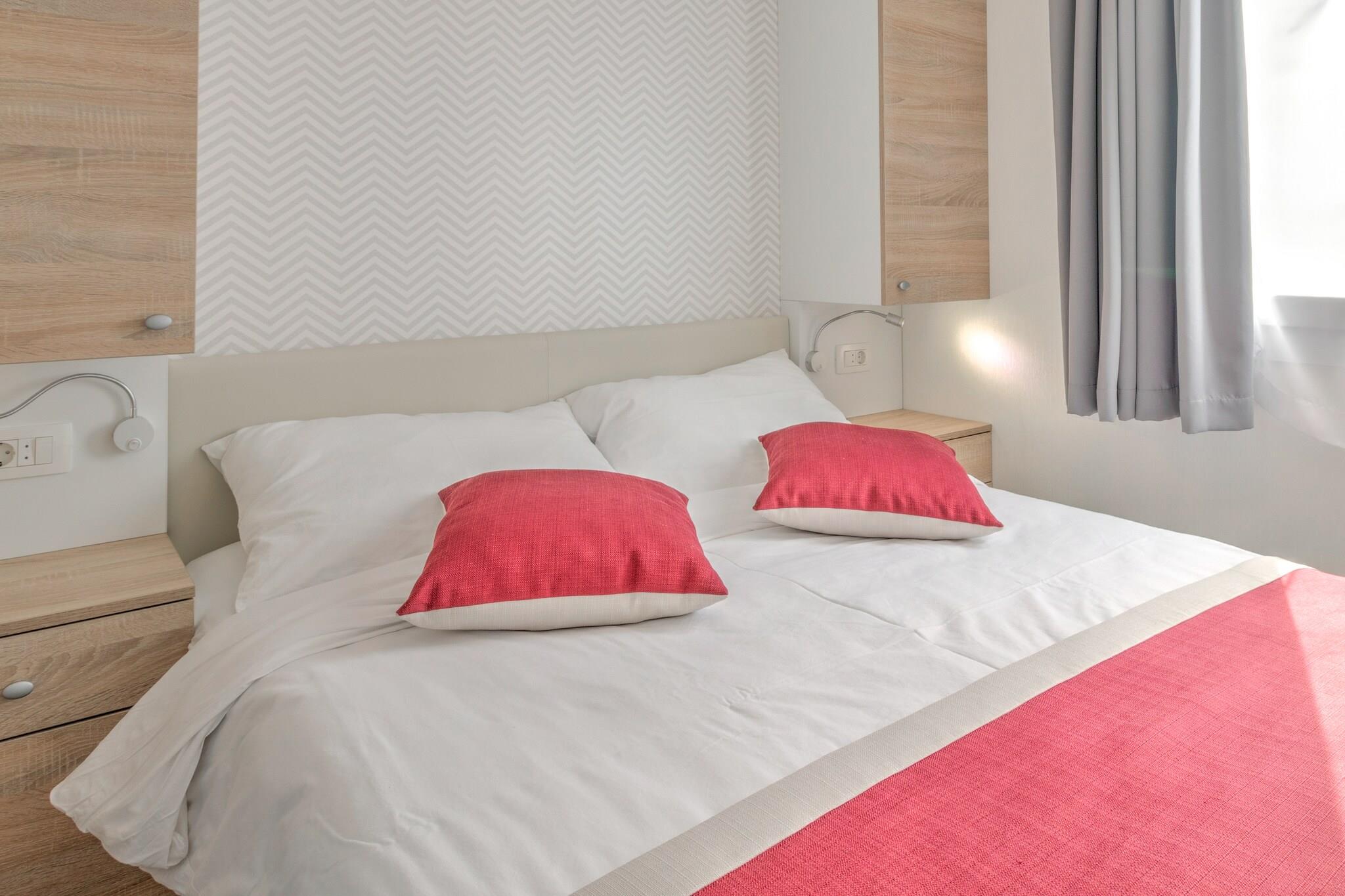 Flygt til Banjoles fredfyldte kyster, hvor dette kæledyrsvenlige mobilhome til seks gæster tilbyder en perfekt blanding af afslapning og eventyr. Kun 1 km fra stranden og 2 km fra Pula er dette tilflugtssted ideelt for dem, der søger komfort, natur og kulturel udforskning. Uanset om du slapper af på den solbeskinnede terrasse, nyder udendørsaktiviteter eller udforsker historiske vartegn, lover denne kystparadis et uforglemmeligt ophold. Indenfor har huset en rummelig stue og soveværelse med en dobbelt sovesofa, tv og aircondition, et veludstyret køkken med elkedel, kogende vandhane, kaffemaskine, mikrobølgeovn, opvaskemaskine og køleskab samt et soveværelse med køjesenge eller to enkeltsenge. Soveværelset har en kingsize-seng og et eget badeværelse med badekar eller bruser og toilet, suppleret af et ekstra badeværelse for nemheds skyld. Udendørs kan gæsterne slappe af på terrassen med havemøbler, liggestole og grill, eller nyde trampolinen, tennisbanen, fodboldmålet og legeredskaberne. I nærheden ligger Augustus-templet med udsøgt romersk arkitektur, mens Brijuni-øerne byder på betagende natur og historiske skatte. Gå en tur gennem Sergii-buen, en storslået triumfbue fra oldtiden. For at spise kan du forkæle dig selv på Konoba Batelina, kendt for frisk fisk og skaldyr, eller nyde lokale delikatesser på Barka Bistro.