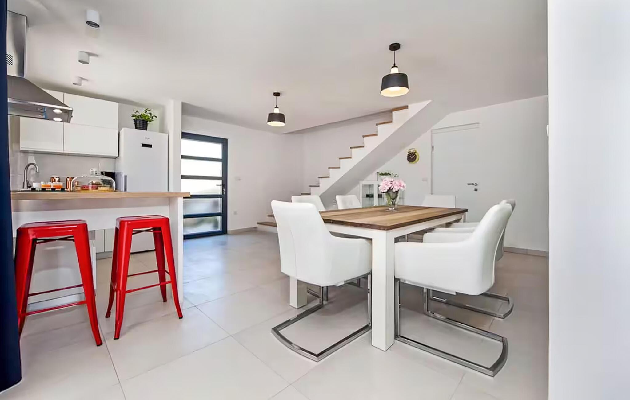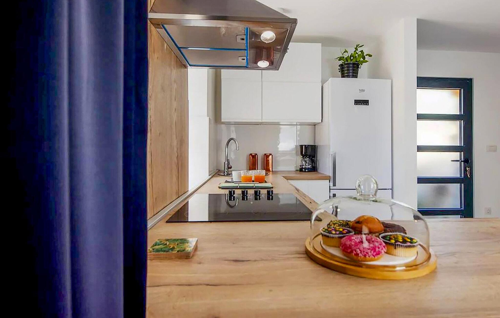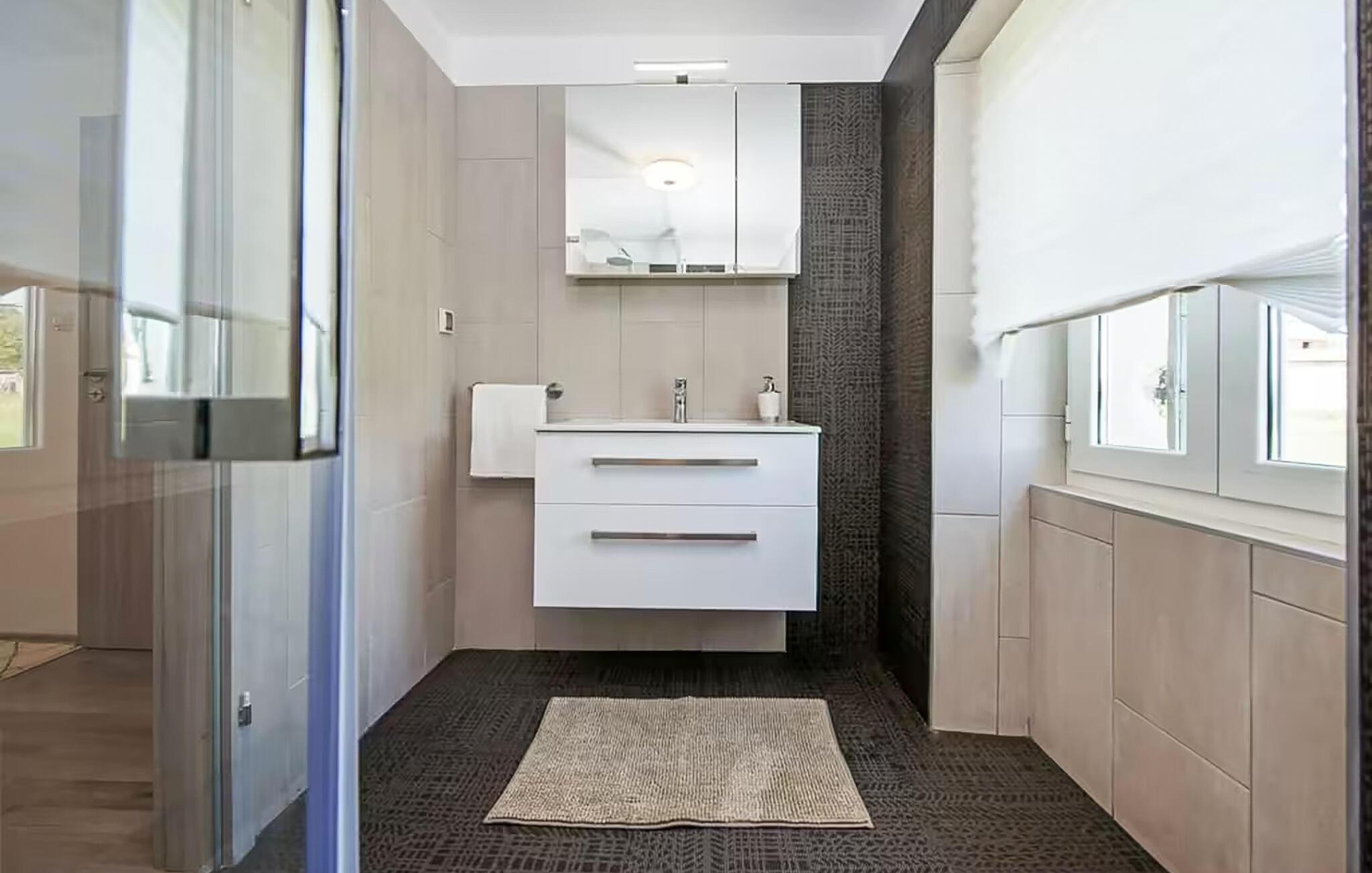 Dette moderne hus kombinerer elegance og komfort på harmonisk vis. Diskrete farver, elementer af natursten og træ samt et komfortabelt sofaområde sikrer et uforglemmeligt ophold, hvor I hurtigt kan lade batterierne op. Uanset om I streamer en god serier eller lytter til en interessant podcast, sætter I selv tempoet for dagen her.