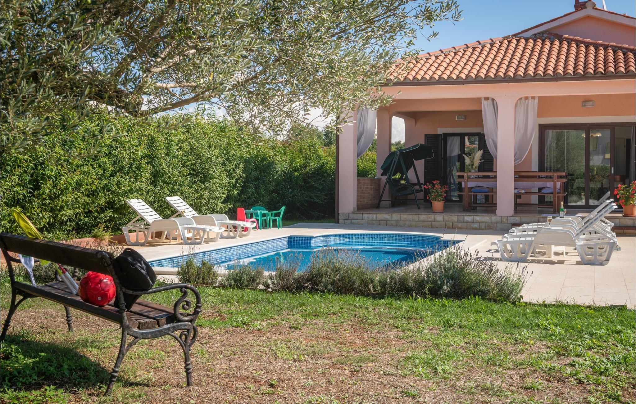 Dette dejlige hus bygget i 2003 med pool ligger i rolige omgivelser i landsbyen Grandici, nær den større by Barban. Huset er indrettet med pæne og komfortable møbler i lyse og venlige farver. I stueetagen er tre soveværelser, to badeværelser og en stor opholdsstue med kamin. På første sal er der yderligere et soveværelse med eget bad. Til hyggelige timer udenfor har I jeres helt egen konoba. På den store indhegnede grund er der en skøn swimmingpool og en overdækket terrasse med solstole. Her kan I nyde de lange varme sommerdage og slutte dagen af med at tilberede et måltid på husets grill. I haven er der desuden en volleyball bane, hvor gæsterne kan spille. I værelse 5 er der tekøkken. Strande ved Krnica, Duga uvala eller i bugten Blaz vil bestemt begejstre jer. Vi anbefaler også et besøg i de større centre som Pula, Rovinj, Porec eller Rabac. Mod gebyr aftales med ejerne, at i kan smage lokale specialiteter, fx skinke, vin, snaps, olivenolie, frisk frugt og grøntsager.
