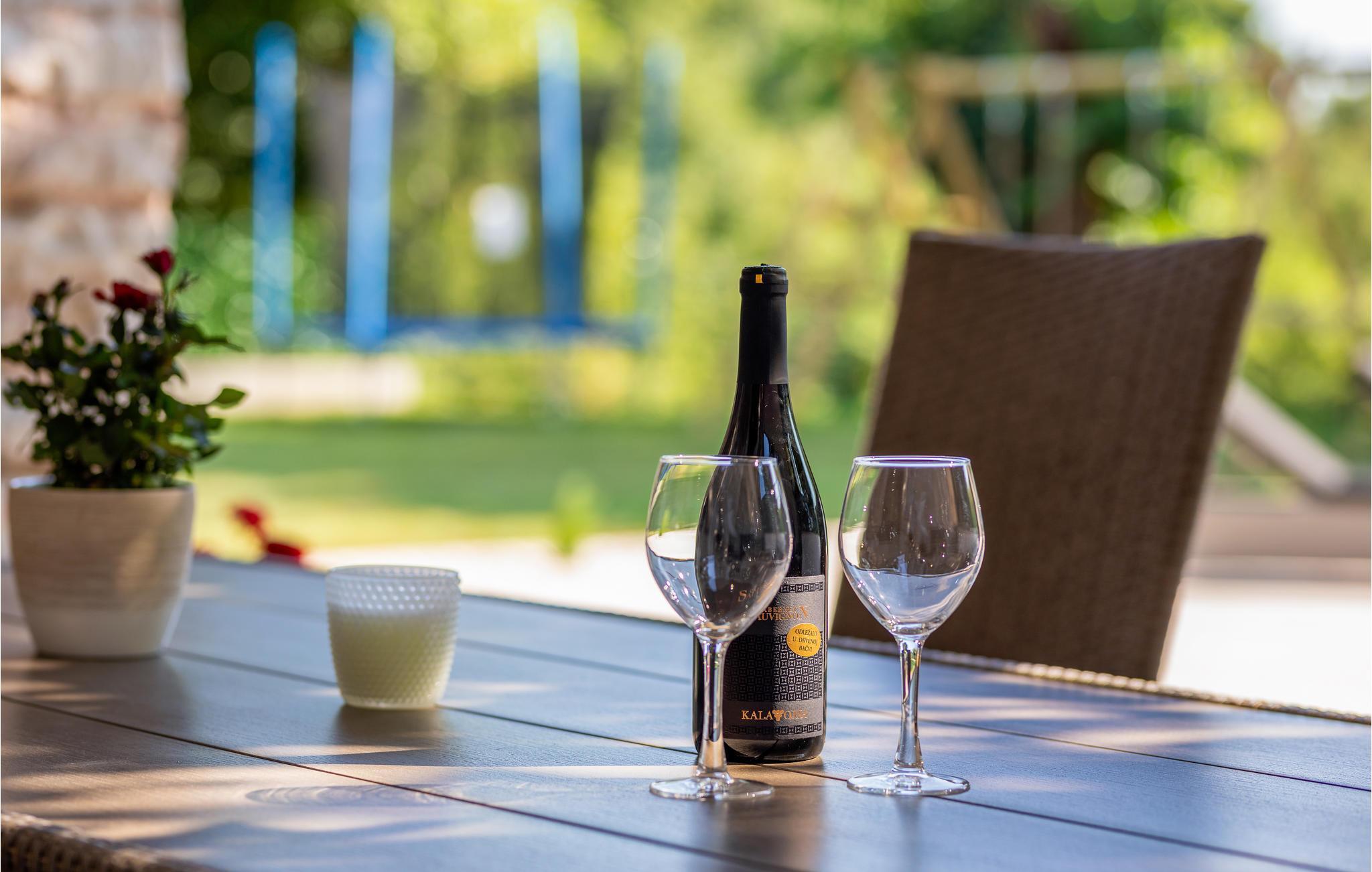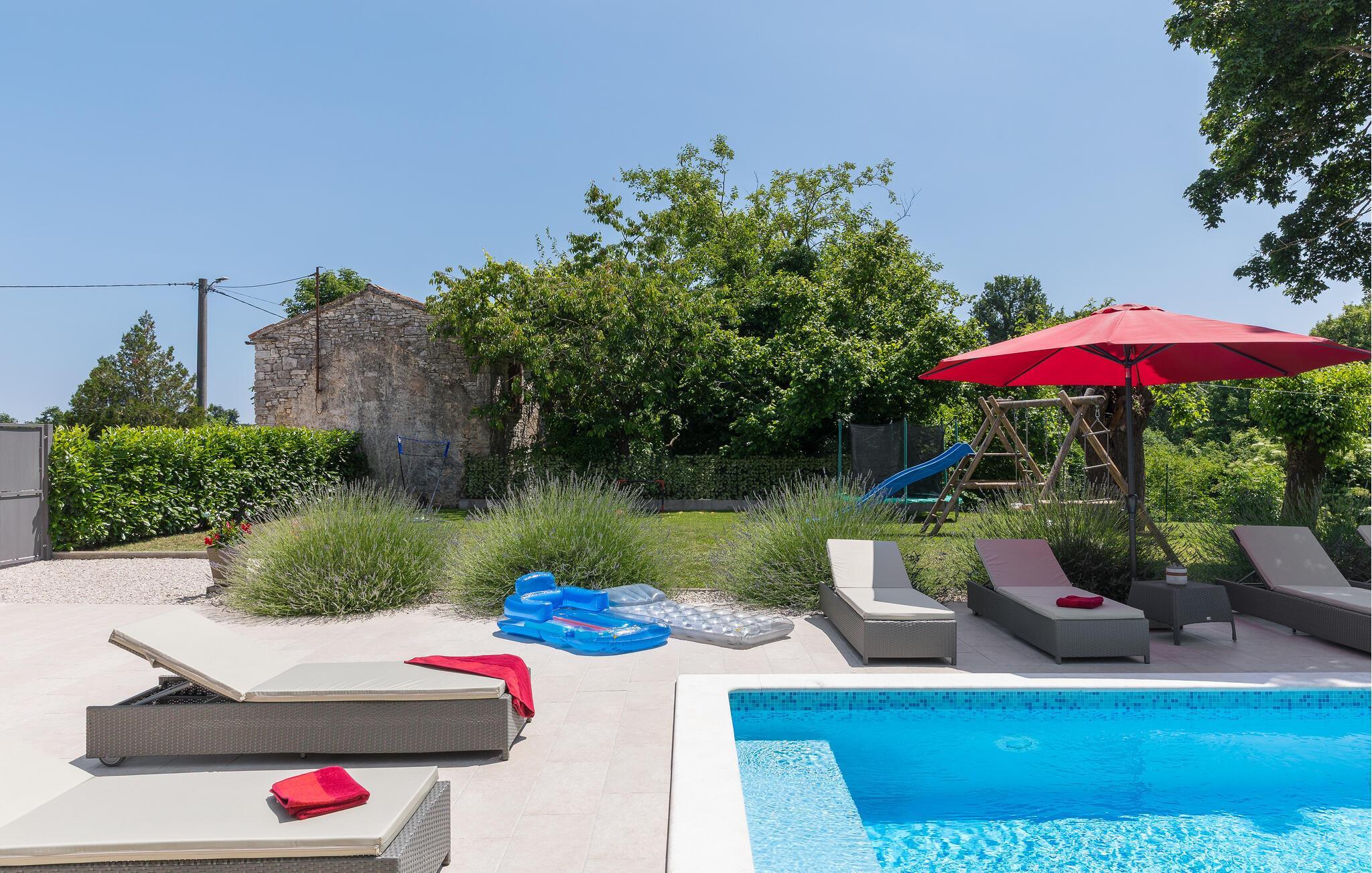 Den lukkede have har en swimmingpool med en stor solterrasse og en græsplæne med faciliteter til børn samt sports- og underholdningsudstyr.