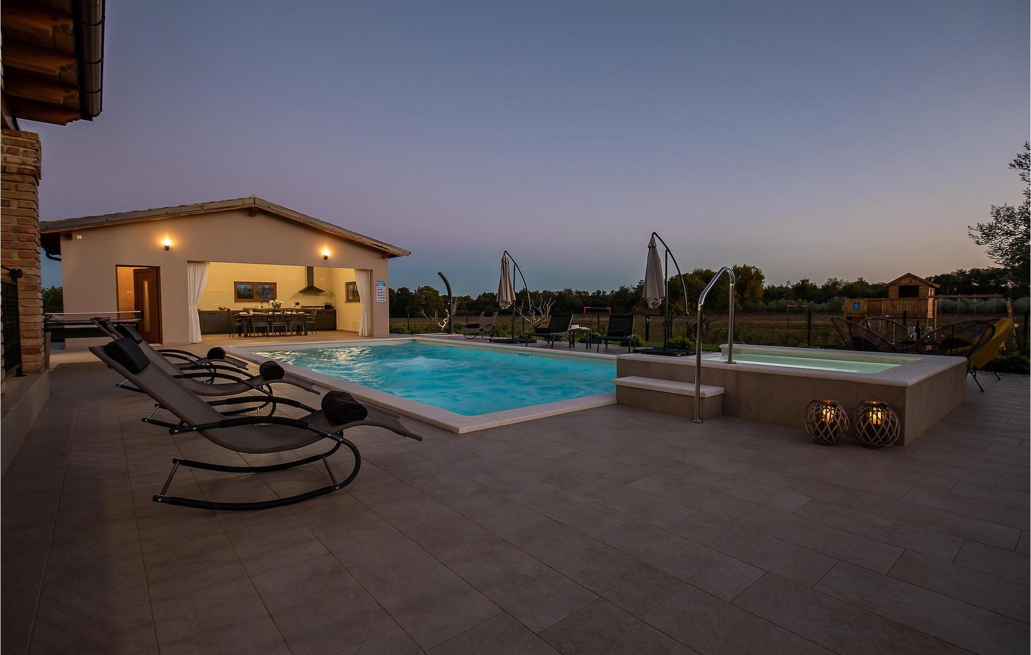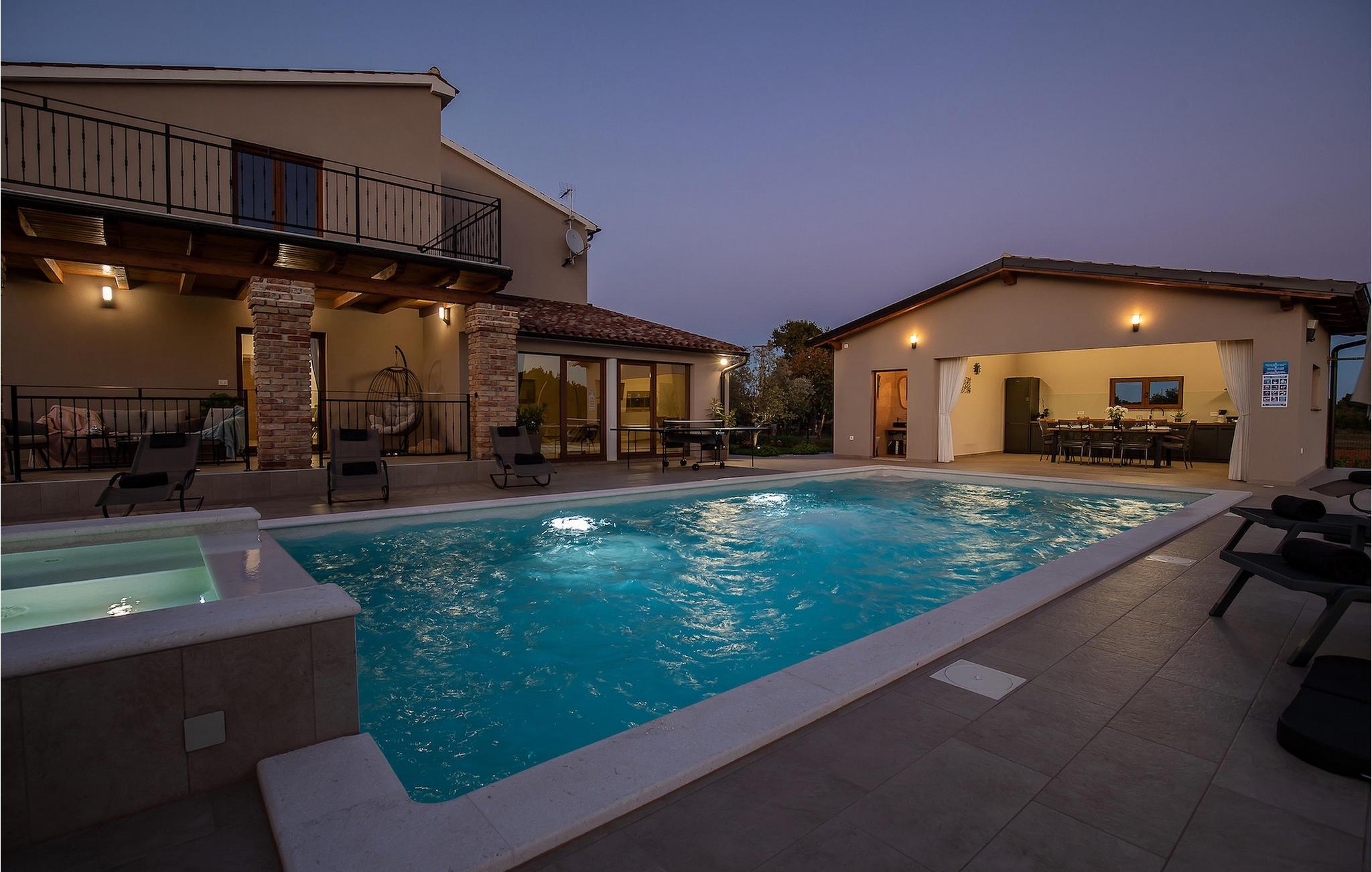 Opholdsområdet har direkte adgang til det udendørs område med pool og en charmerende terrasse. Den vidunderlige pool har også et jacuzzi-område, hvor du kan slappe af og drikke et glas kold drik. Der er et overdækket udendørs fuldt udstyret køkken med spiseplads til 8 gæster og udsigt over poolområdet. Terrassen er også et godt sted for en eller to runde bordtennis.