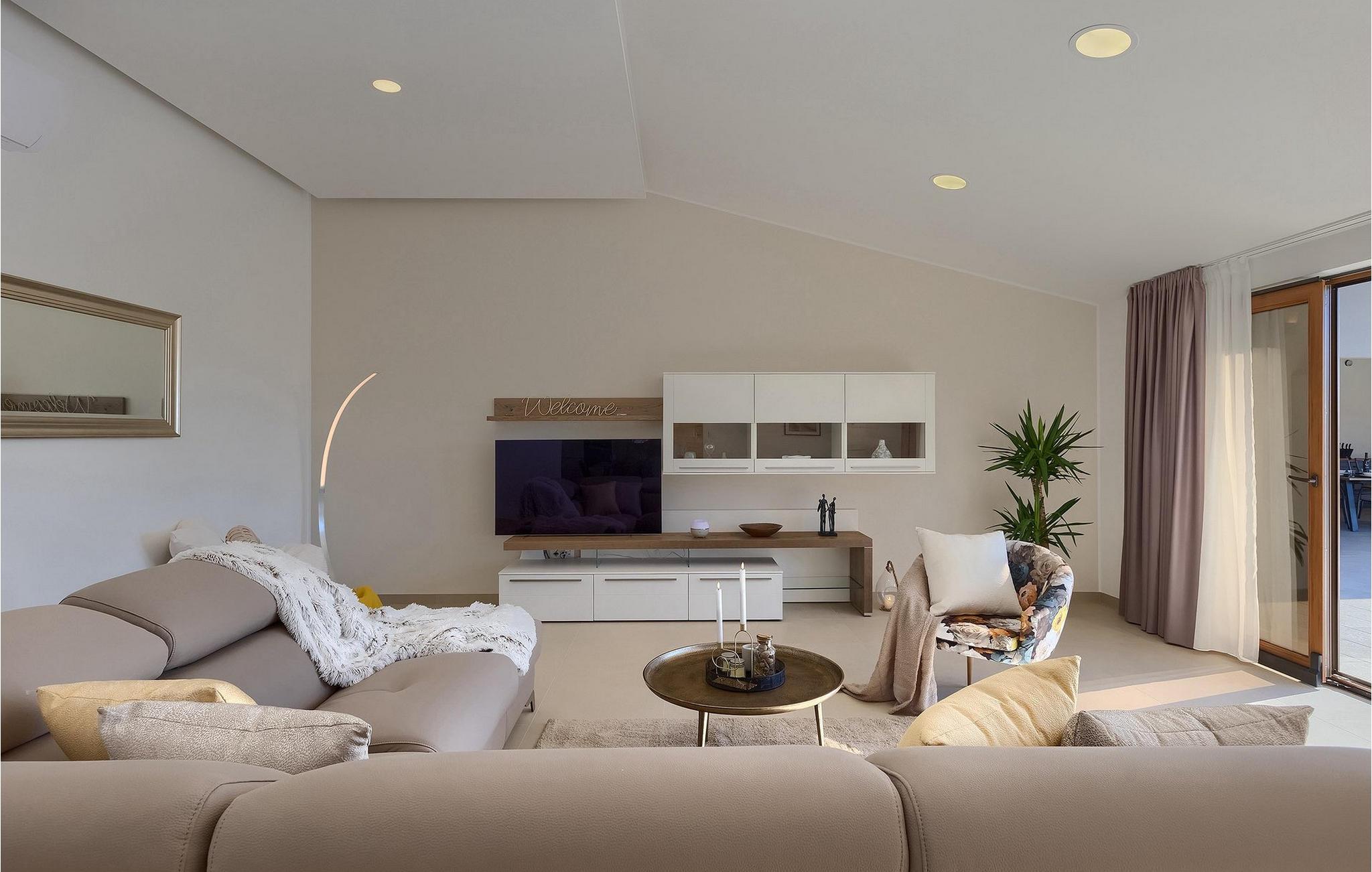 Huset består af to etager, men kun stueetagen udlejes, hvorimod første sal er lukket. Villaen er kendetegnet ved sit lyse interiør med bløde, afslappende farver. Alle faciliteterne er placeret i stueetagen, som består af 3 soveværelser med dobbeltsenge, 3 badeværelser, et med badekar og to med bruser, samt et åbent opholdsområde med fuldt udstyret køkken og spiseplads. Der er også en ekstra moderne indrettet taverna med pejs og et stort spisebord med bænke, som er fantastisk til at nyde lækre familiemåltider.