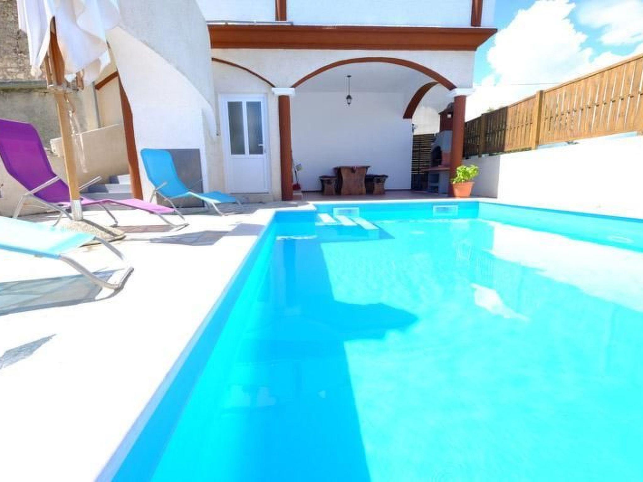 In the courtyard there is a 21 m² private pool with an outdoor shower, sun loungers and parasols. On the ground floor there is a terrace with a barbecue and a rustic wooden table with seating for up to eight people. The balcony with sea views on the upper floor can be reached via an external staircase and is furnished with a rattan seating area and parasol.