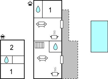 Huset består af to boligenheder, hvoraf det ene har to soveværelser på øverste etage og en stue i stueetagen. Den anden enhed har et soveværelse og en stue. Huset er således ideelt til to familier eller grupper af venner, der ønsker at holde ferie sammen og samtidig have privatliv.