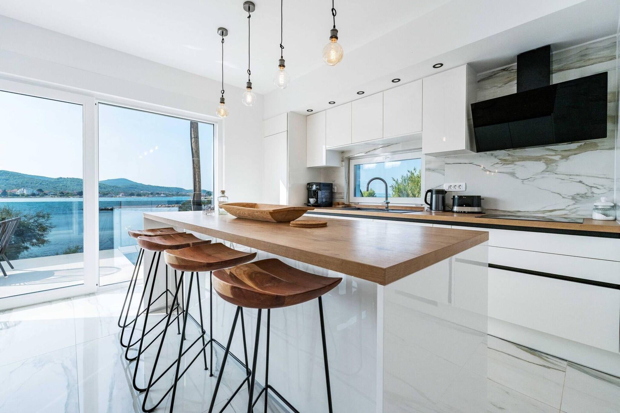Denne fantastiske villa ved havet ligger lige ved kanten af det glitrende Adriaterhav og tilbyder en forreste række til den dalmatiske kysts skønhed. Kun få skridt fra de blide bølger inviterer den dig til at vågne op til lyden af havet og afslutte hver dag med solnedgange, der maler horisonten i guld og rosa. Dette elegante fristed er designet til familier eller grupper på op til otte personer og kombinerer moderne komfort med det afslappede rytme i ø-livet. Villaen er fordelt på to etager, hvor lyse, luftige interiører møder panoramaudsigt over havet. I stueetagen flyder den åbne stue og spisestue problemfrit over i et fuldt udstyret køkken, hvilket skaber et varmt, socialt rum til samvær. Ovenpå sikrer fire stilfulde soveværelser med eget badeværelse privatliv og komfort, mens en altan med havudsigt tilbyder en fredfyldt oase. Alle værelser er omhyggeligt indrettede, har aircondition og er udstyret med tv for din bekvemmelighed. Udenfor går livet i et langsommere tempo. En opvarmet infinity-pool synes at flyde ud i havet, omgivet af liggestole, der er perfekte til dovne eftermiddage. Nyd måltiderne under den overdækkede terrasse, tilberedt i dit udekøkken med stenpejs, eller slap af i saunaen efter en svømmetur. Med et fitnesscenter, cykler og endda et paddleboard til rådighed er der masser af muligheder for at udforske og slappe af. Øen Pašman er en sand skjult perle, der er let tilgængelig med færge, men alligevel langt fra fastlandets travlhed. En sandstrand og legeplads ligger lige foran din villa, en café og et marked ligger i nærheden, og lokale restauranter venter inden for gåafstand. Her føles hvert øjeblik ubesværet – sol, hav og ro i perfekt harmoni.