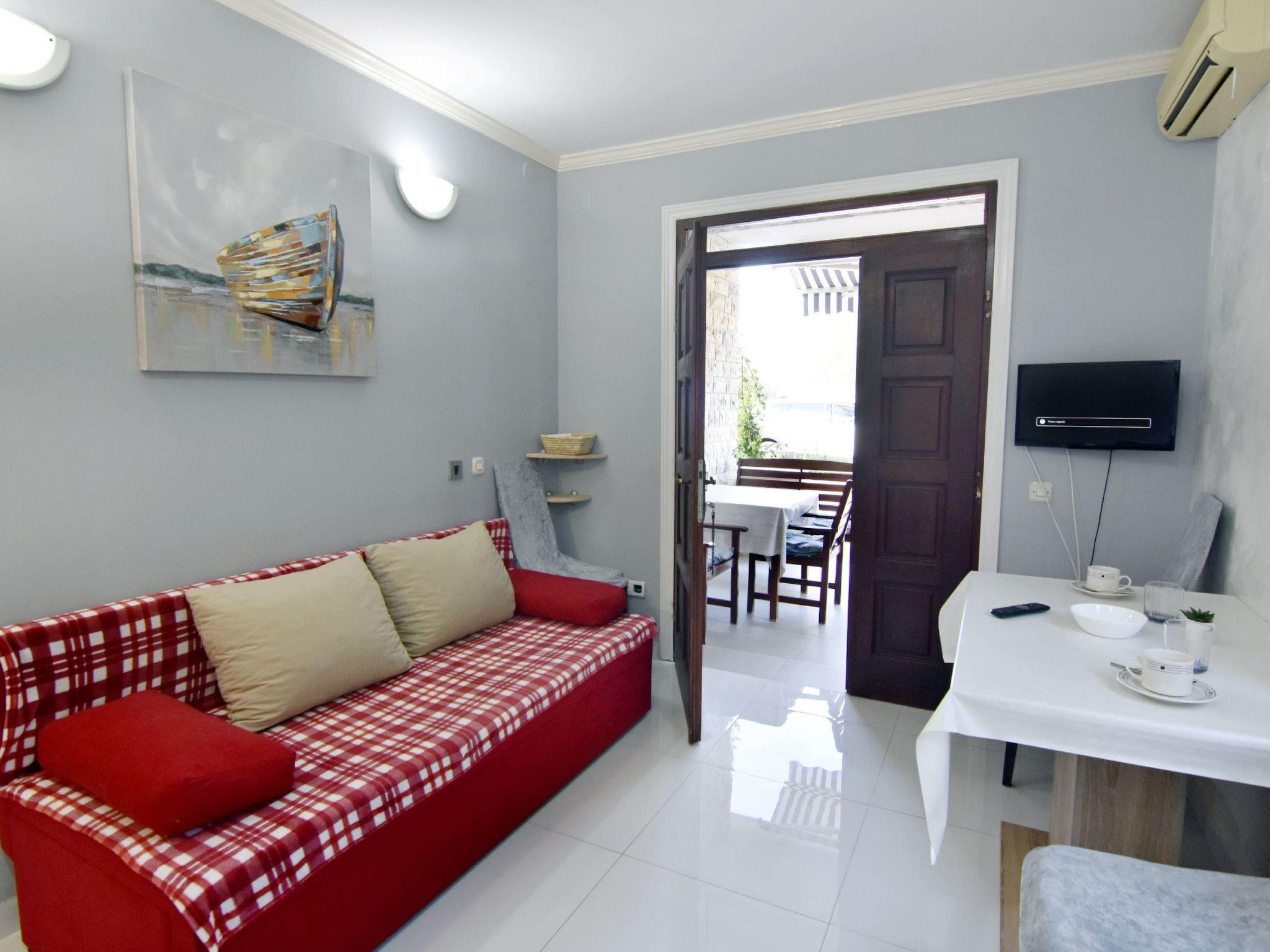 From the living room you can access a covered terrace with table and chairs, where you can enjoy pleasant moments outdoors.