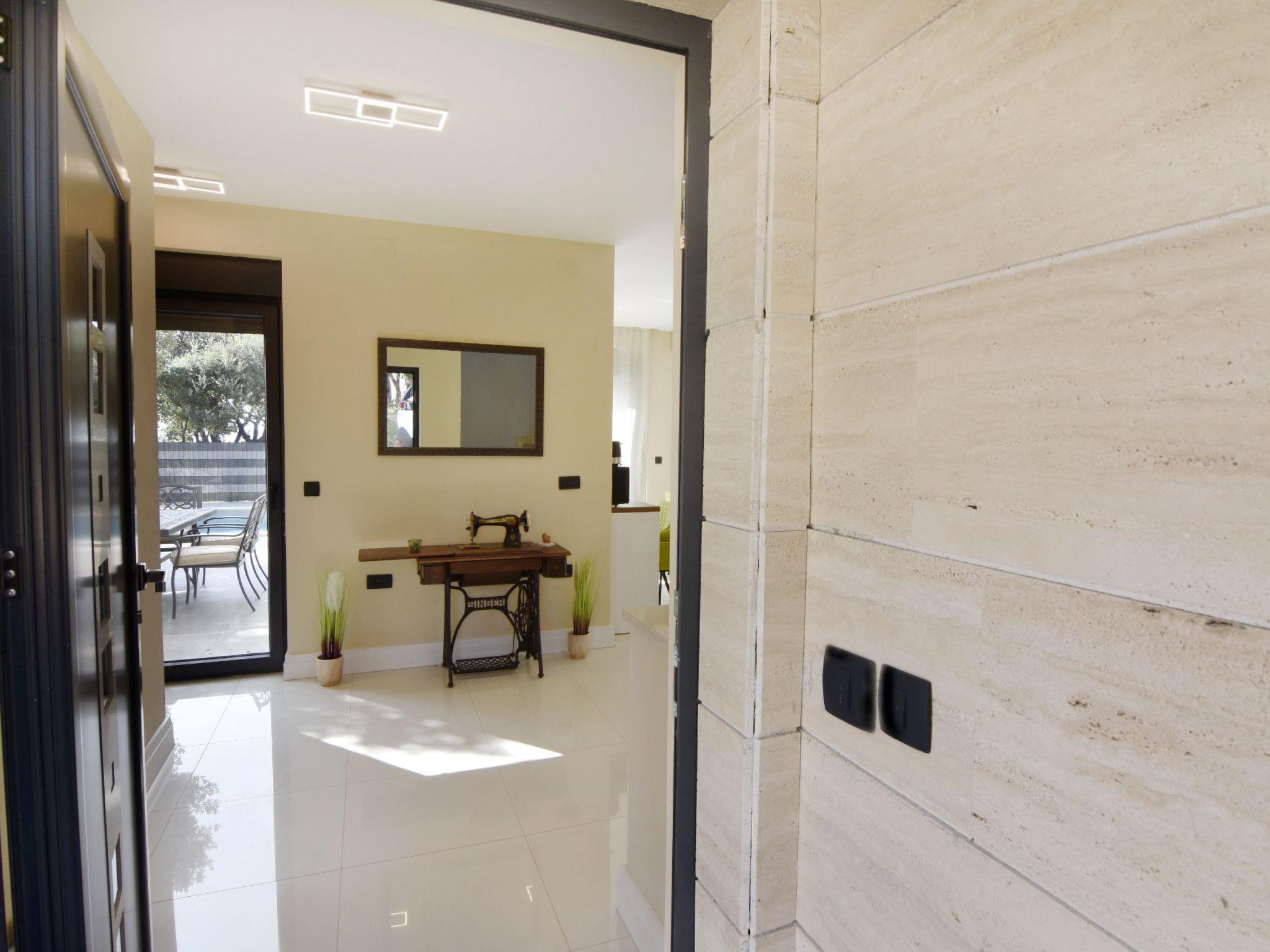 The ground floor welcomes guests with an entrance hall, a bathroom complete with shower and toilet, a large living room with dining area and an open plan kitchen, carefully designed to ensure a relaxing and enjoyable holiday. From here, two large exits lead to the terrace, which offers direct access to the swimming pool. The kitchen is fully equipped with a coffee machine, dishwasher, microwave, oven, 4-burner electric hob, fridge with freezer, kettle and extractor hood. A small island with two bar chairs completes the area. The dining area is equipped with a table and six comfortable chairs, while the living area boasts a comfortable sofa, a coffee table, a flat-screen satellite TV, free Wi-Fi, air conditioner, iron and ironing board ironing facilities, as well as a magnificent view of the swimming pool.