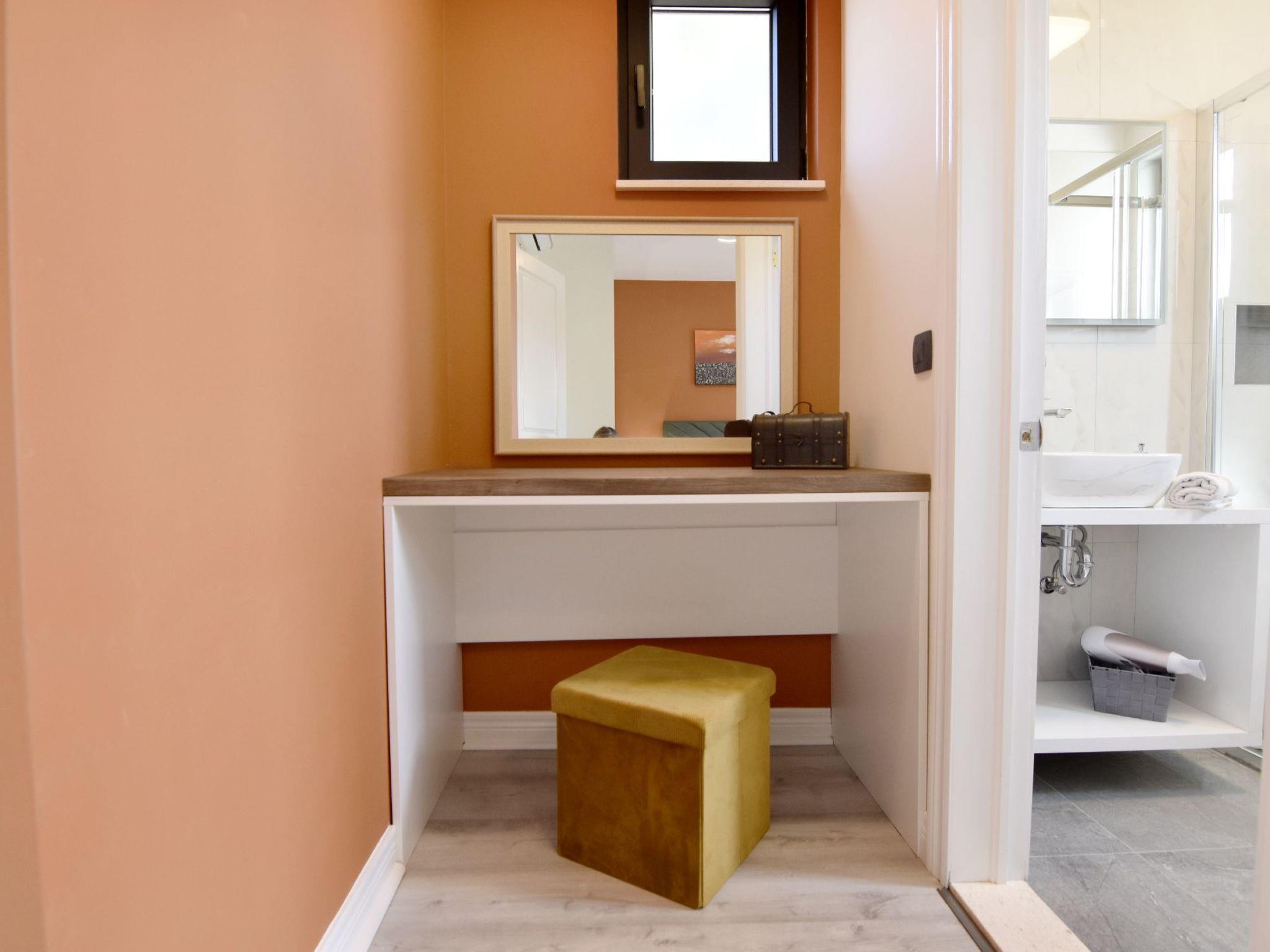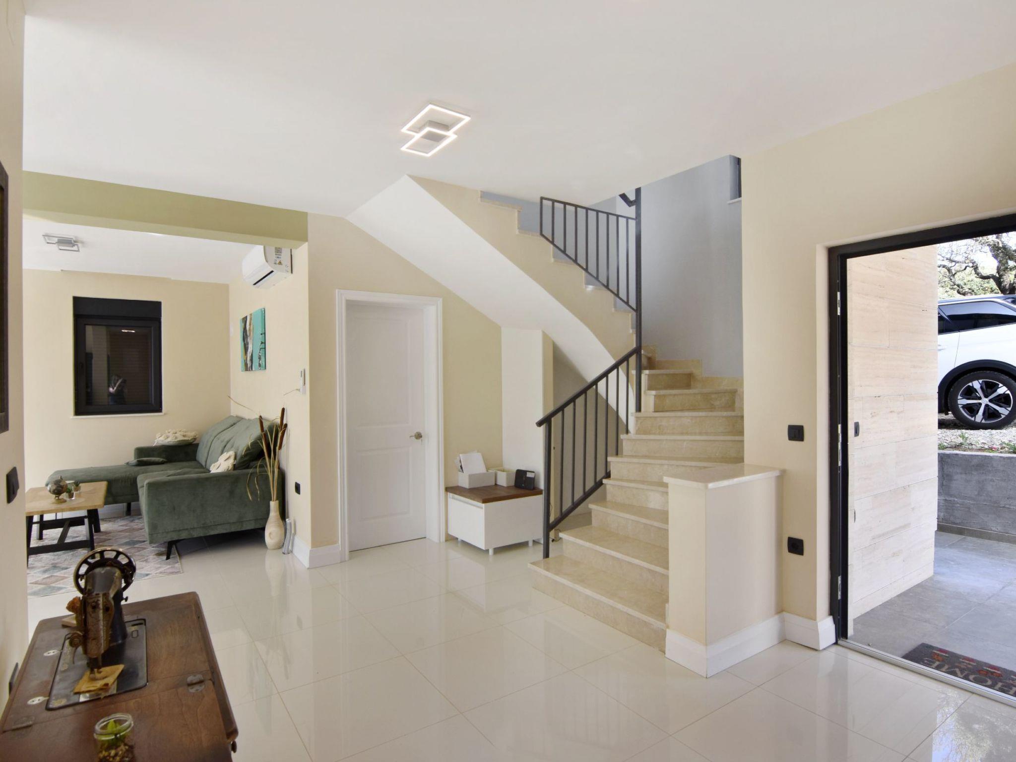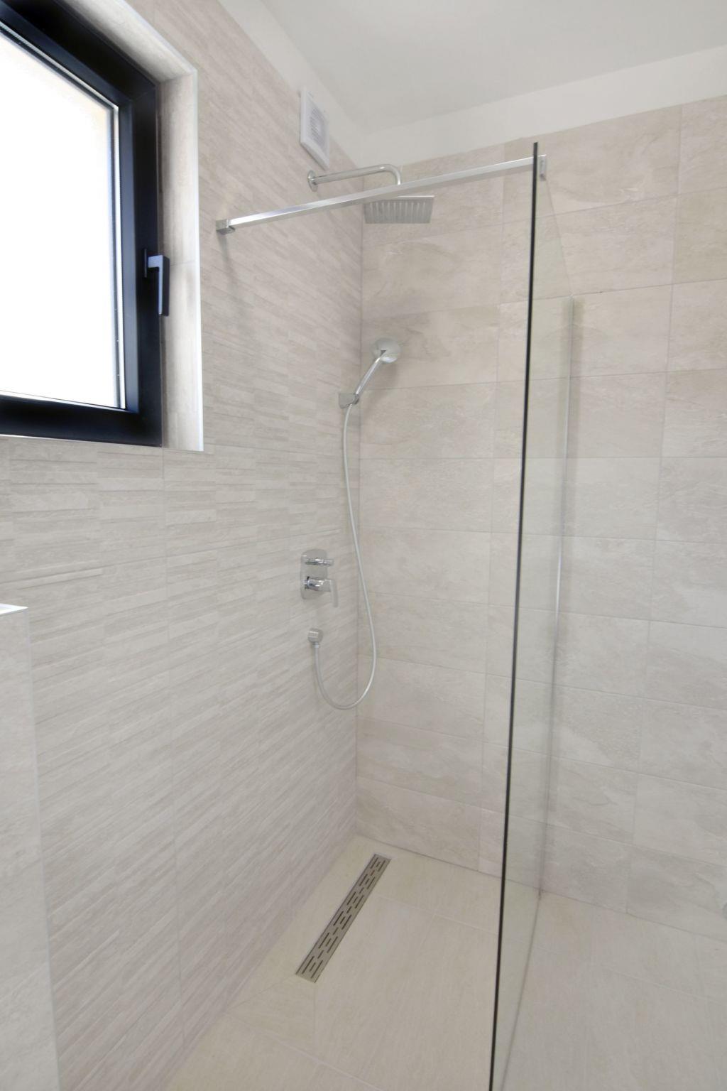 From the ground floor, an internal staircase leads to the rooms located on the first floor. The first bedroom, with a welcoming beauty corner for ladies, has a double bed and a private bathroom with shower cubicle, toilet, sink with cabinet and mirror, and hairdryer. Bath towels (two per person) and bed linen are provided. On the first floor, there are two further bedrooms, both with double beds, and a bathroom with shower, toilet and washbasin with mirror. All bedrooms are equipped with TV and air conditioner. Furthermore, on the first floor, you can enjoy a covered terrace furnished with armchairs and a table, offering a magnificent view of the surrounding nature and, in the distance, of the splendid Vrana Lake.