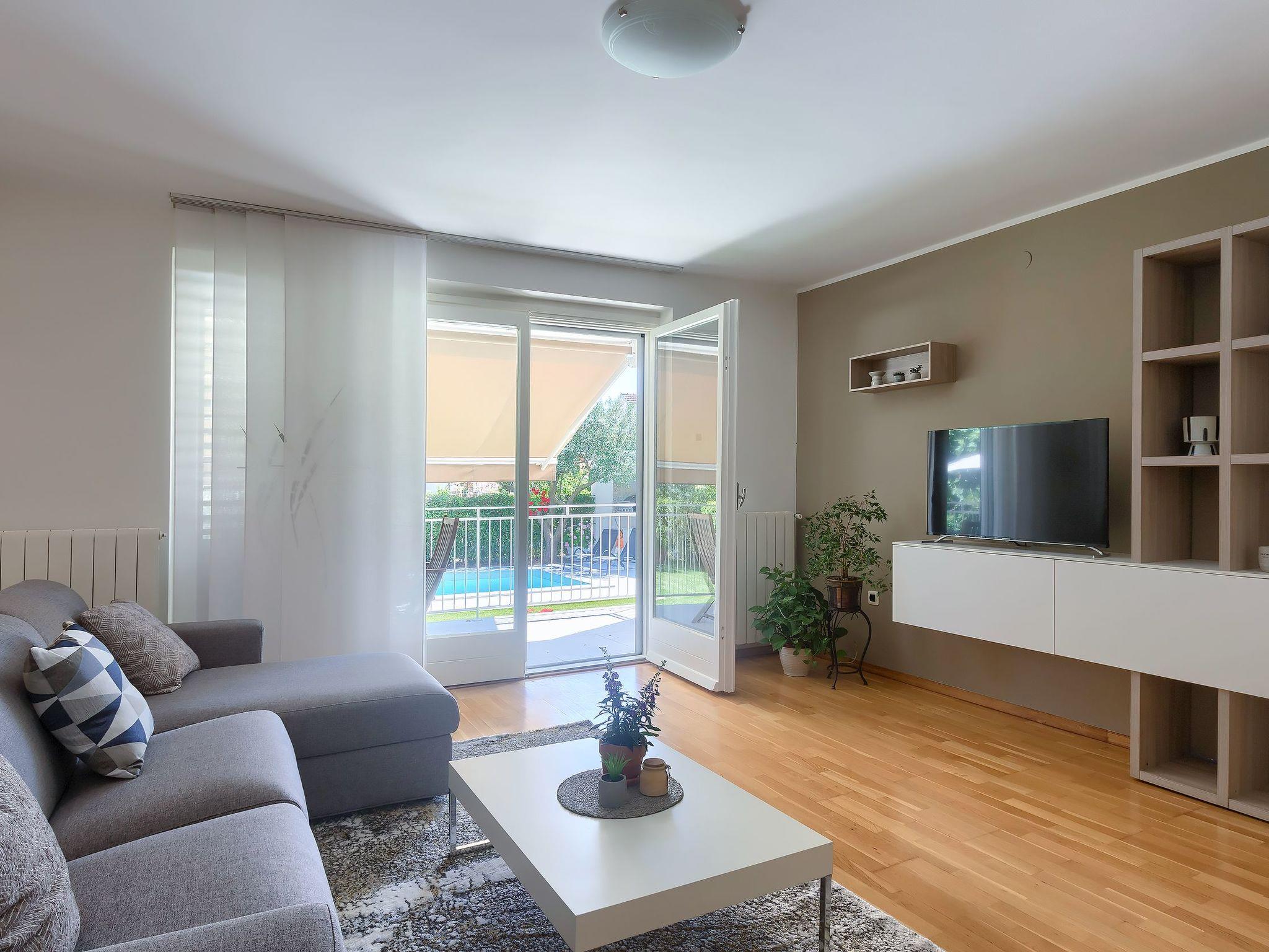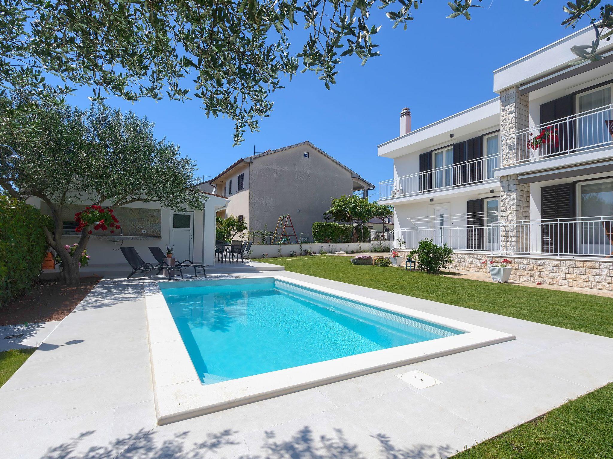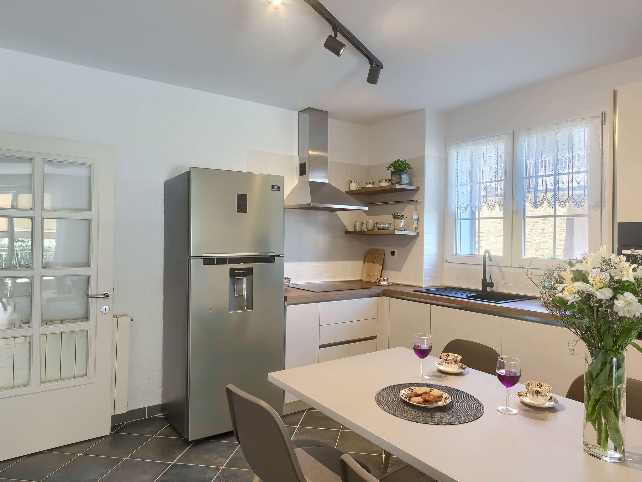 On the first floor, there is a bigger living room with a balcony, kitchen, and dining room. Two bedrooms with double bed (wardrobe, king size bed) and shared balcony. One large bathroom ( bathtub, bidet) and one toilet ( washing machine). (the first fllor suite for 5 person) The house has a fenced private parking for 3 cars and an electric gate. On the other side of the house, there is a beautiful fenced green garden with a private pool (6 deck chairs, 2 parasols) and an outdoor kitchen (outdoor grill, sink, gas stove, dining table).