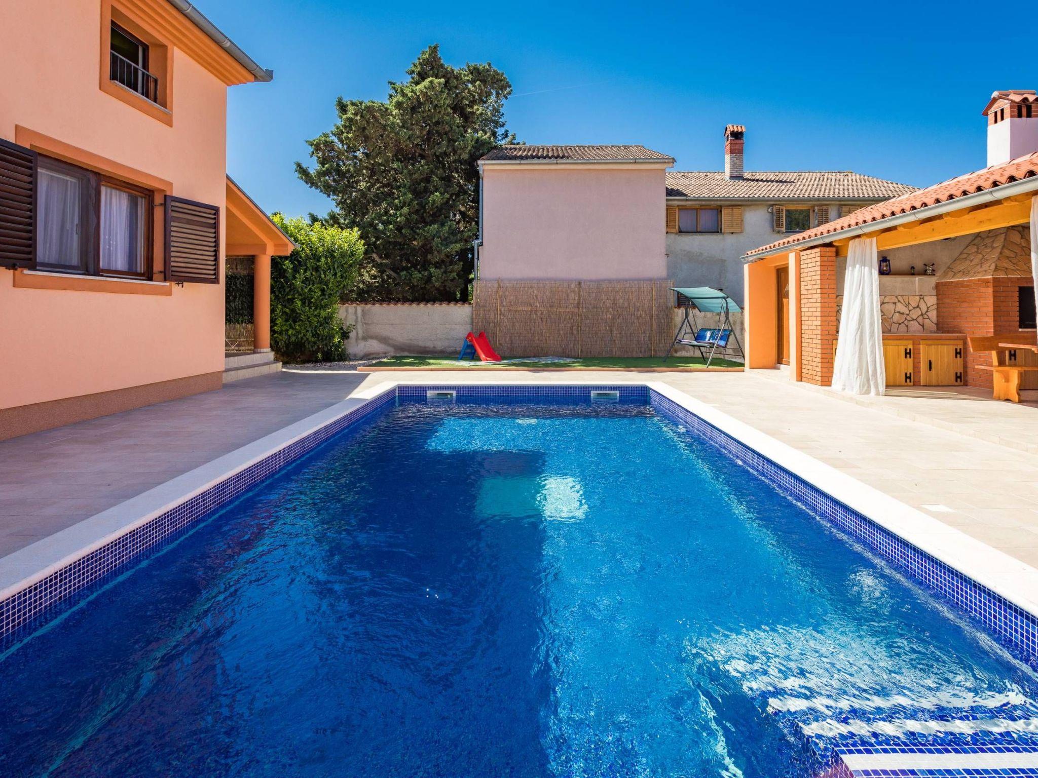 The fenced yard of 500 m2 contains a private swimming pool, a summer kitchen with a barbecue, an outdoor shower and a slide and swings for the little ones.