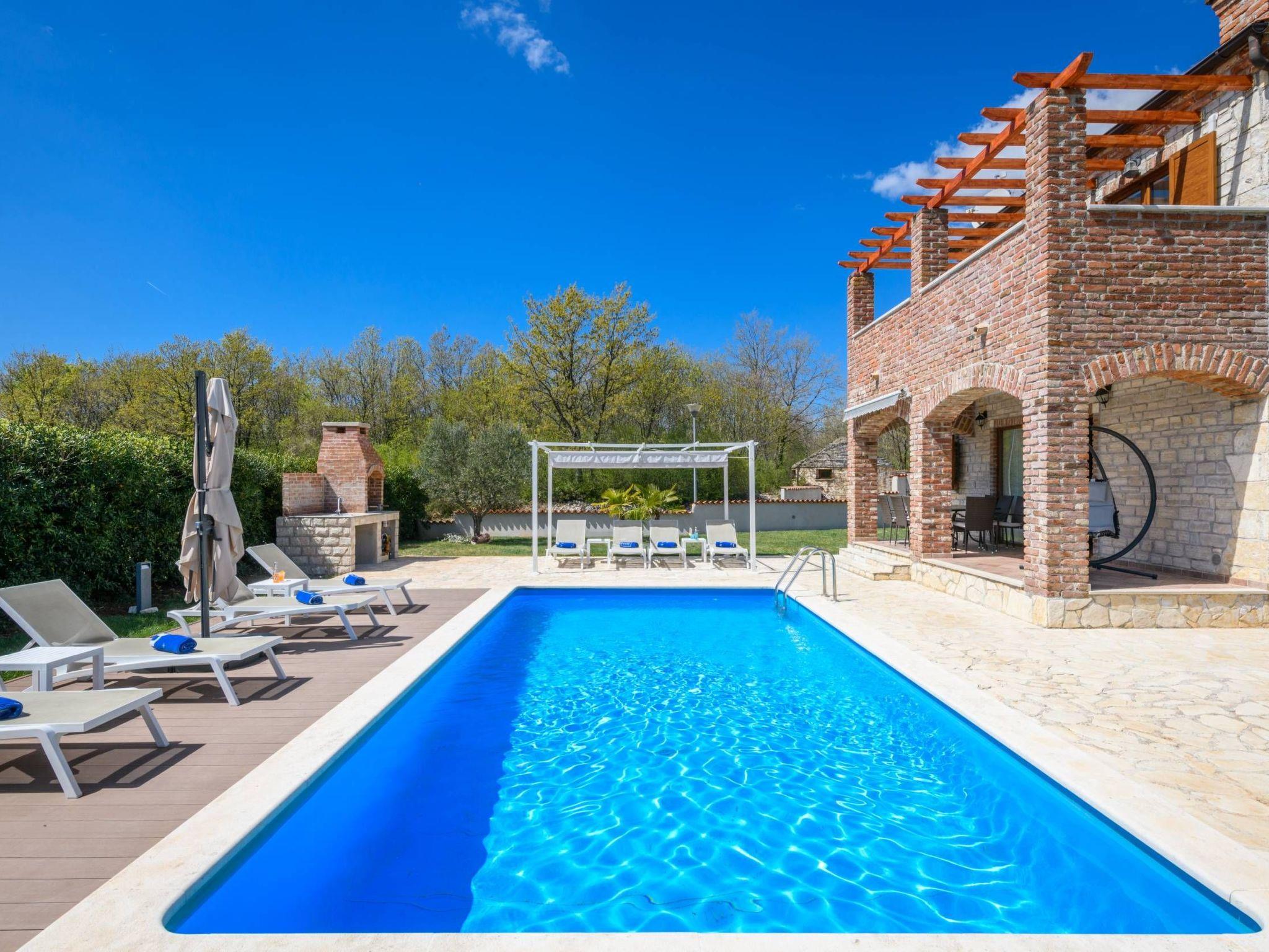 The yard features a pergola, sun umbrella, 8 sun loungers, and a grill.