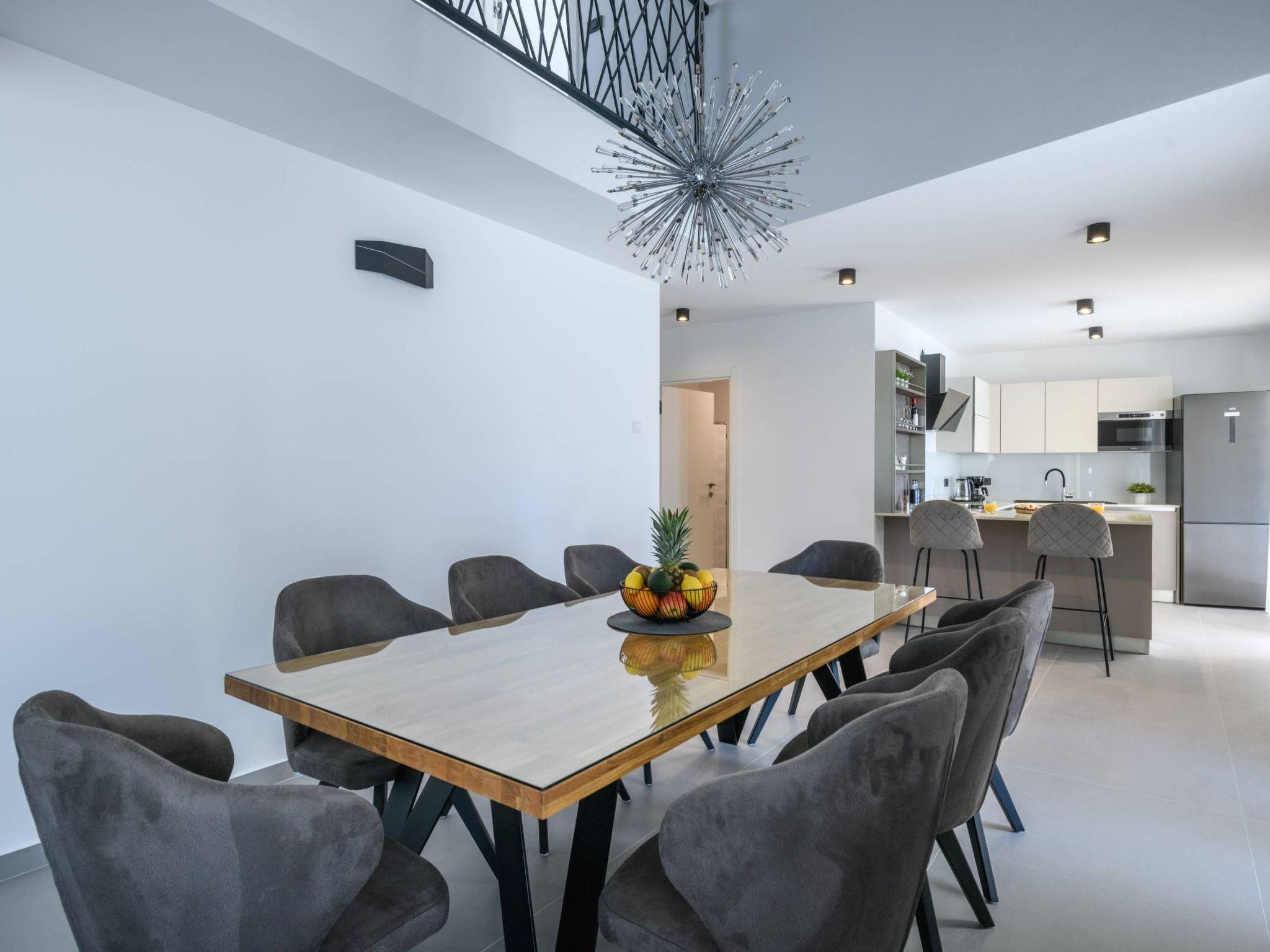 The ground floor has a large living room, fully equipped kitchen, dining table, and one bathroom.