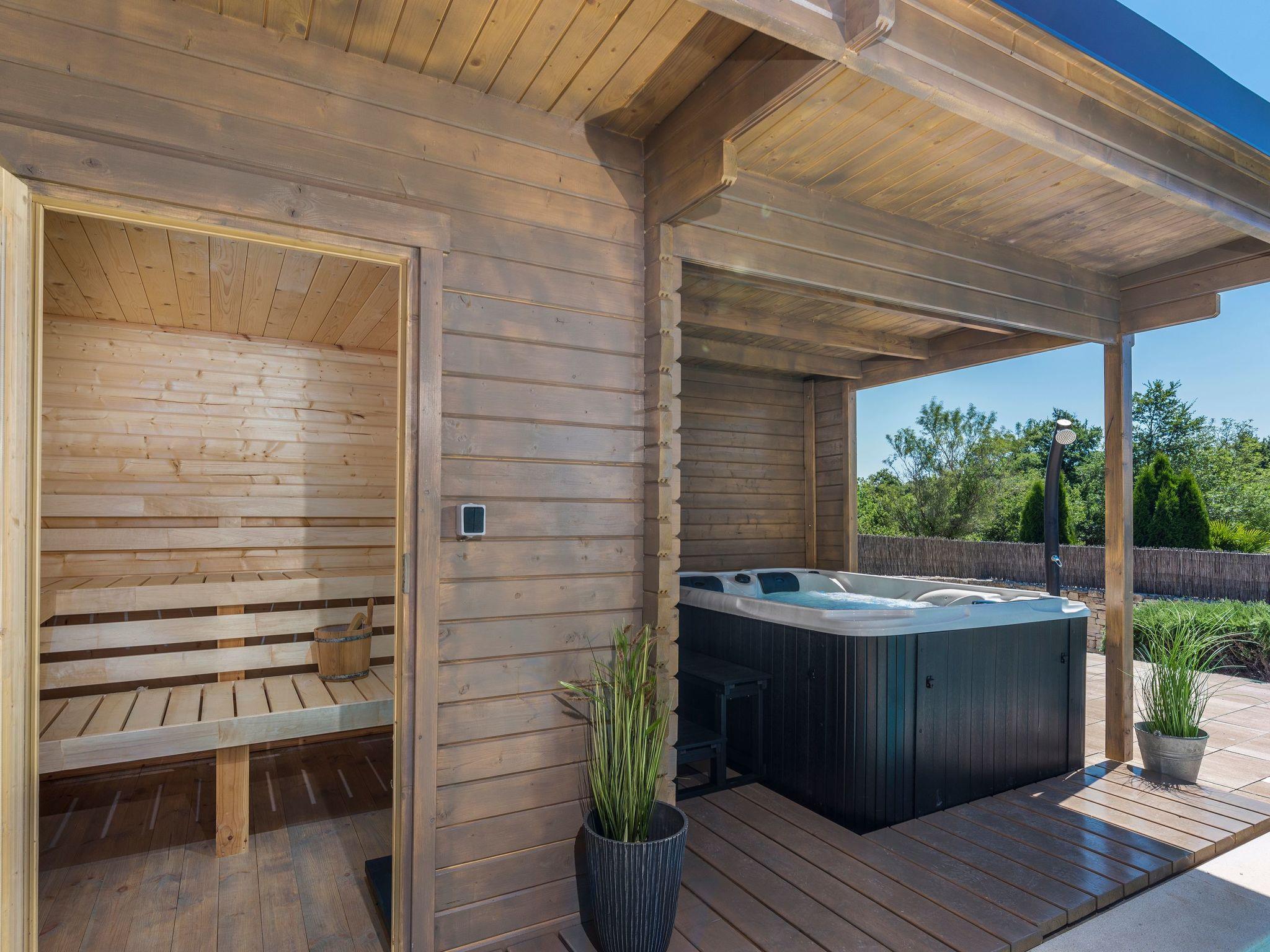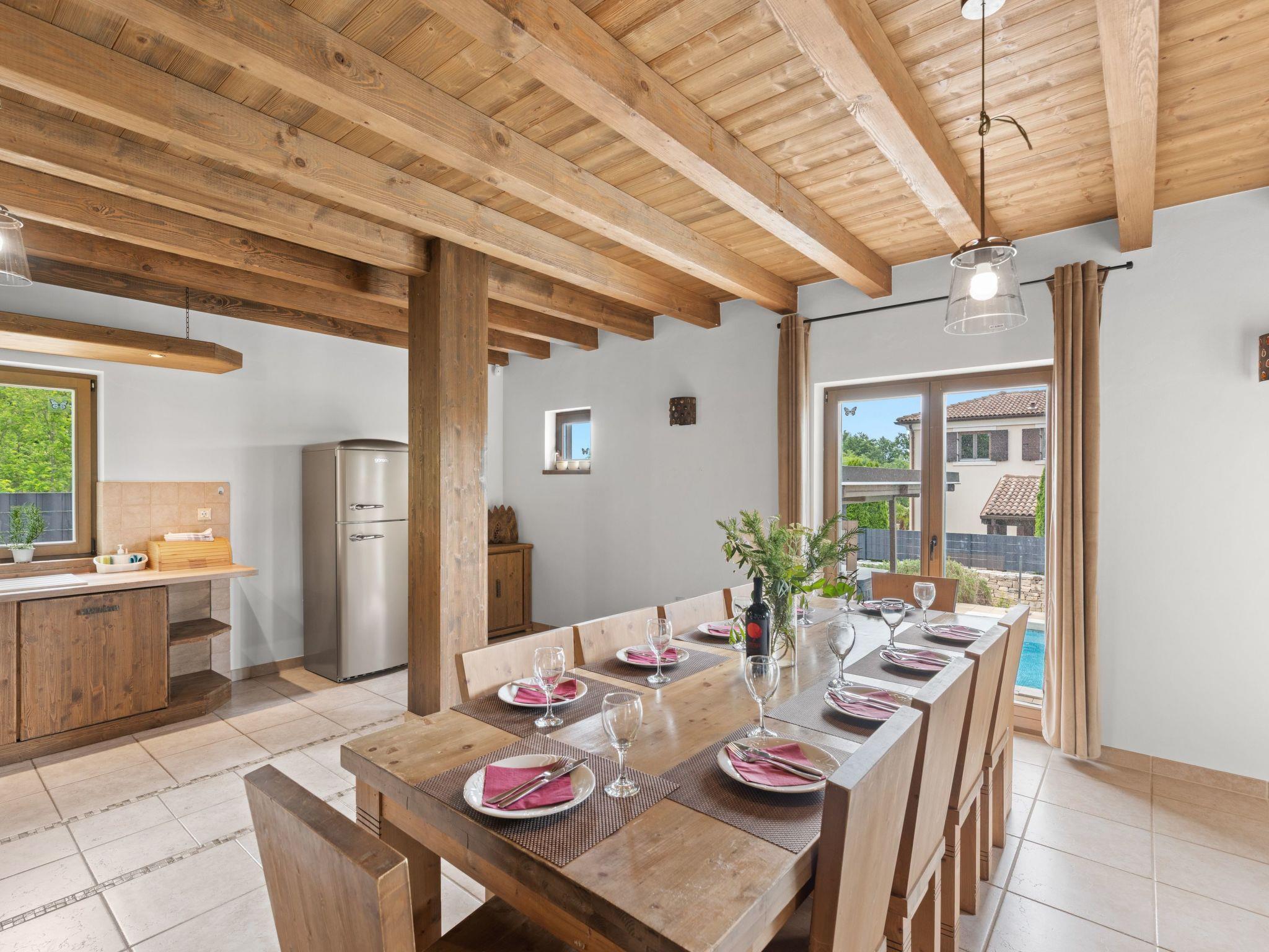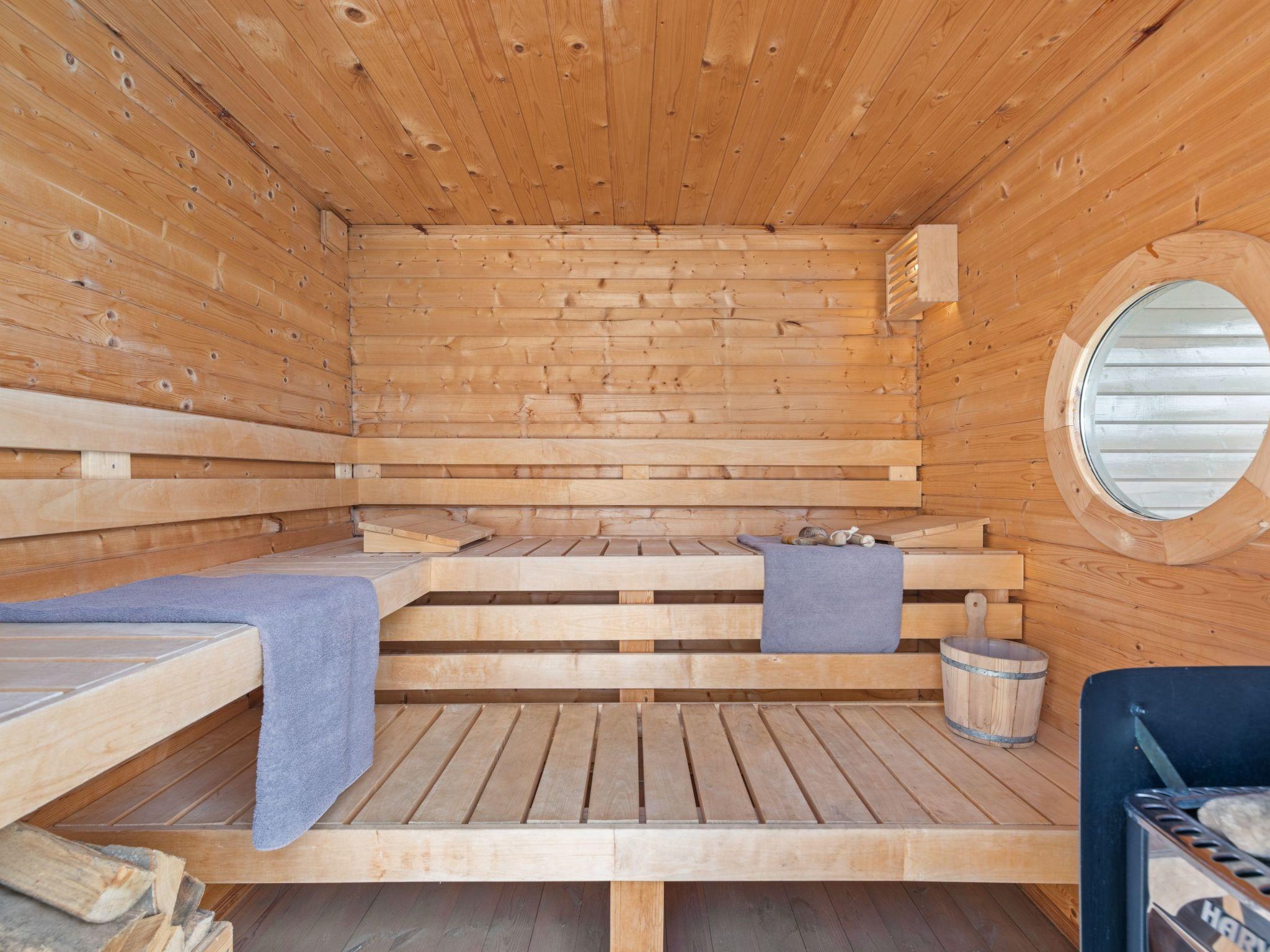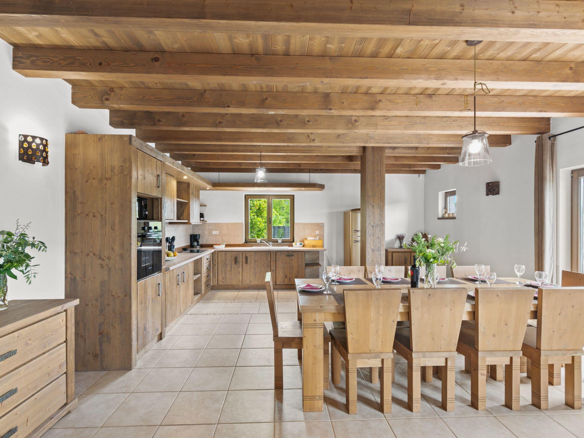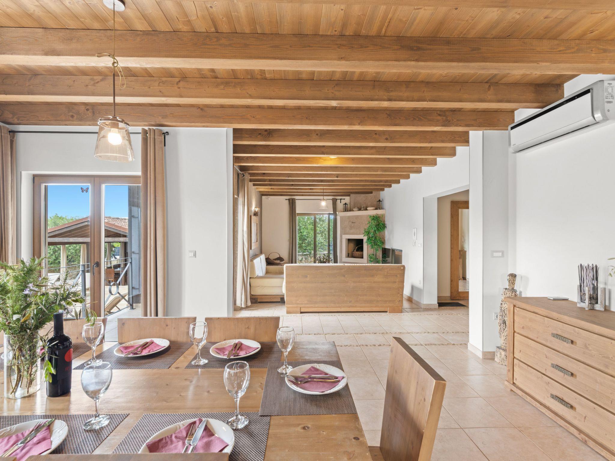 The interior of Villa Dante impresses with an open-plan living area that immediately casts a spell with its charming furnishings. The massive day beds, the tasteful coffee table, an LCD TV and the attractive corner fireplace are just some of the highlights of the living room. The adjoining, generously designed kitchen with modern amenities such as an oven, microwave, ceramic hob, dishwasher and much more, invites you to create culinary masterpieces. The massive dining table seats up to ten people, perfect for enjoying meals together.